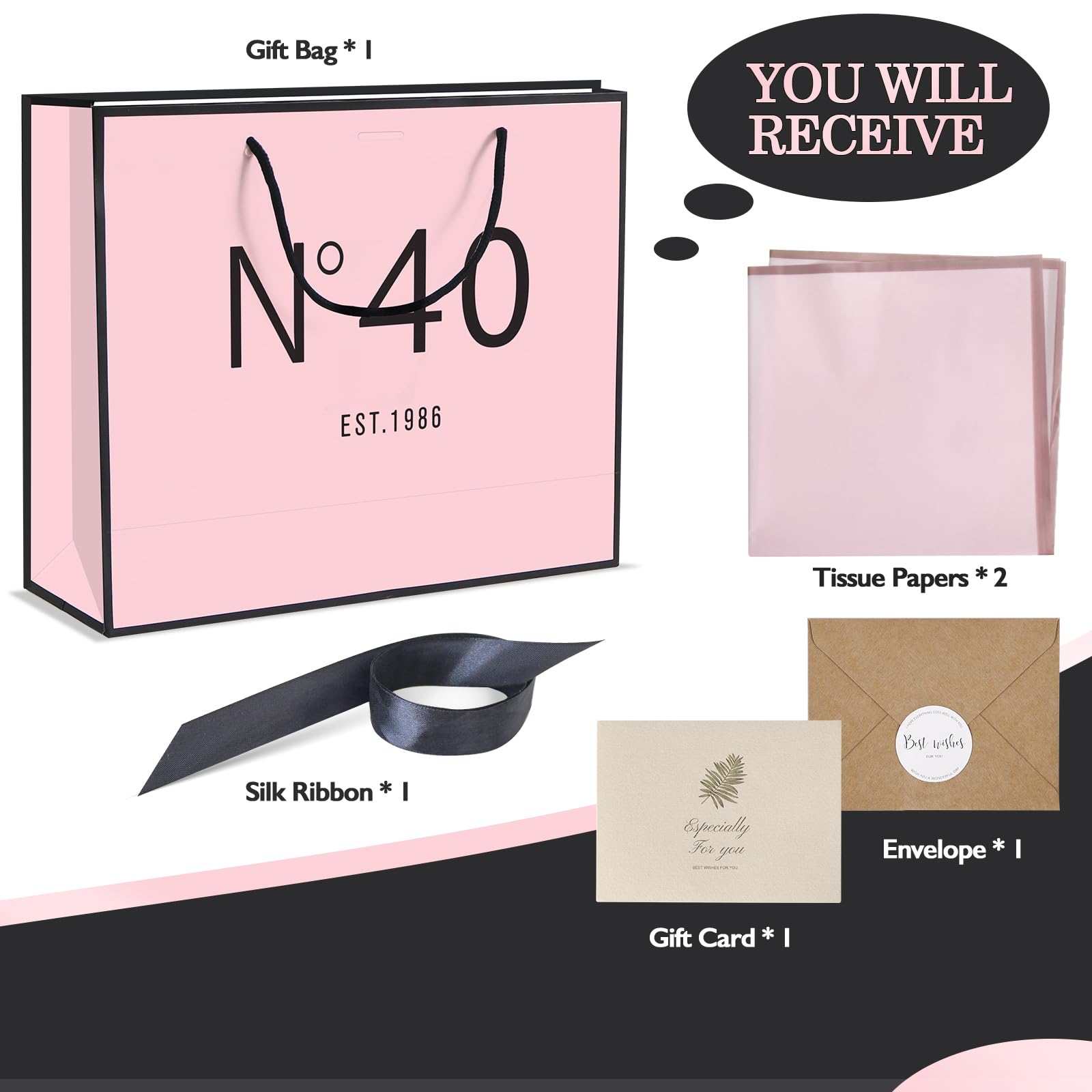 This set includes a gift paper bag with a handle, a bow ribbon, 2 sheets of high-quality waterproof wrapping paper, an envelope, and a greeting card.