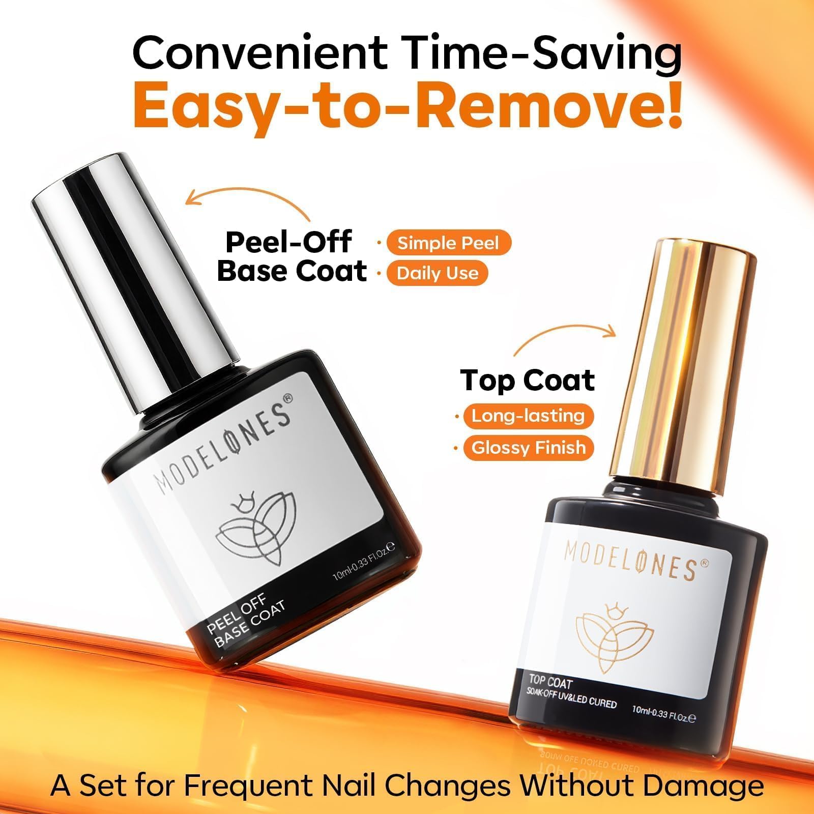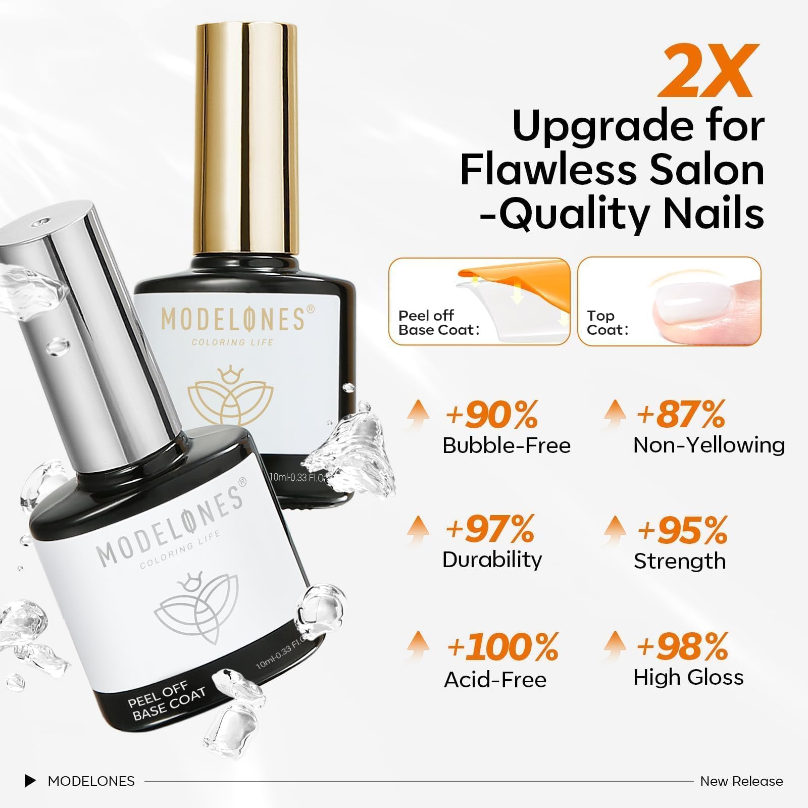 Upgraded Formula Must-haves Set for Nail Art: modelones upgraded manicure essential kit includes 1*10 ml peel-off base coat+ 1*10 ml gel top coat. Delivers a high-gloss, bubble-free finish with lasting durability. Acid-free and non-yellowing to protect and strengthen nails. Ensures chip-resistant wear with brilliant shine day after day