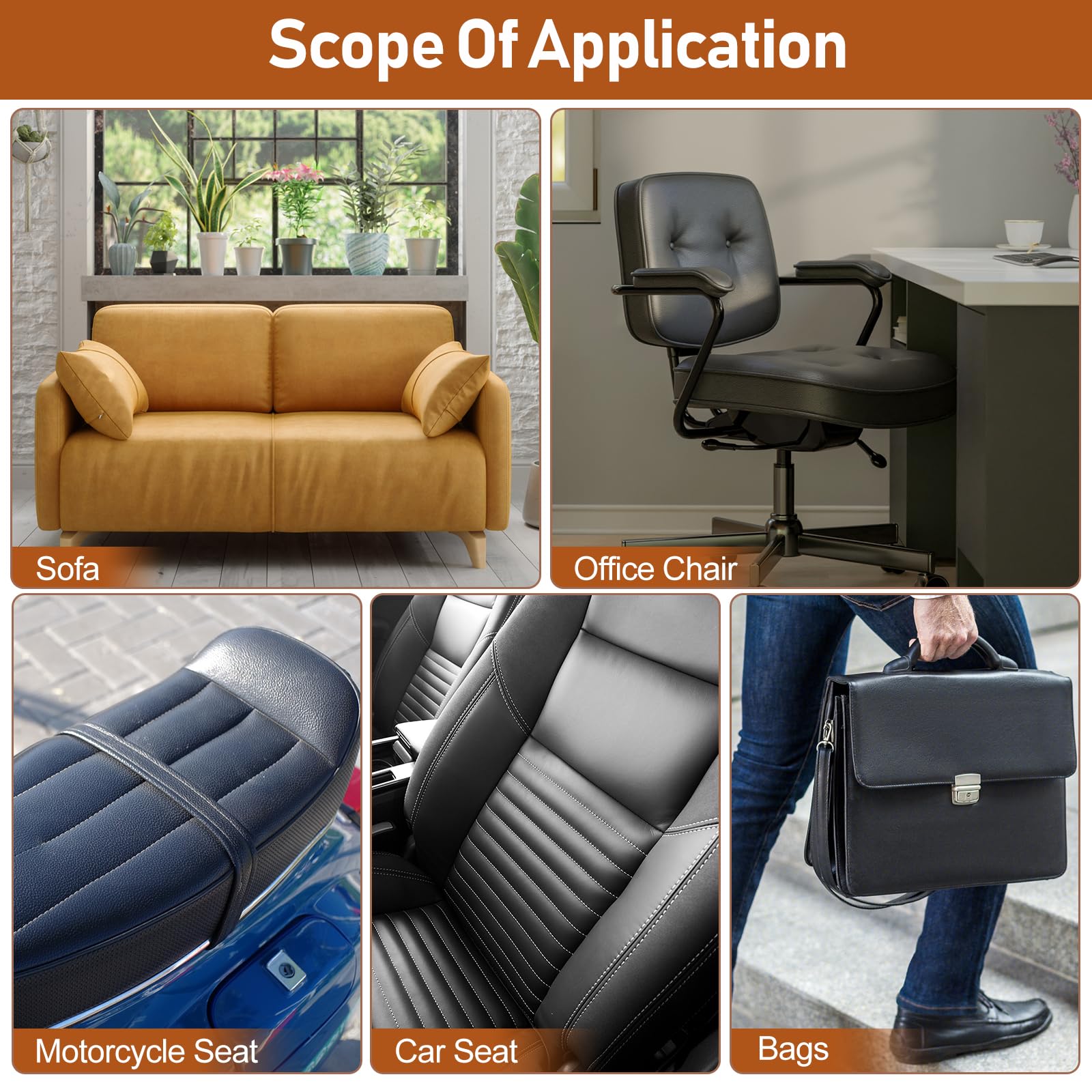 Wide Applicability - Quick Fix Leather Repair patch first aid works perfectly on leather and vinyl products; Applicable for couches,car seats, boat seats, upholstery, recliner,furniture, bags, suitcases, belts, and down jackets;