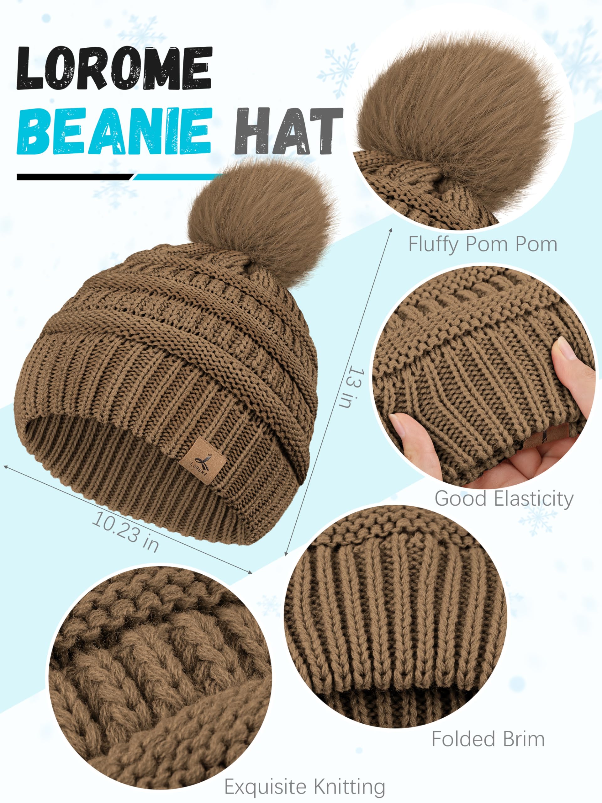Stylish Design - These women hat and gloves set stand out with their inventive knitting tech, plush pom pom on hat, double layered and flanging brim design, fashionable LOROME brand, khaki color, and thick cuff gloves that make touchscreen usage effortless.