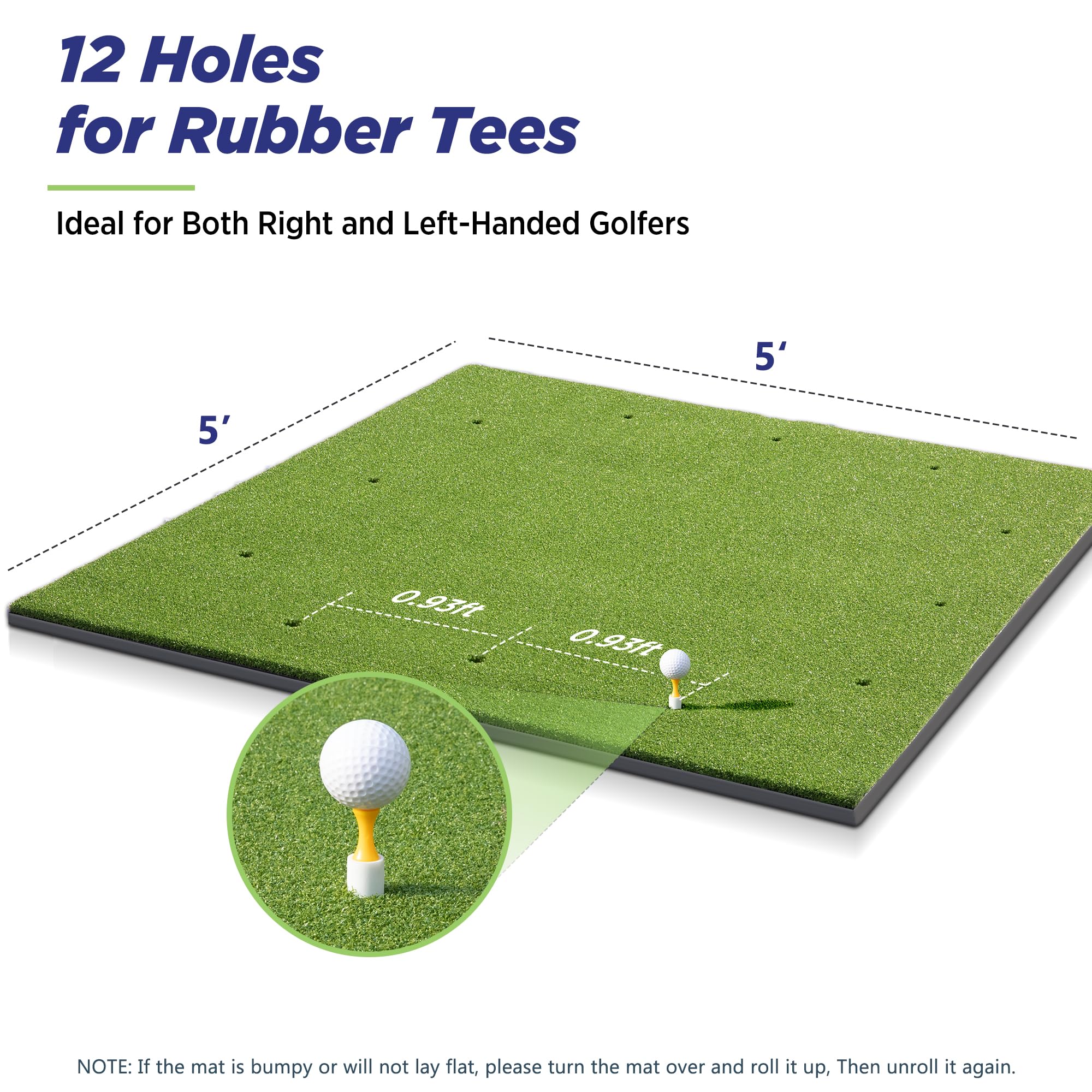 5x5 FT Mat with 9 Teeing Holes: Suitable for both right- and left-handed golfers, this golf training mat offers 9 teeing positions, allowing you to practice with your full set of clubs. The 15mm non-slip foam backing delivers excellent cushioning, reducing the impact of mis-hits. With an extra 15mm of foam thickness, itβs perfect for use on uneven surfaces, ensuring stability & comfort during your practice sessions