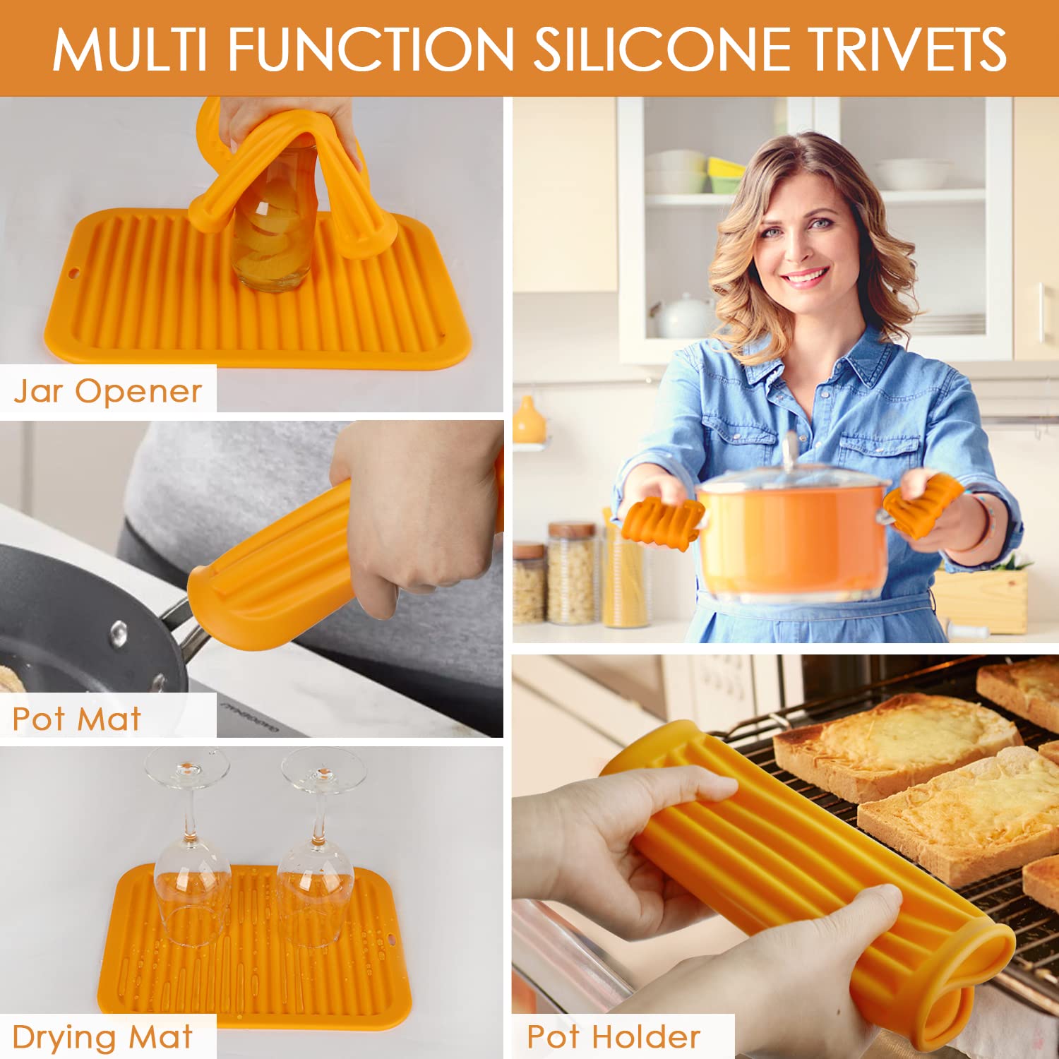 🍳【VERSATILE KITCHEN TRIVETS】: It is perfect as a silicone hot pad or anything in the kitchen that needs a silicone pad. One orange silicone mat replaces at least four kitchen gadgets. We can use the large silicone trivet mat for hot pots as a potholder, hot pot holder, small dish drying mat, silicone placemat, jar opener, coffee maker mat, garlic peeler, or teapot mat for other kitchen utensils.