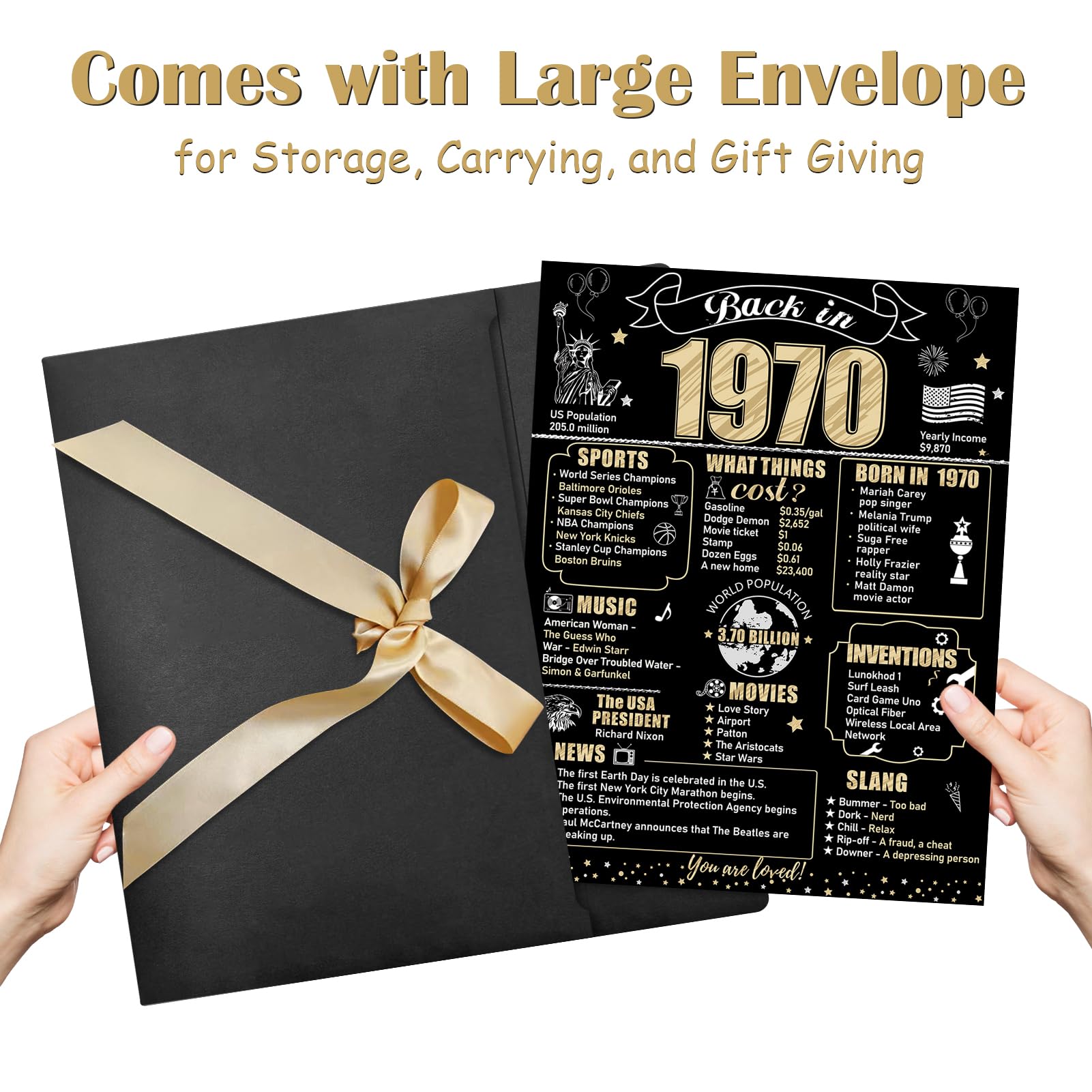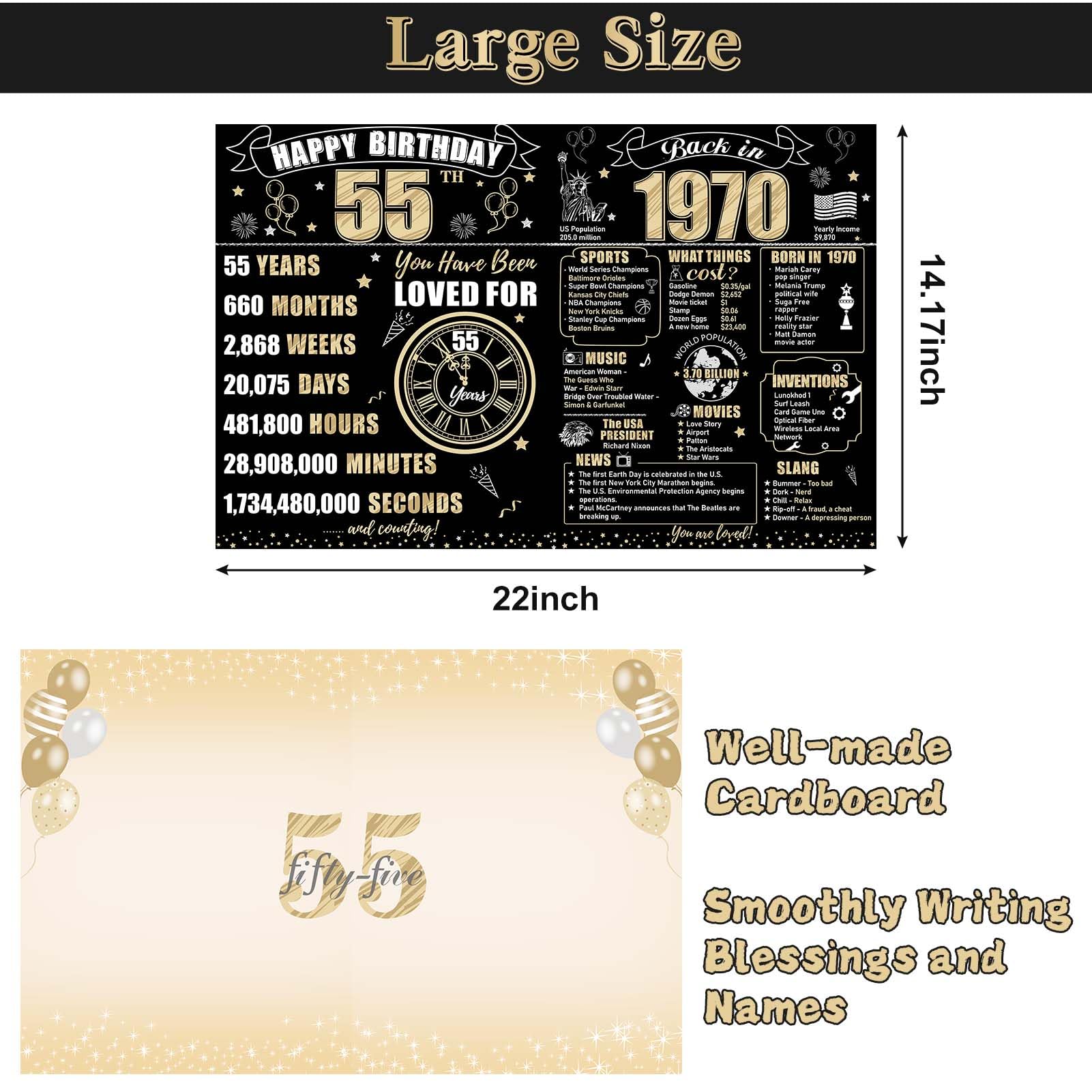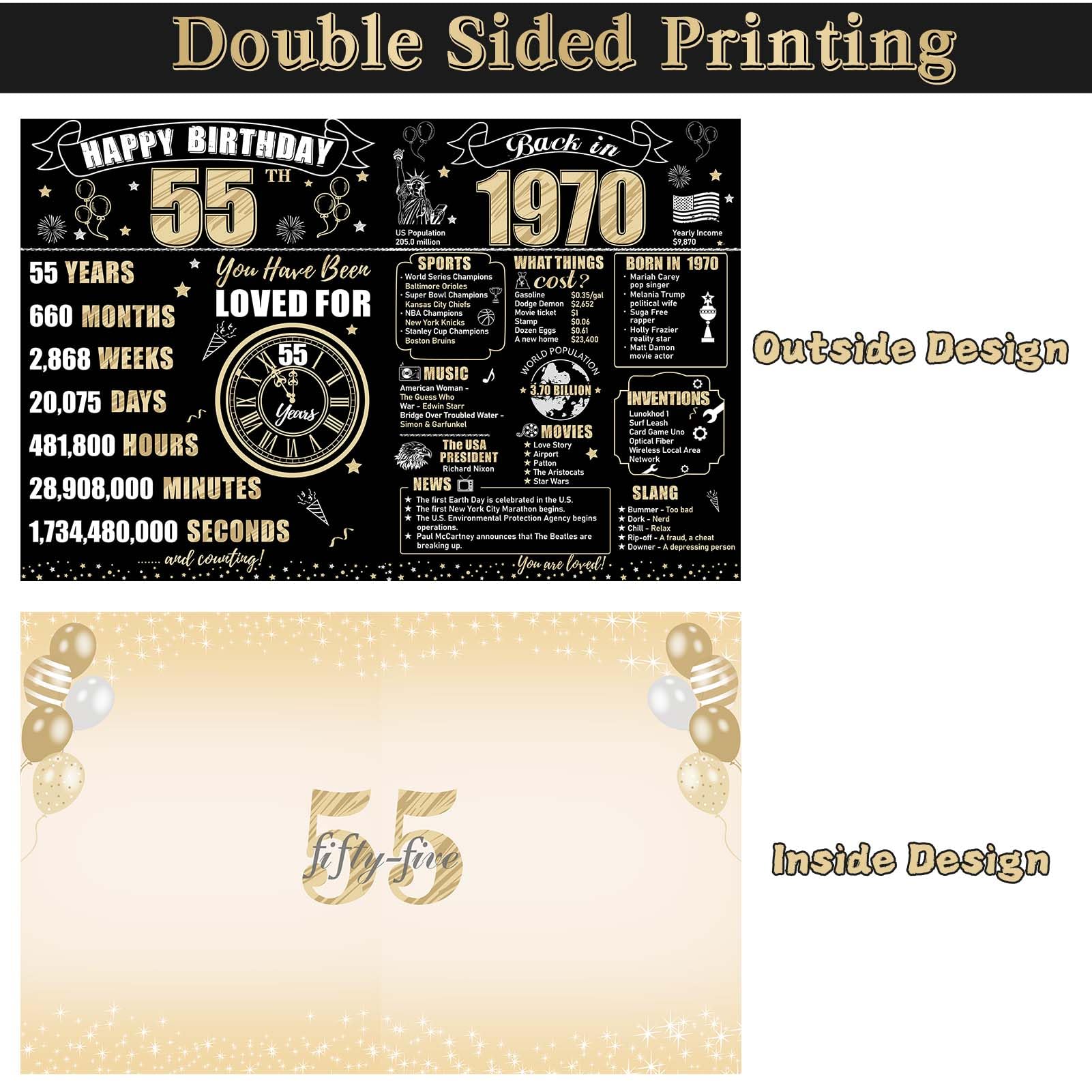 【Vintage 1970 55th birthday themed design】The double-sided design incorporates black and gold tones, featuring birthday elements like balloons and fireworks, commemorating significant events from 1970. It is both interesting and meaningful