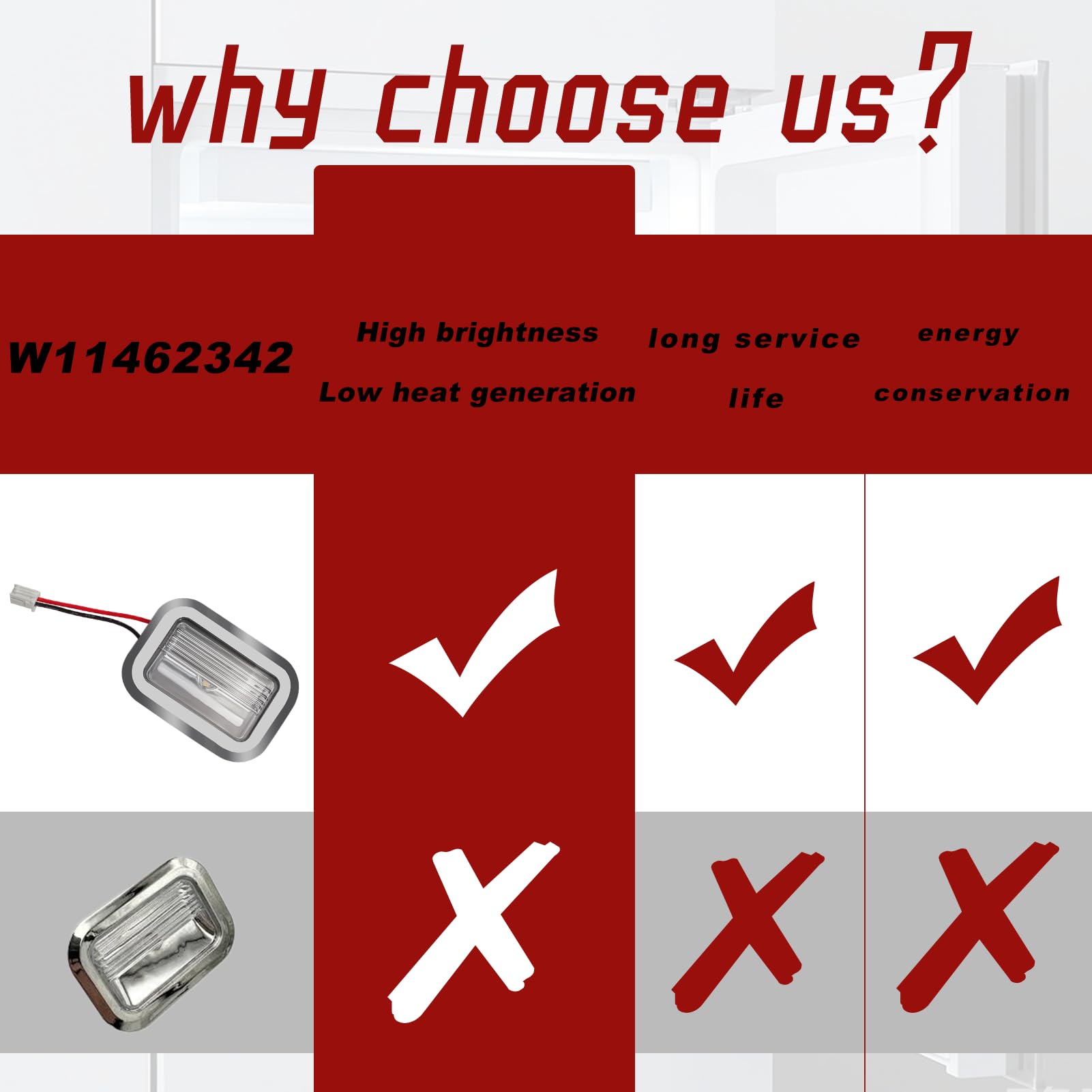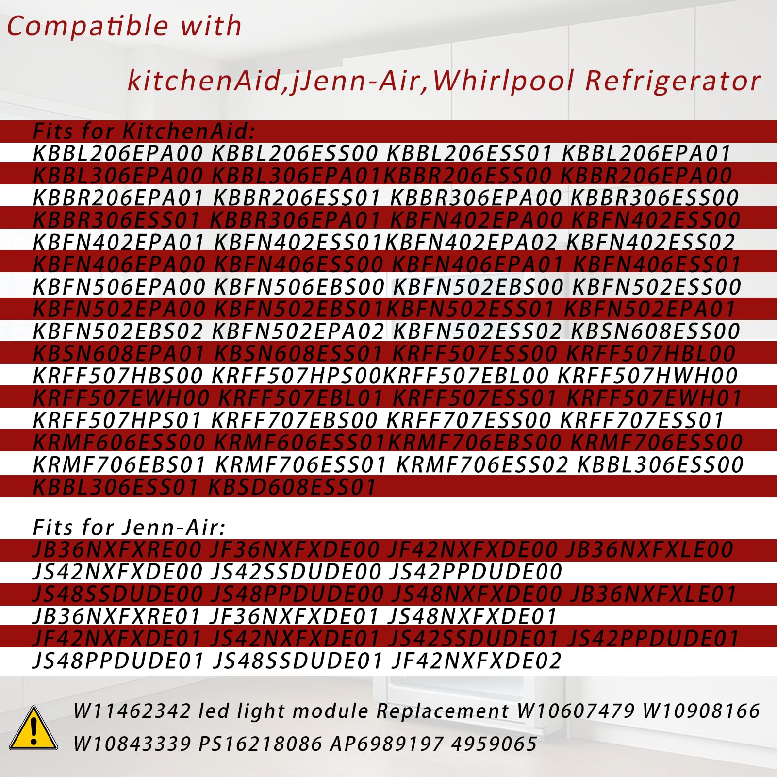 Direct Replacement:W11462342 led light module replace W10607479 W10908166 W10843339 PS16218086 AP6989197 4959065 Replacement LED light module used for some Jenn-Air, KitchenAid, and Whirlpool refrigerator models