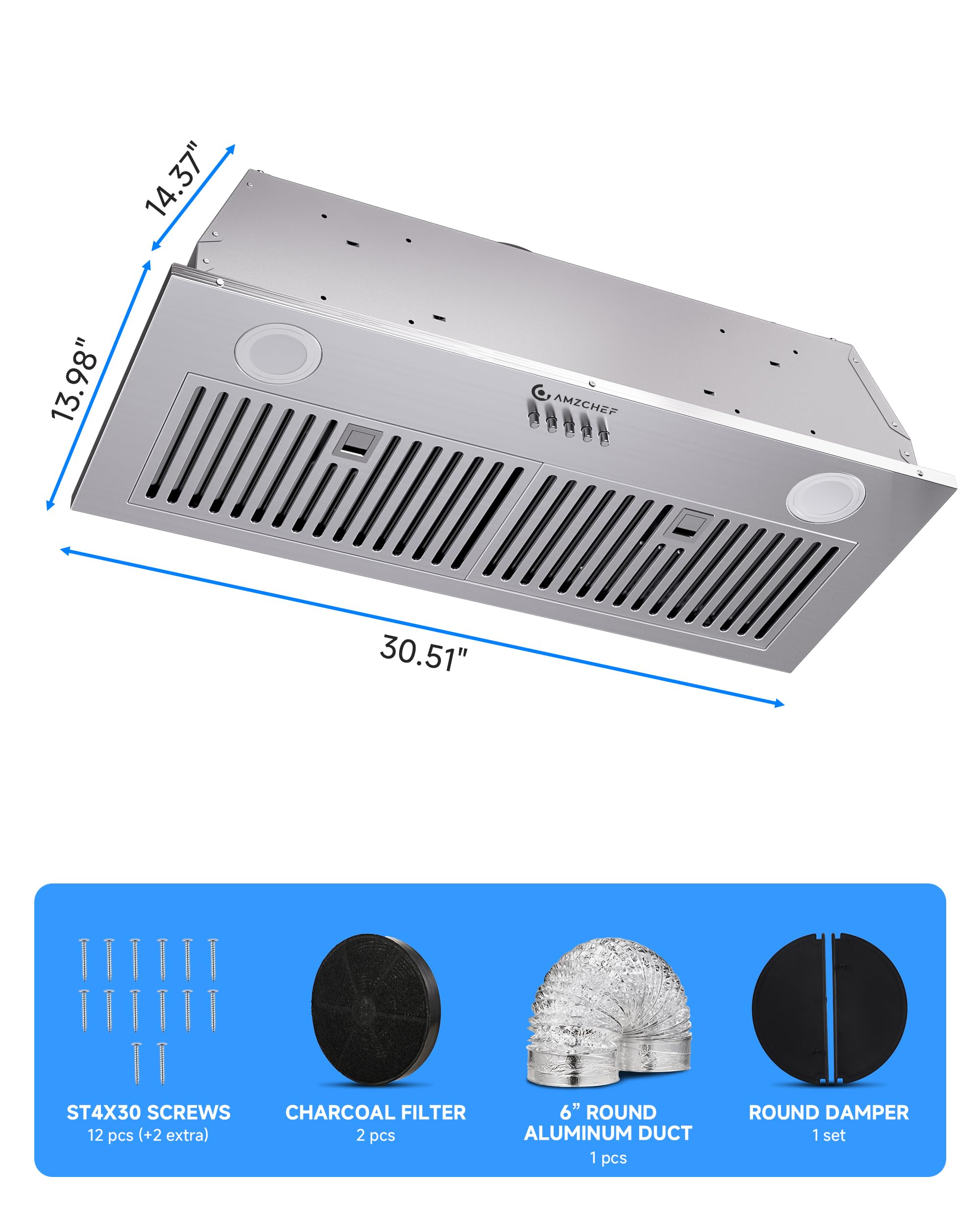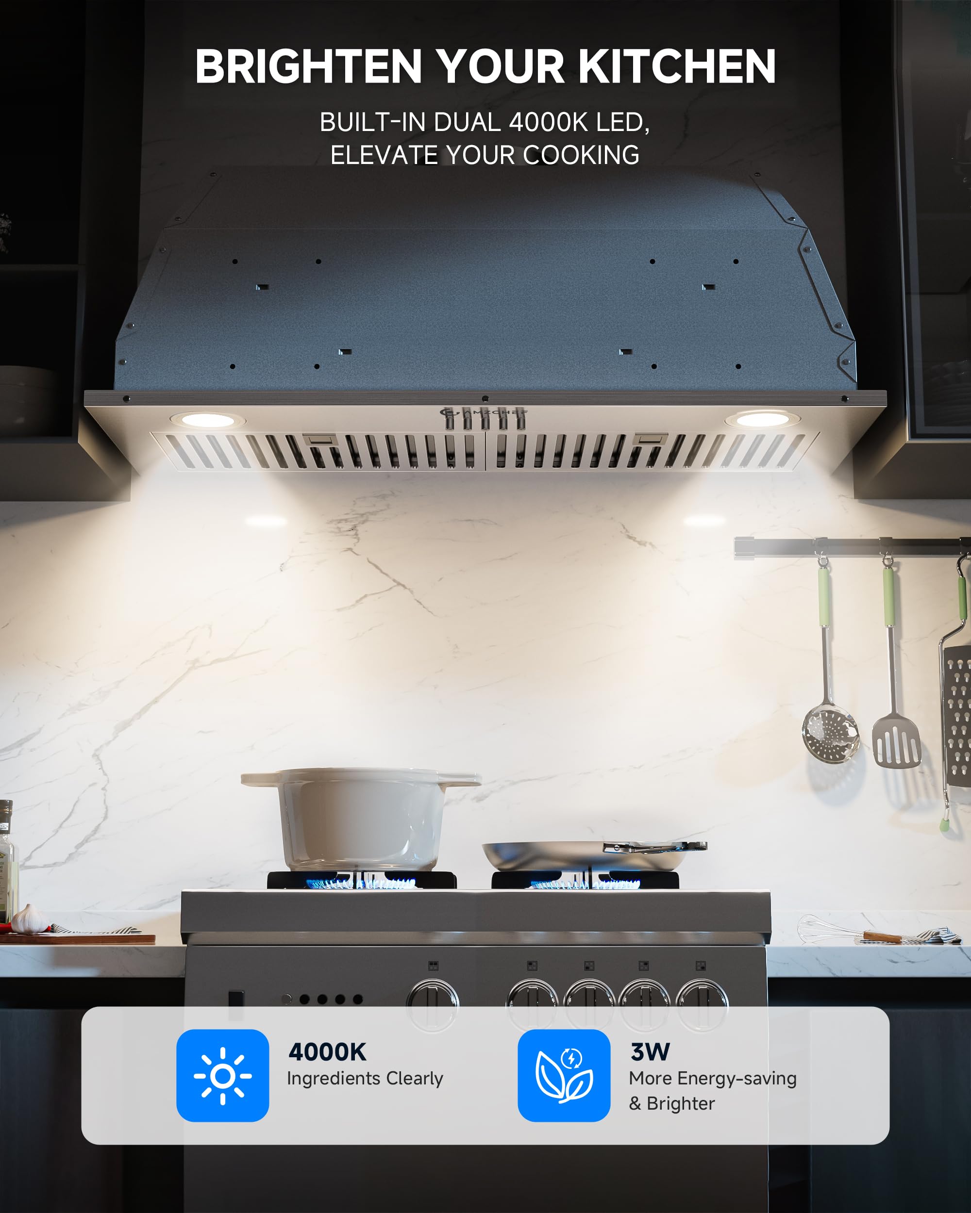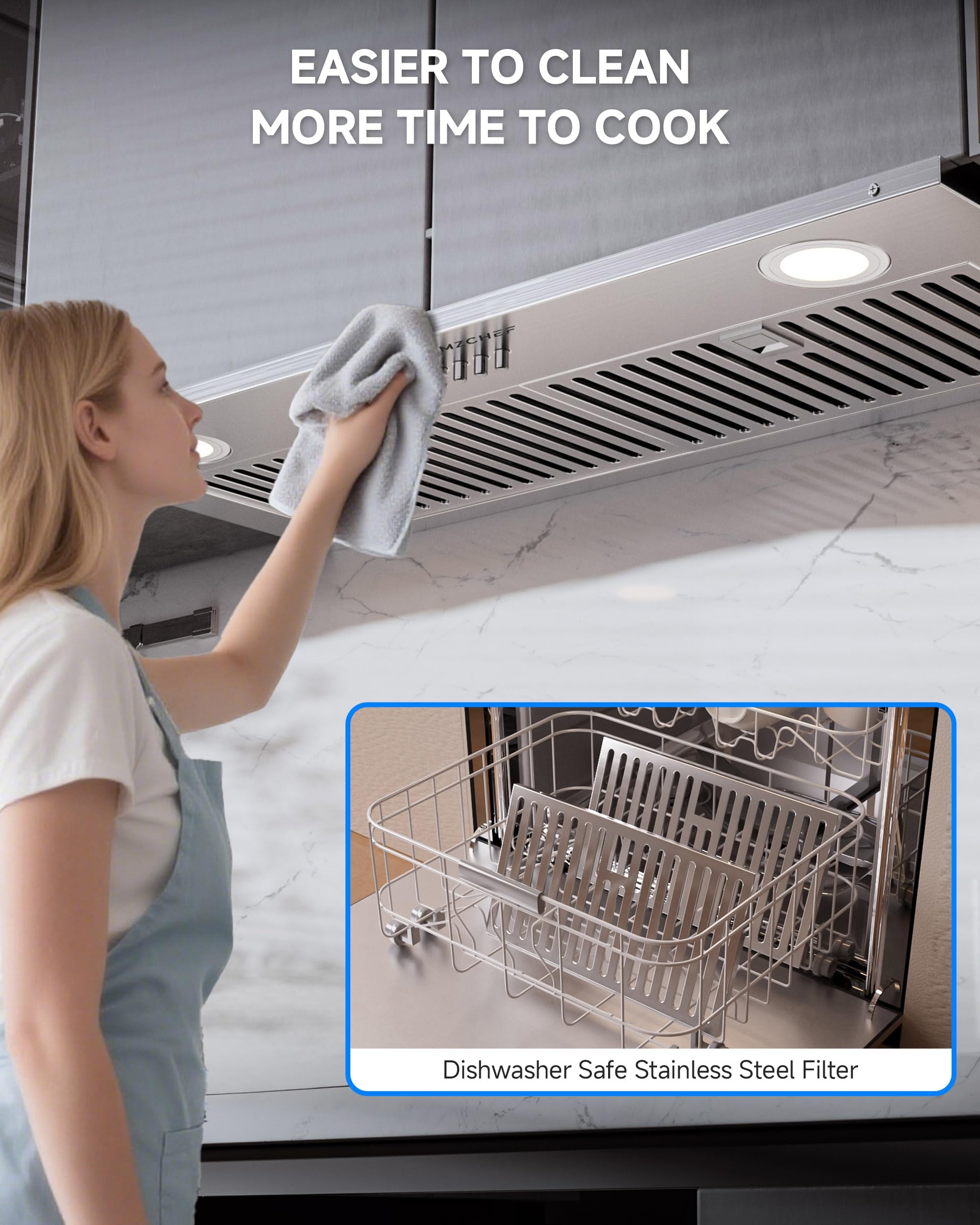 Dual-Layer Defense:Experience superior filtration with our 30 inch range hood.Double-layer system tackles grease & smoke: 2 detachable stainless steel filters efficiently trap oil and grease. Plus, premium activated carbon filters absorb harmful particles and neutralize odors. Result? Significantly cleaner kitchen air for your family. Maintenance is effortless: stainless steel filters are dishwasher-safe and designed for lifetime reuse. Powerful protection, simple upkeep
