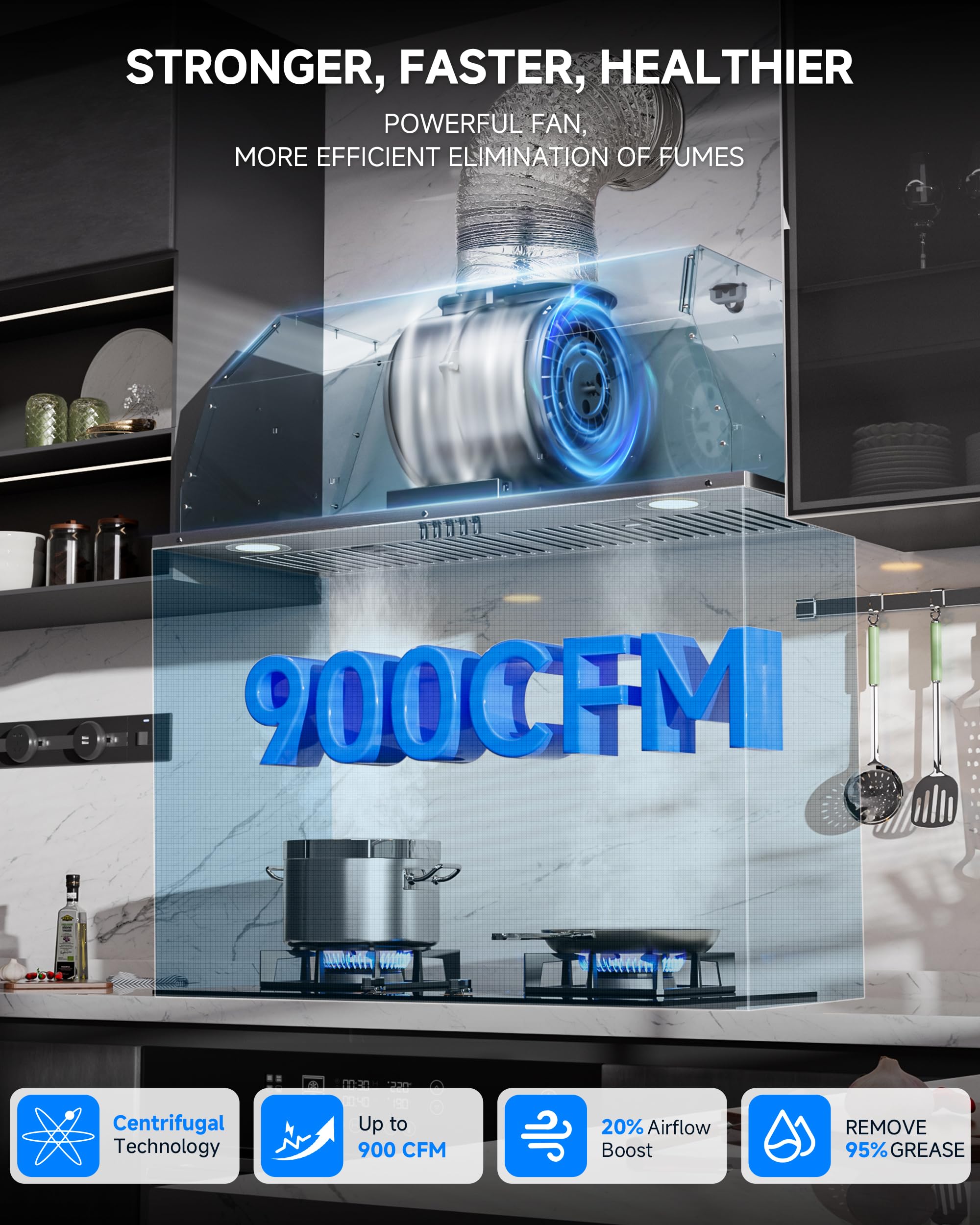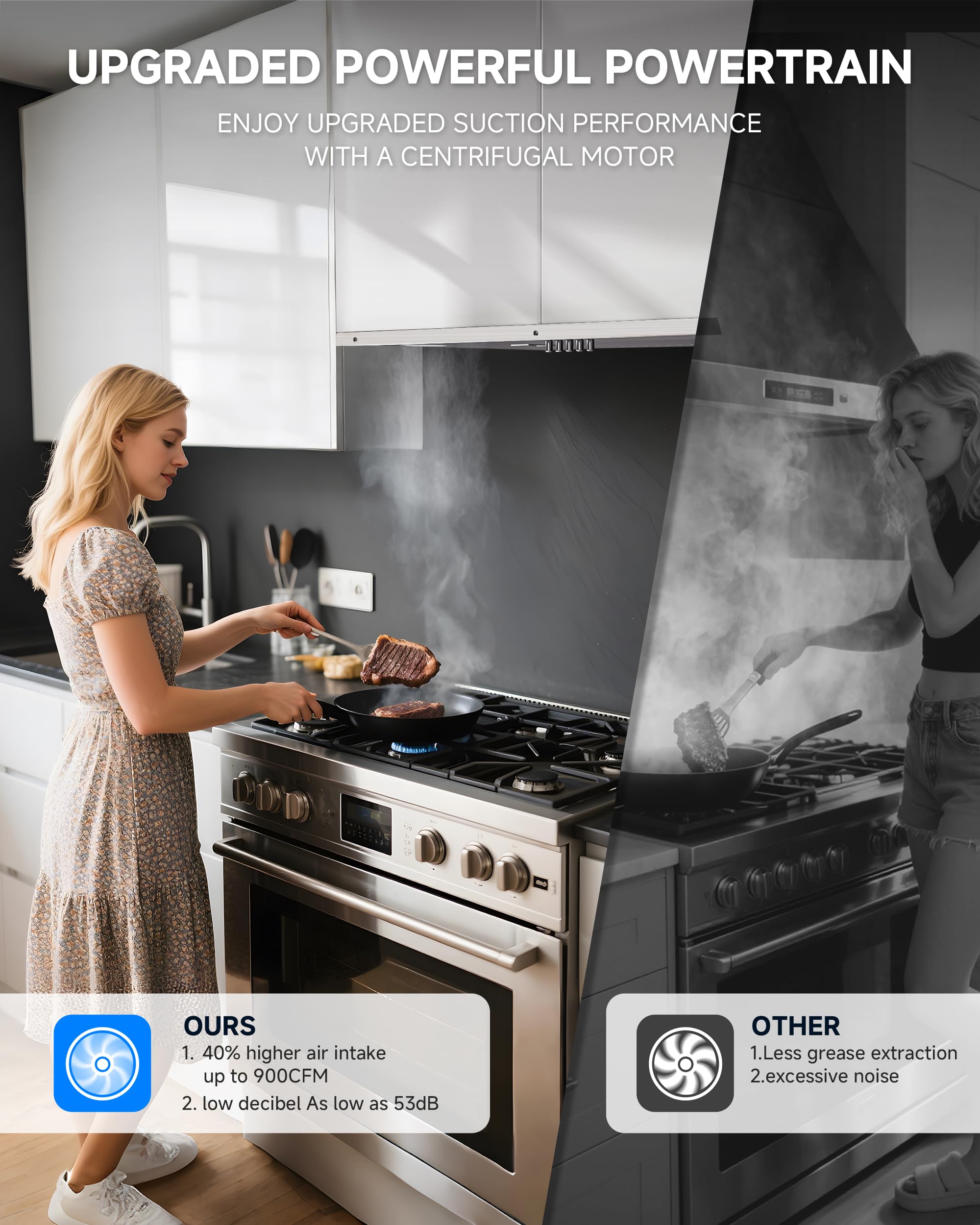 Power Meets Quiet:Crush heavy grease & odors instantly with 900CFM suction. Breathe clean air! Yet, cook in remarkable peace: runs at only 62dB max – quieter than conversation! Durable, rustproof stainless steel build. Serious power meets library-level quiet. Transform cooking: clean, peaceful & comfortable. Power & Silence Perfected!