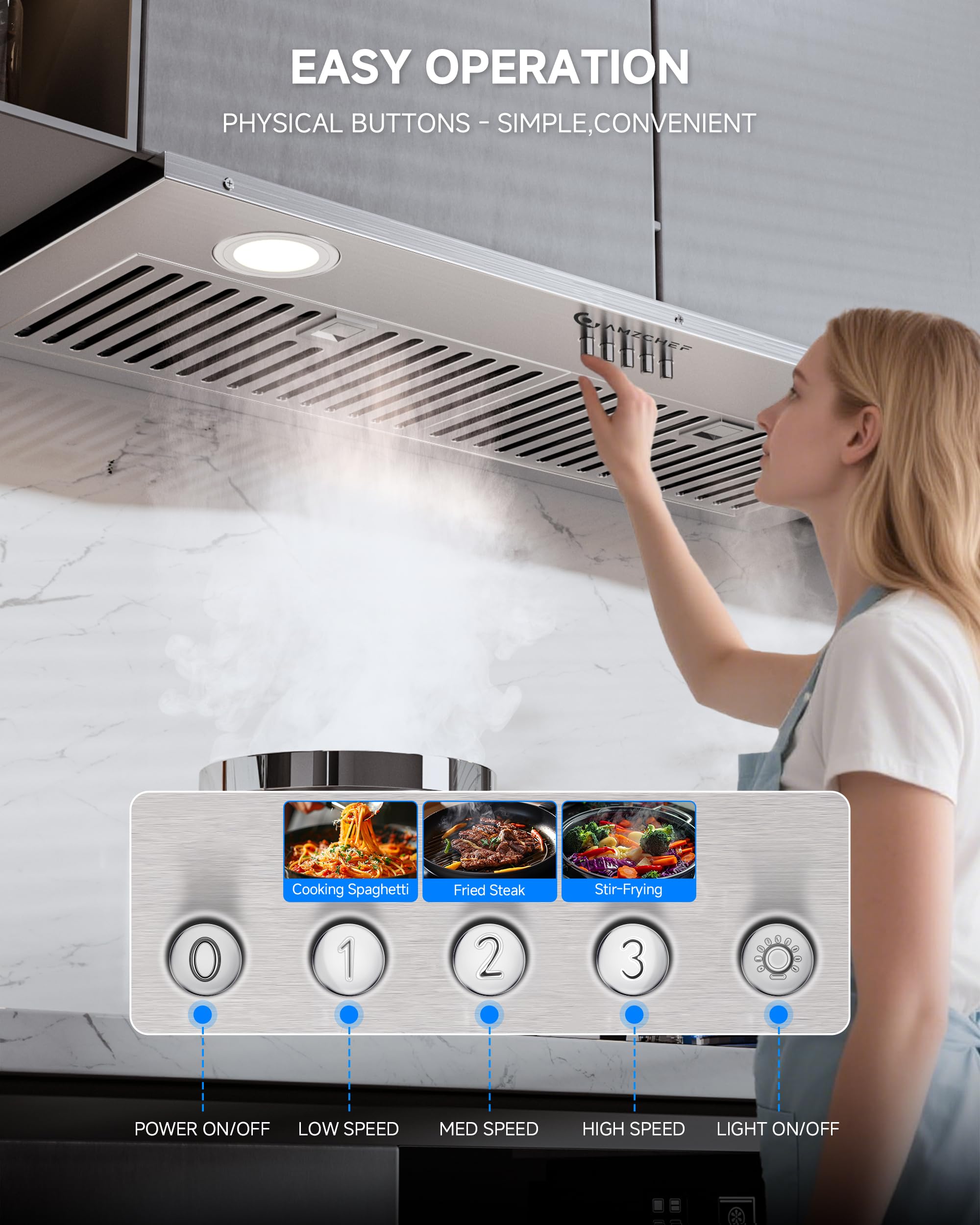 Operate your range hood intuitively:Tap dedicated buttons to instantly adjust fan speed (Low/Med/High) for any cooking task. One-touch LED light button conveniently powers the bright task lighting on or off. No complex menus, just simple, reliable push-button operation. Designed for quick, hassle-free use every time.