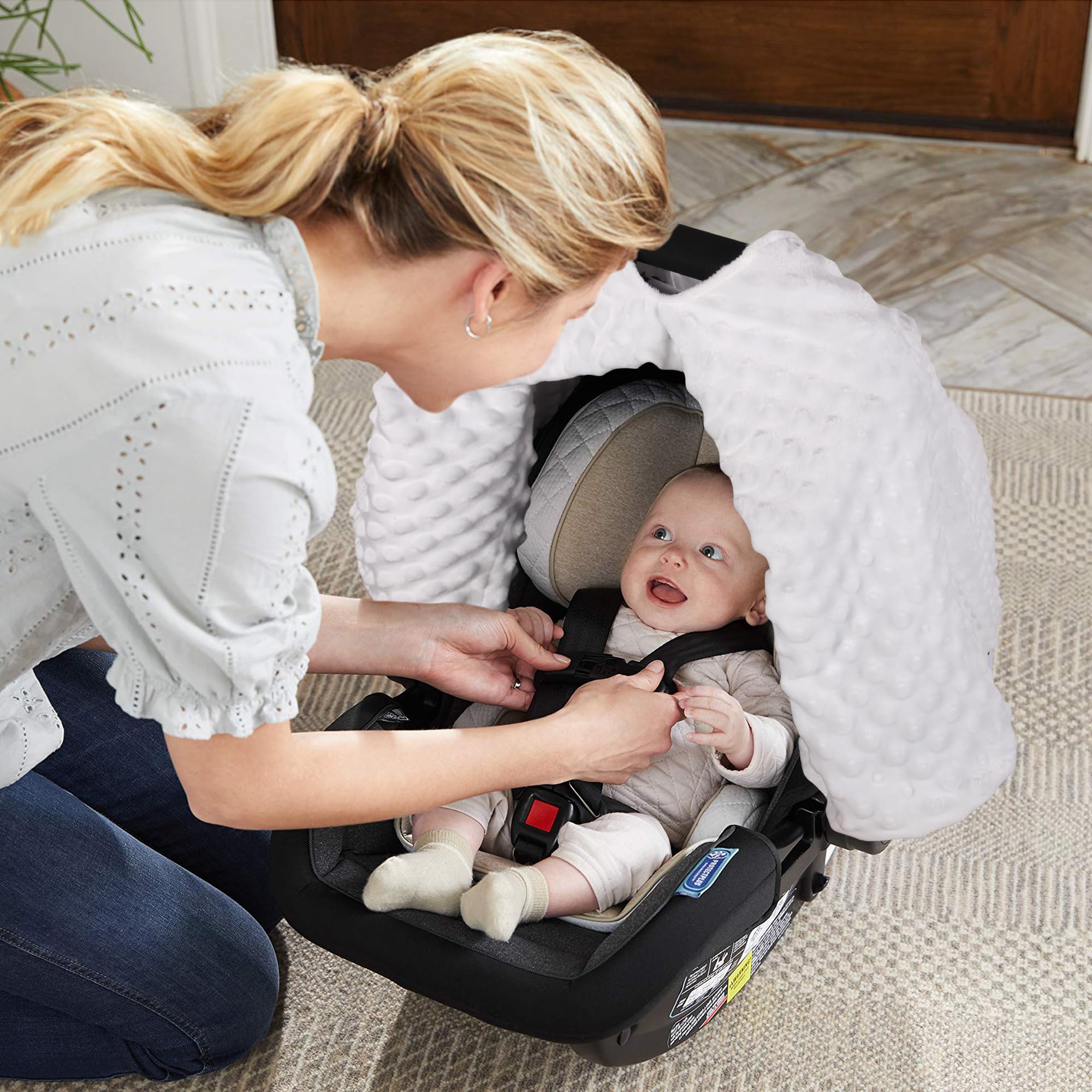 EASY TO USE: The durable Velcro straps are positioned on the carseat canopy for the ability to secure to baby carrier handle quickly. It's easily install and remove. Extra large universal size to fit all multiple brands of infant car seats or strollers