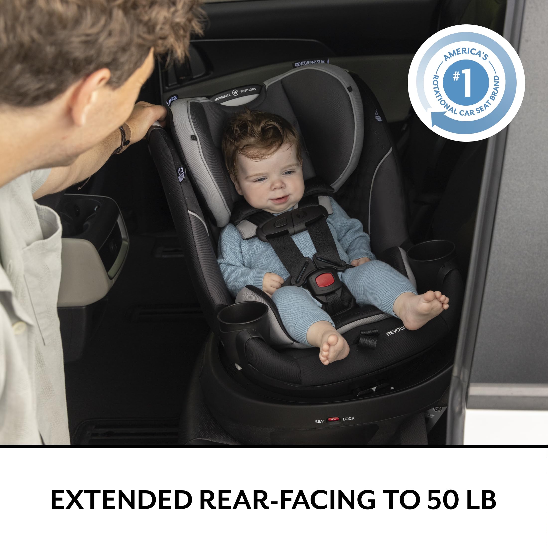 Got a compact vehicle and a little one on the way? Check out the Evenflo® Gold Revolve360™ Slim 2-in-1 Rotational Car Seat with SensorSafe™! We slimmed the exterior of our revolutionary car seat to create a 16.7 in. footprint without sacrificing your child’s seating space or safety. You can fit more of what you love into your backseat with more room for passengers and your growing family! A spin-off of the Revolve360, America’s bestselling rotational car seat, the Revolve360 Slim offers one-hand, 360° rotation in all modes, making it easier to get your child in and out of the car. But 360° rotating is just the beginning. The Revolve360 Slim offers two modes: rear-facing (4 lb to 50 lb, for a child measuring from 17 in. to 48 in) and forward-facing (22 lb to 65 lb, for a child measuring 28 in. to 49 in.). For peace of mind all the way around, this slim fit car seat offers the extended security of rear-facing all the way up to 50 lb. Child safety experts say the longer your child remains rear-facing, the better. Convenience comes full circle in a rotating car seat you can install just once for rear-facing and forward-facing, with no need to uninstall your car seat in order to make the switch. You’re looking for a safe convertible car seat — and the smart car seat choice is a connected car seat. With SensorSafe to connect you to your little one from the backseat, the Evenflo Gold Revolve360 Slim is clearly the gold standard when it comes to safety. While your eyes are focused on the road, integrated SensorSafe technology alerts you in real-time to four potentially unsafe conditions from your child’s slim fit car seat via your phone: unexpected chest clip unbuckling, temperature too hot or too cold in the car, child unattended in the car, and child seated too long. Sure360™ Safety Installation System with LockStrong™ and Tether360™, plus a handy bead-level indicator for leveling in seconds, make one-time installation safe, secure and simple. The best swivel car seat is one that’s easy to live with! On-the-go recline means you can adjust the car seat to the ideal angle without having to reinstall the car seat or bother your child. Offering good looks and ease at every turn, the Evenflo Gold Revolve360 Slim features our most sophisticated fabrics and elevated touches to complement your bold moves in style. Discover the new spin on Slim! At Evenflo, we go above and beyond government standards to create car seats that are safe. The Evenflo Gold Revolve360 Slim meets or exceeds all applicable federal safety standards. It is structural integrity tested at energy levels approximately 2x the federal crash test standard, and it is side-impact tested, rollover tested and temperature tested. It's been 100 years and Evenflo continues to push the boundaries in baby and children’s gear design and innovation. We meet the needs of new generations of parents by focusing on what they really care about: leading-edge safety, smart design and technology, and convenient features that help them enjoy the journey of parenthood. Evenflo is America’s #1 Rotational Car Seat Brand *Source: Circana, LLC, Retail Tracking Service, Juvenile Products, Car Seats, Rotating Car Seats, Dollar & Unit Sales, Jan 2022 – May 2025