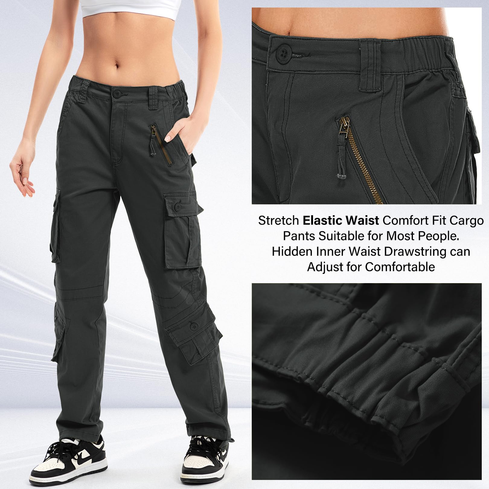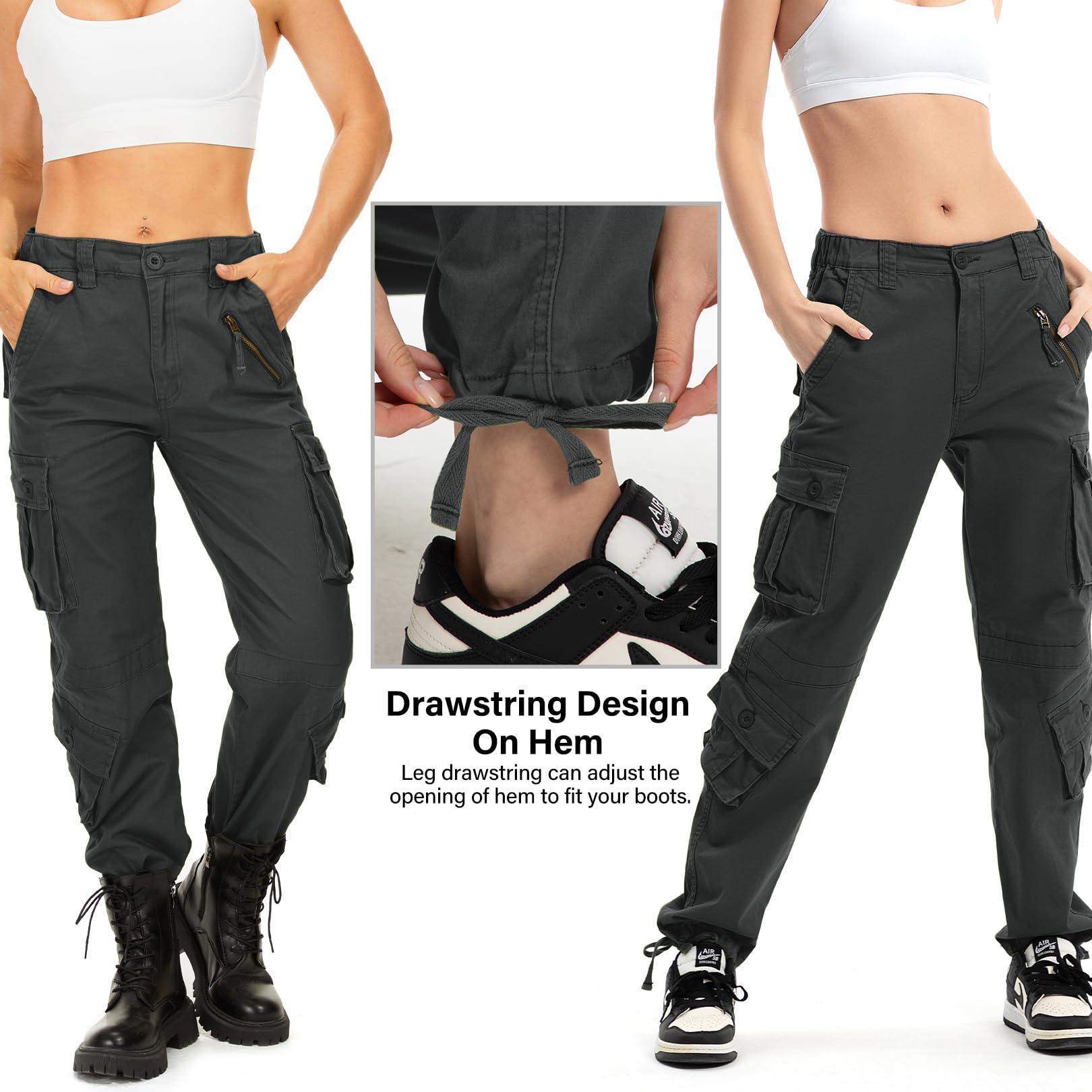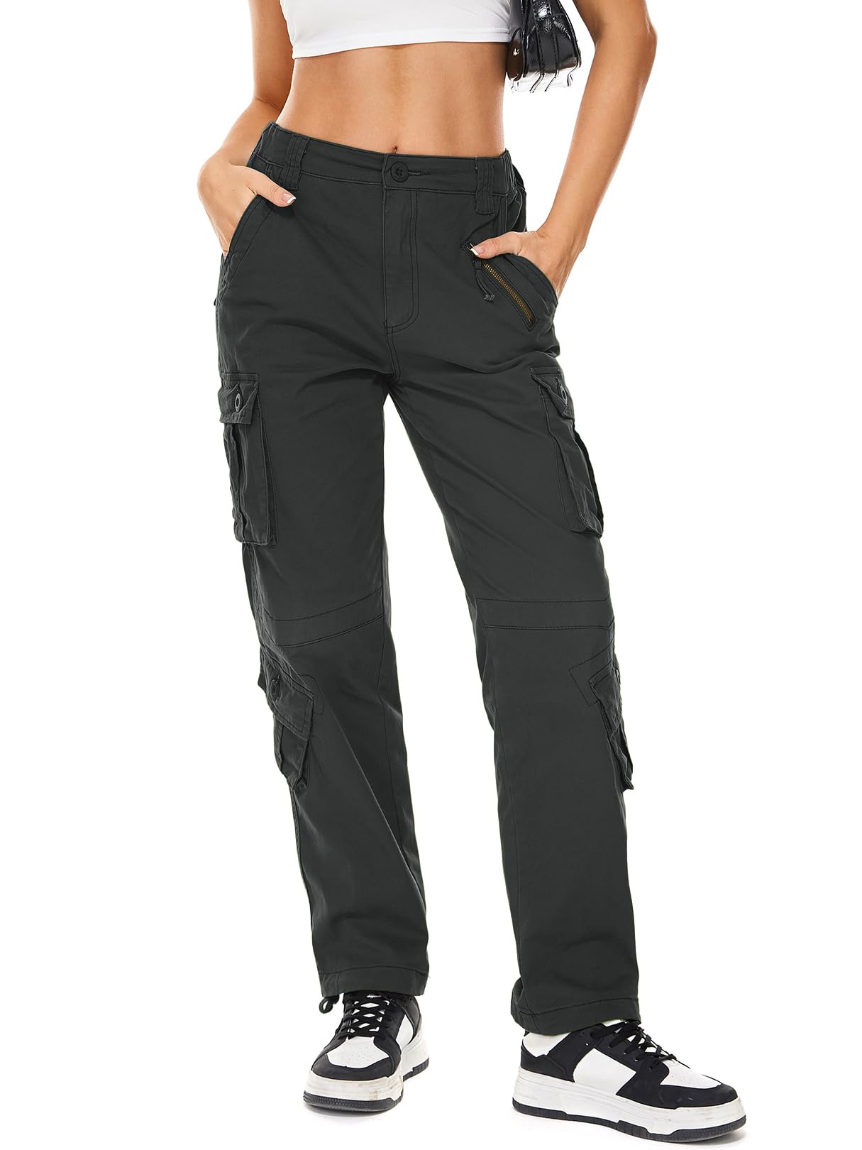 These cool girl style cargo pants can be paired with crop tops, basis T-shirts, cool jackets, casual hoodies, high heels, sneakers, etc. for spring, summer, fall and winter.
