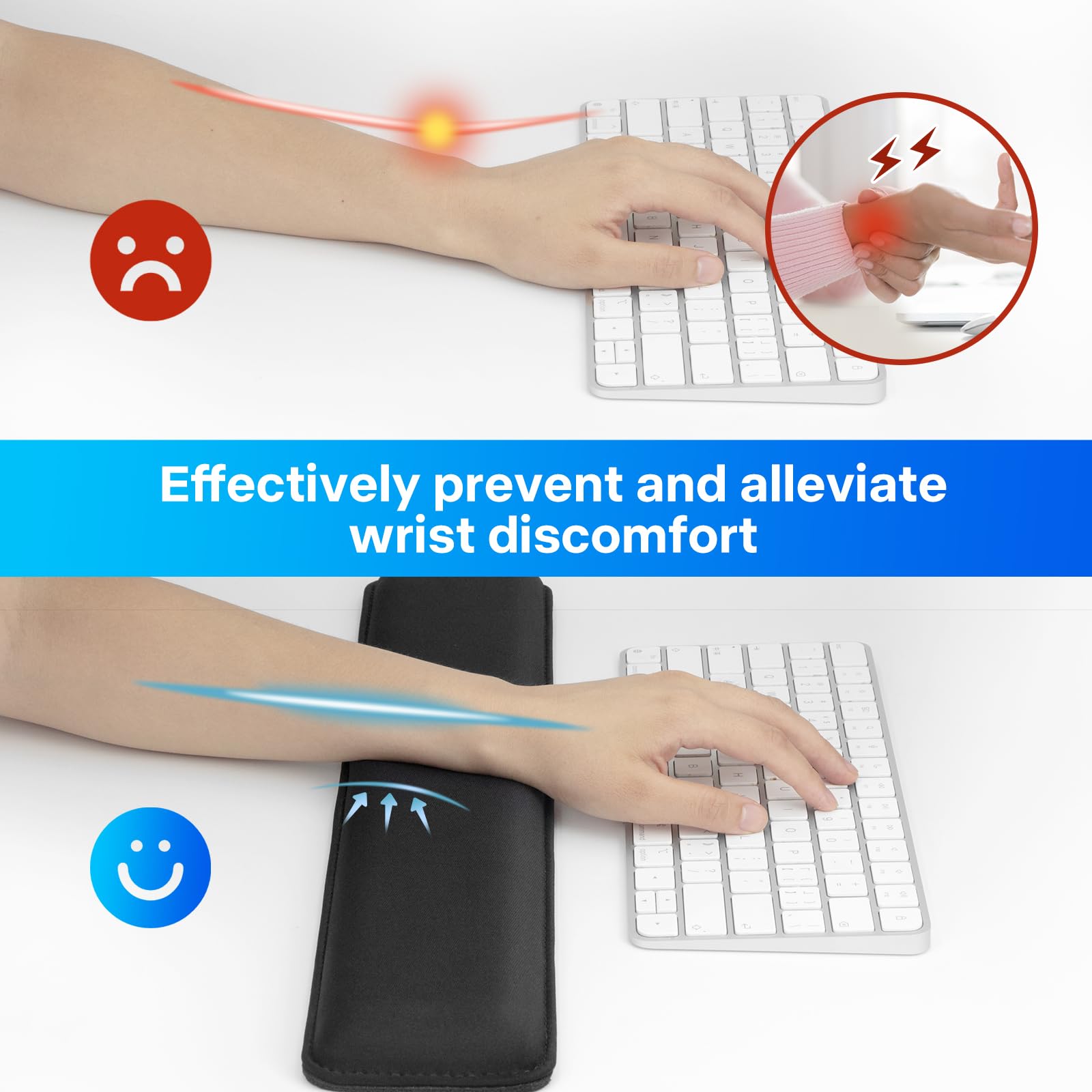 【ERGONOMIC DESIGN】It improve hand and wrist posture, avoid joint and wrist problems and release your elbows and shoulder stress for long hours of use on the computer. offers more support to your wrist, Wrist rest works perfectly with most laptop computer keyboards and save space for small desk.