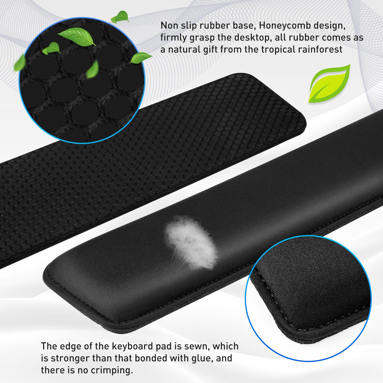 【NATURAL & ANTI SLIP RUBBER BASE & THE EDGES ARE REPEATEDLY SEWN BY PURE HAND】Non-skid Rubber Base provides heavy grips, firmly hold the keyboard wrist support in place,effectively prevents the keyboard wrist rest pad from sliding or unwanted movement. The edges of the keyboard pad are manually sewn repeatedly to ensure they are not easily rolled up or cracked, and there is no crimping.