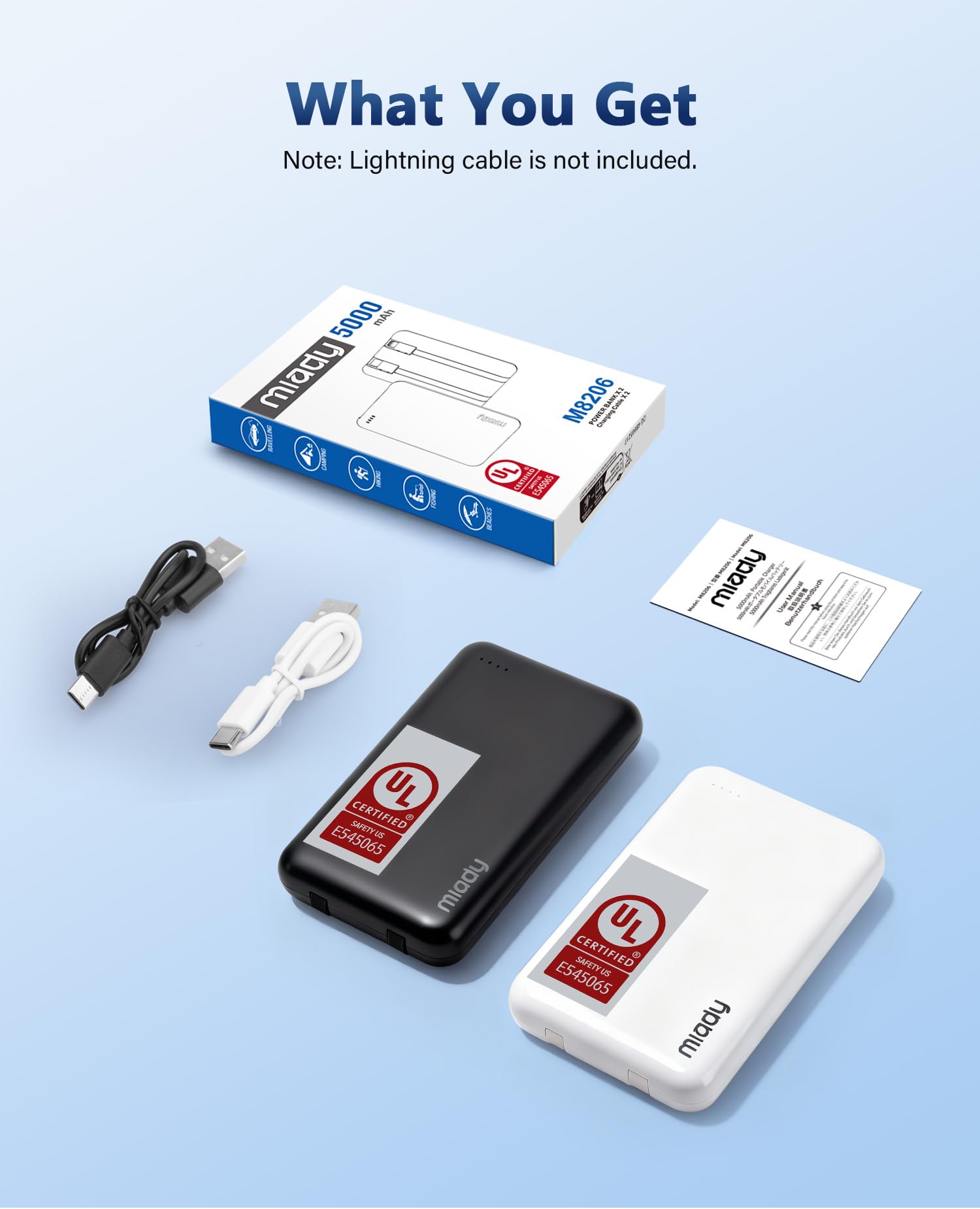 What You Get: 5000mAh Portable Phone Charger (Black+White) * 2; USB-C Cable * 2; User Manual * 1. This charging bank comes with friendly customer 24/7 service. If you have any questions, please contact the Miady's store first for a solution, we will be sure to provide a satisfying solution for you. Your satisfaction is our greatest recognition and support.