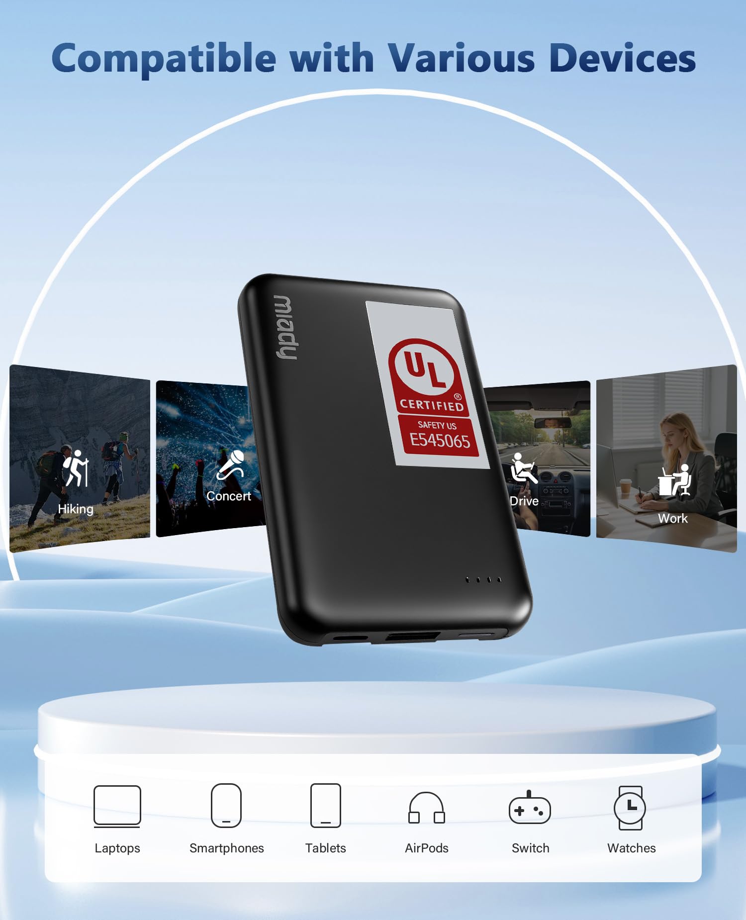 We Care About You: Miady small portable phone charger is UL-Listed—it has passed rigorous independent testing by Underwriters Laboratories for electrical safety. This means it meets strict standards for overheating protection, short-circuit prevention, battery stability, and more. It can keep you and your devices safe at home, on the go, or even during air travel.