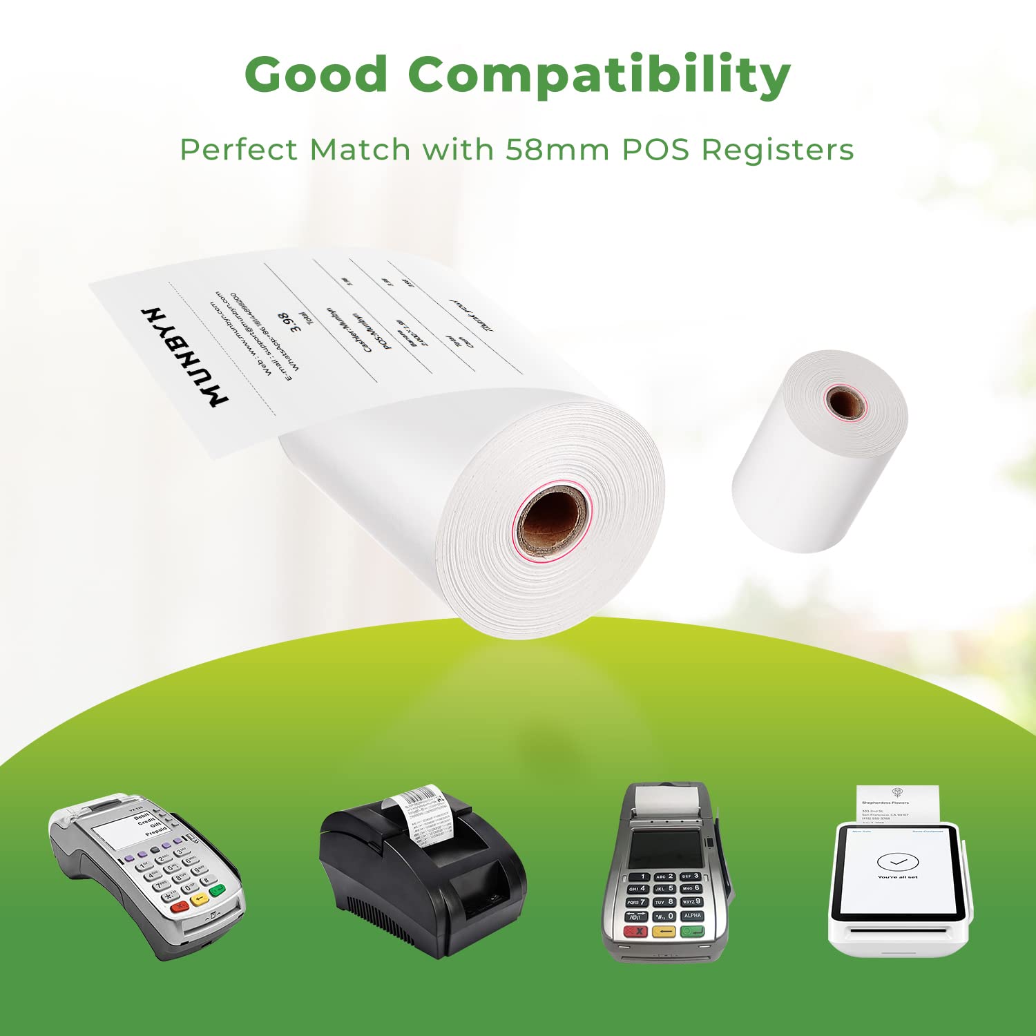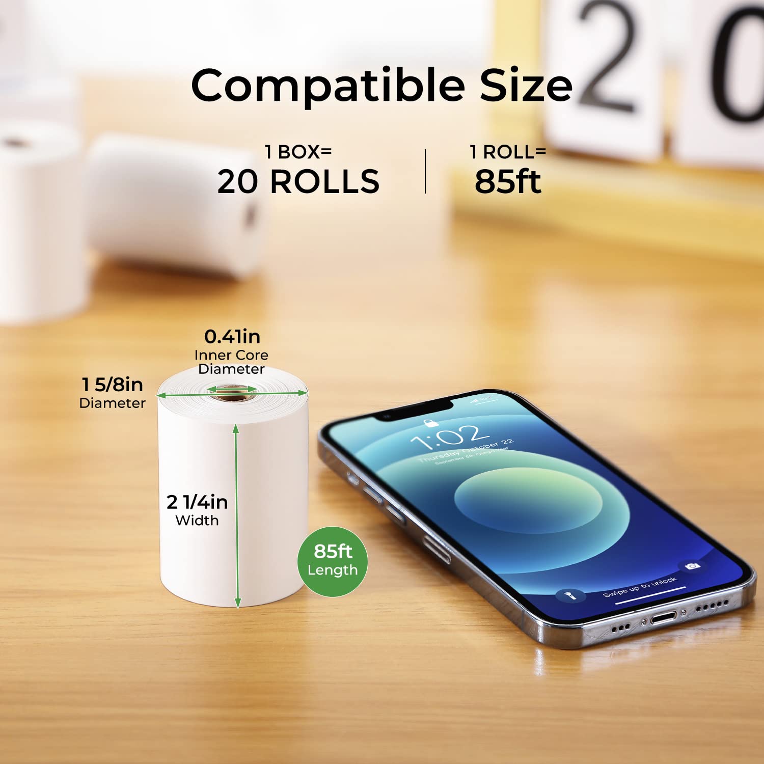 [Compact Size] 2 1/4" x 85ft thermal paper rolls (50 Rolls/ Case)--W x D x L = 2 1/4 inches (57mm) x 1 5/8 inches (42mm) x 85ft (26m). More paper at a lower cost for our MUNBYN customers