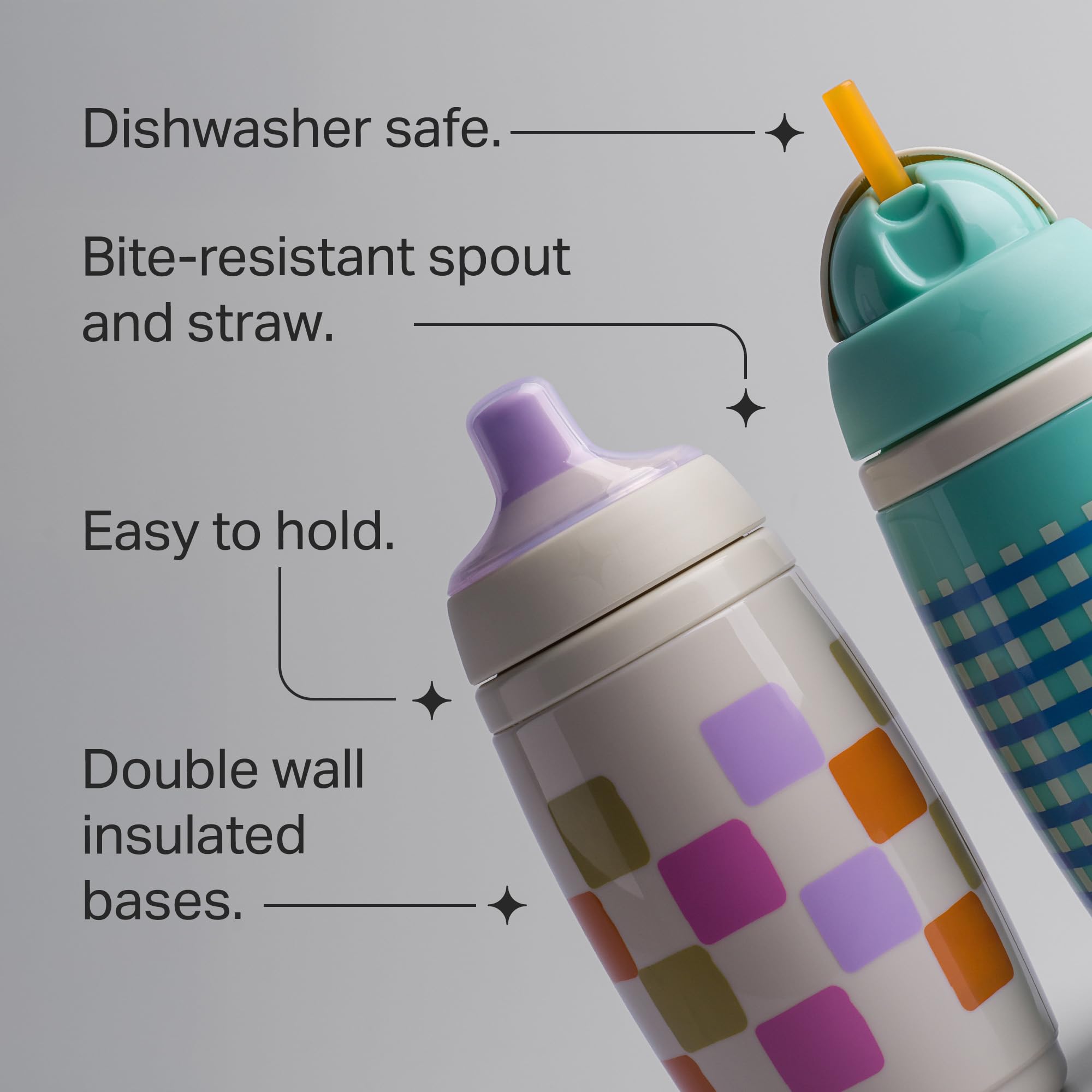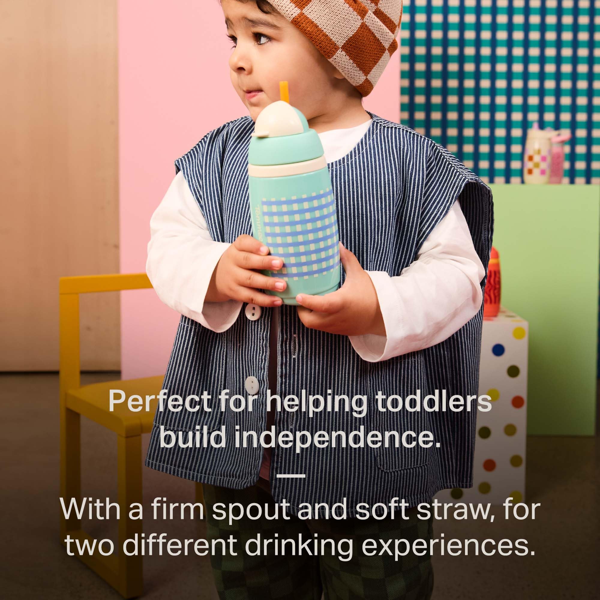 A choice of two bottles with a spout or straw, to help toddlers develop their independent drinking skills. Leak-proof, durable, and with an insulated base to help keep drinks cool. Decorated with vibrant geometric patterns and pops of color. Specially engineered two-piece valve stops spills Durable spout or straw that's gentle on little mouths but also bite-resistant Spout cup features easy-hold handle and removable valve for free-flow drinking Both bottles come with lids to help keep the straw and spout clean Insulated base helps to keep drinks cool 9oz, suitable for toddlers aged 12m+ Dishwasher safe and BPA free