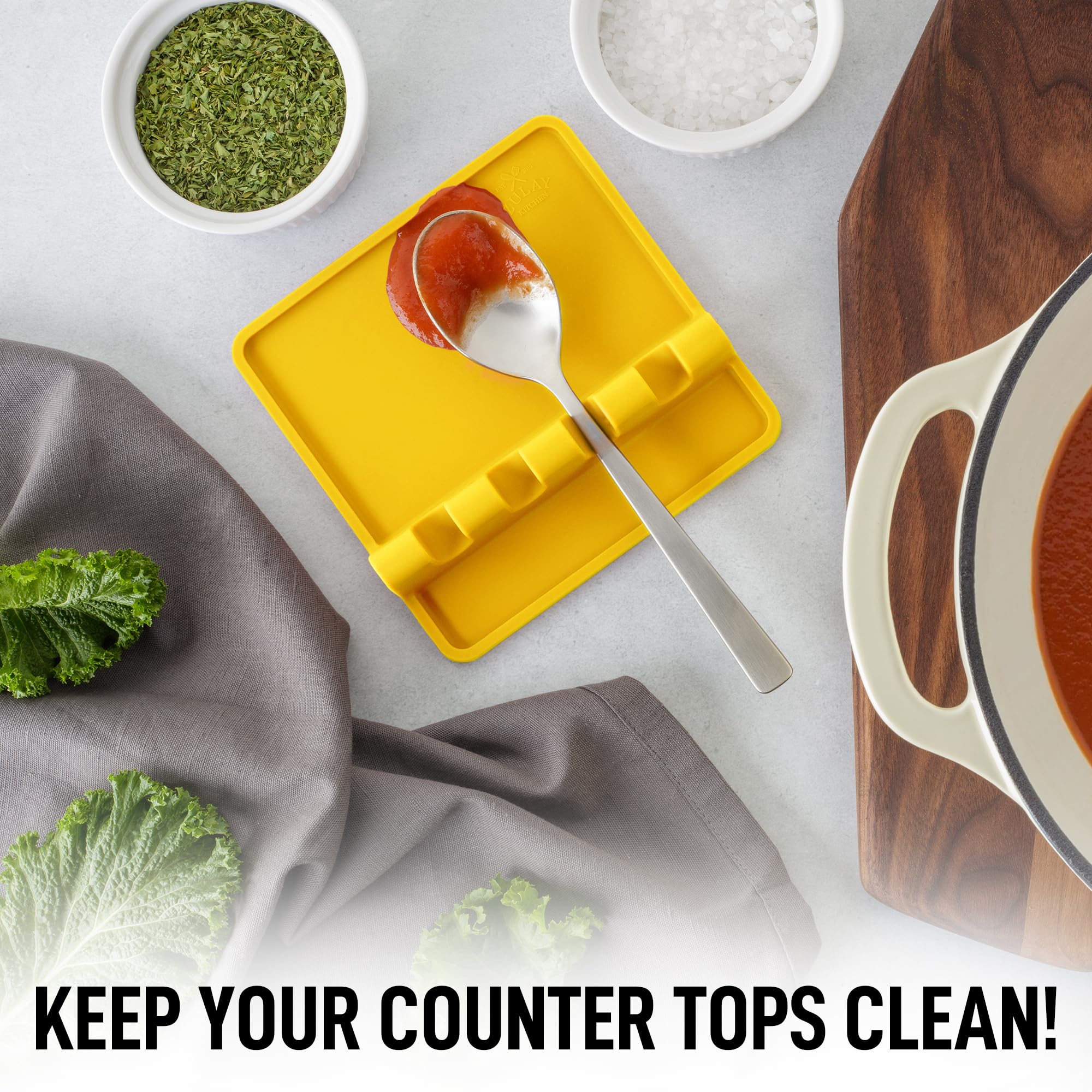 KEEP YOUR COUNTERTOPS CLEAN: Are you tired of random oil and sauce drips all over stovetops and kitchen counters while cooking? Say no more! Our spoon rest has raised edges to catch all the drips, making it a great addition to your kitchen gadgets for keeping counters and stoves splatter-free. Revolutionize your cooking, baking, or grilling experience with this beautifully designed square spoon holder.