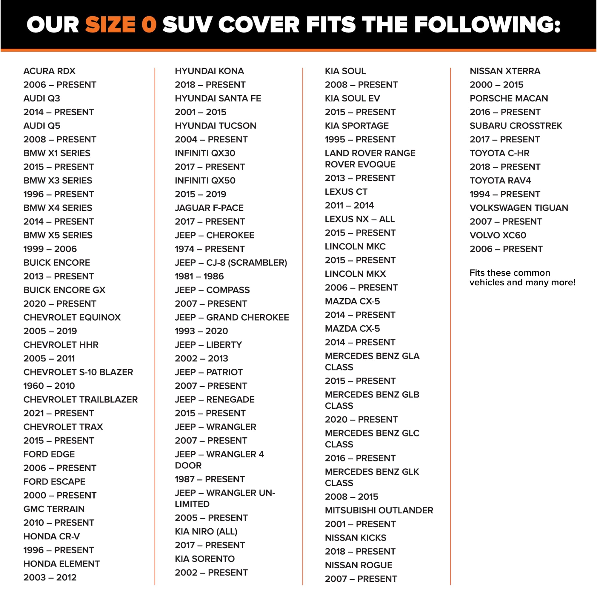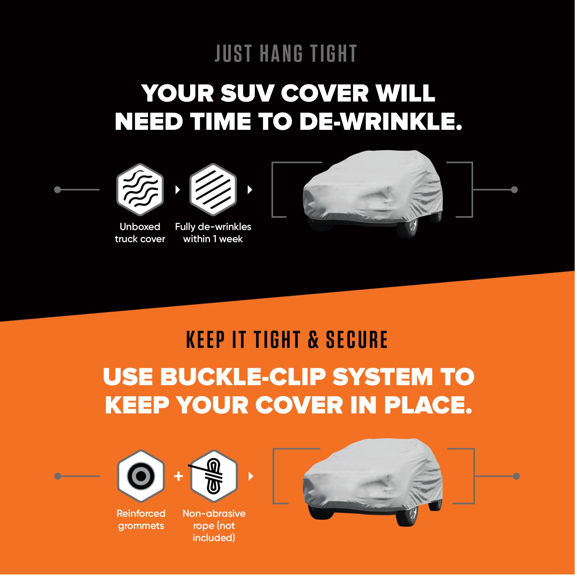 SNUG SEMI-CUSTOM FIT: Designed for a secure fit on SUVs up to 162" L x 59" W x 60" H. The elasticized hem wraps around bumpers and sides to stay firmly in place during breezy conditions