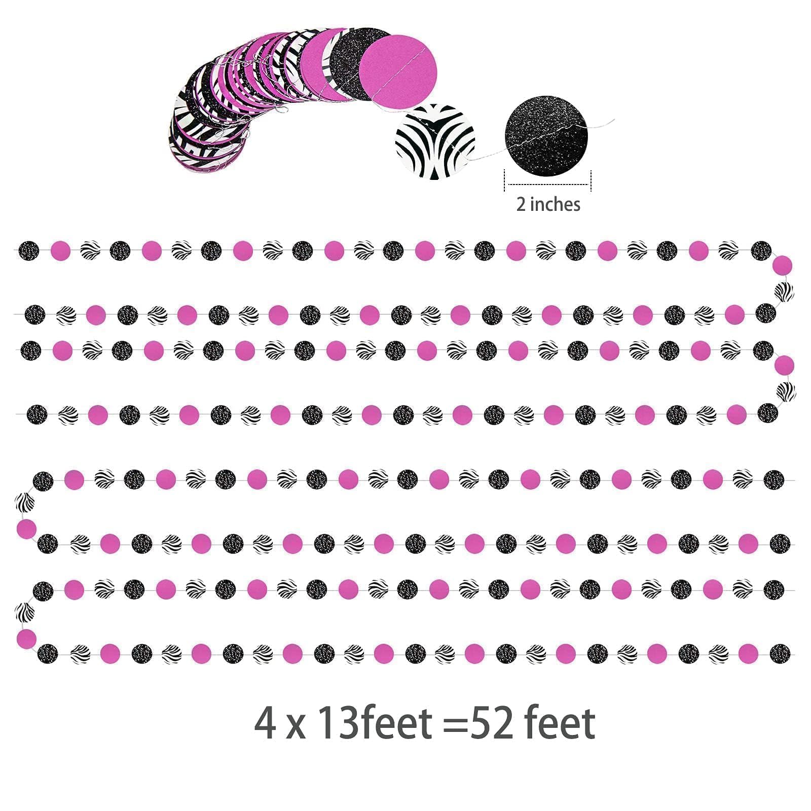 Package: Introducing our zebra party decorations kit, featuring 4 packs of 13 ft circle dot garlands for a total of 52 ft. Each garland includes 2-inch glittering black, hot pink, and zebra print decorations to enhance any zebra-themed party or animal print party decorations.