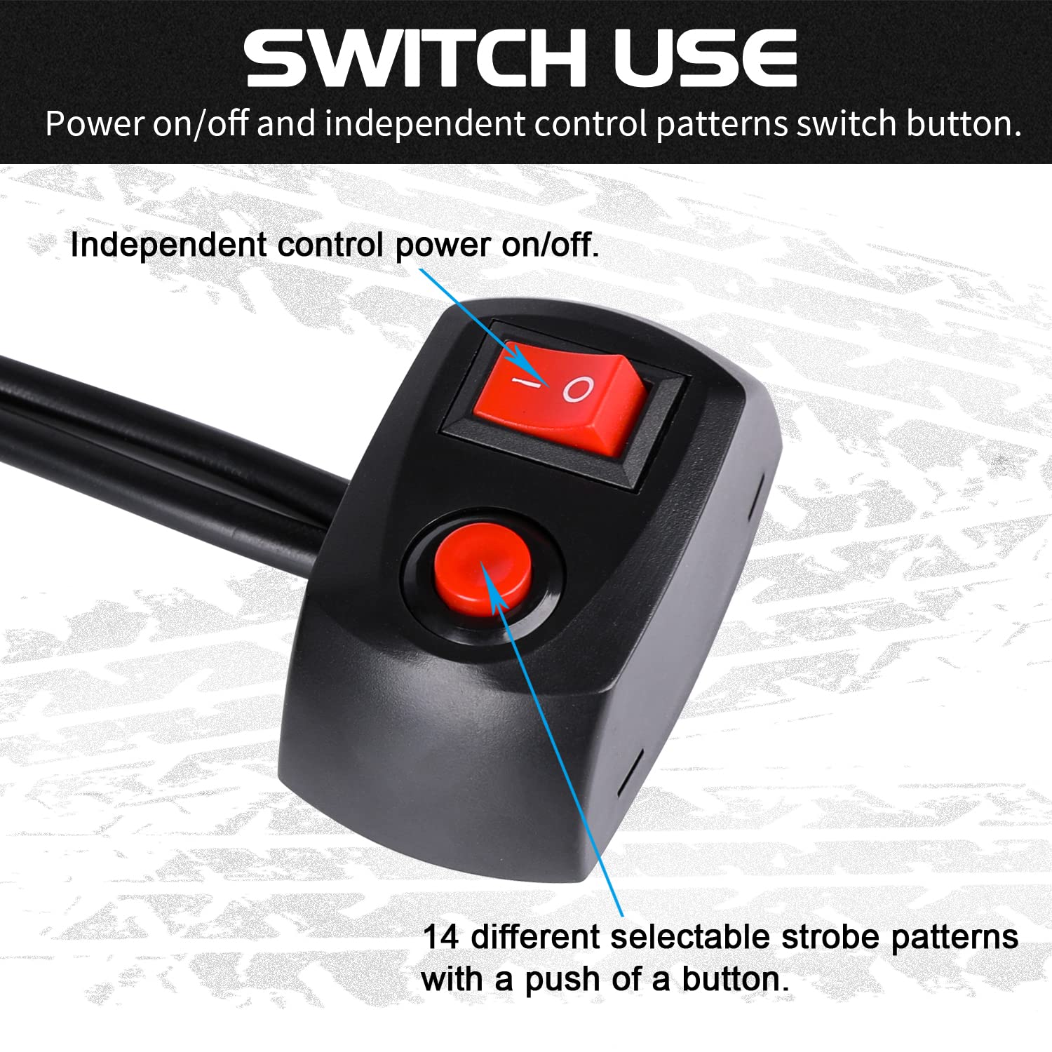 7 Flash Patterns: Dual switch button setting, One switch is for easy on/off, 7 flash patterns with a independent switch to cycle through modes. Memorizes last pattern used (recall last pattern), The on/off switch allows you to turn the power off without unplugging it.