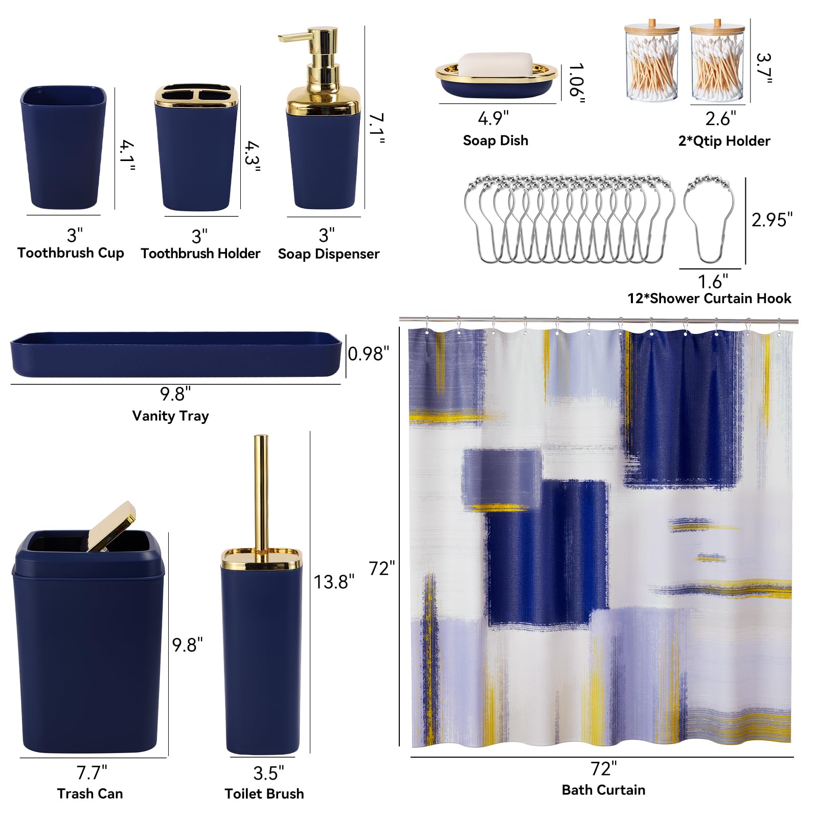 ใ๐๐๐ญ๐ก๐ซ๐จ๐จ๐ฆ ๐๐๐ญ๐ฌ ๐ฐ๐ข๐ญ๐ก ๐๐ก๐จ๐ฐ๐๐ซ ๐๐ฎ๐ซ๐ญ๐๐ข๐งใIncludes soap dispenser, toothbrush holder, tumbler, soap dish, bathroom trash can, toilet brush and holder set, bathroom tray, 2 qtip holders, 12 shower curtain hooks, and printed shower curtain set.