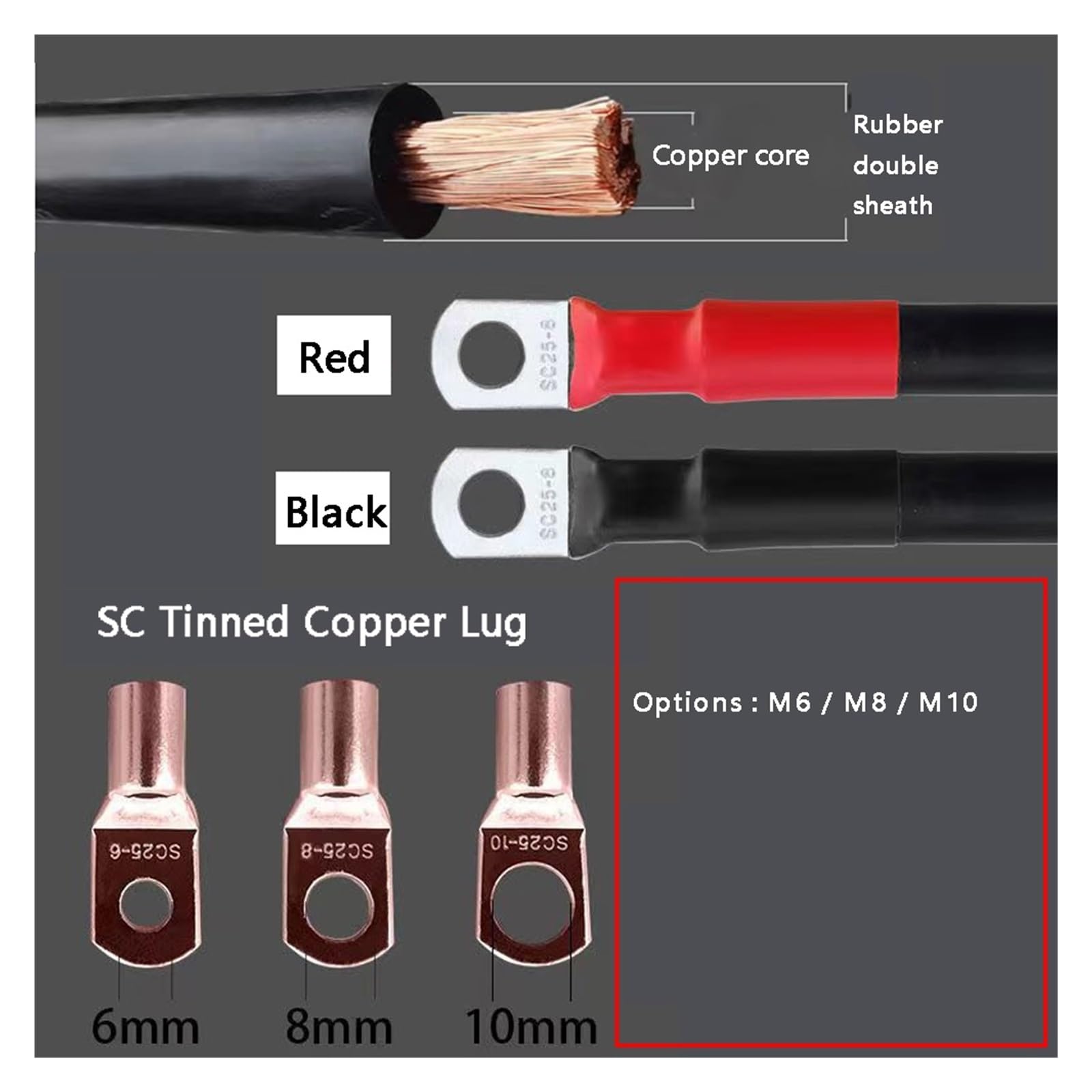 1.Cables are made of pure copper and tinned copper lugs with superior corrosion and oxidation resistance, which improves the oxidation resistance of copper and maintains its conductivity better.