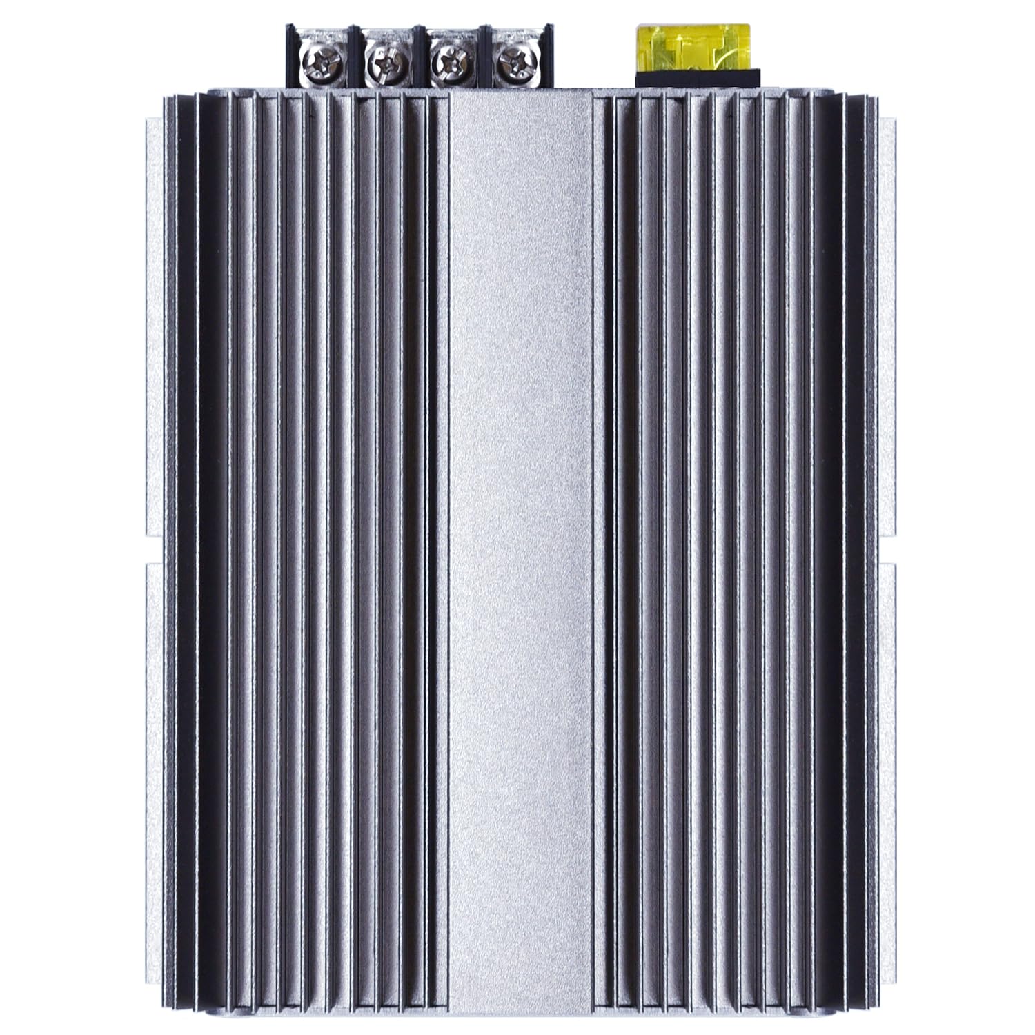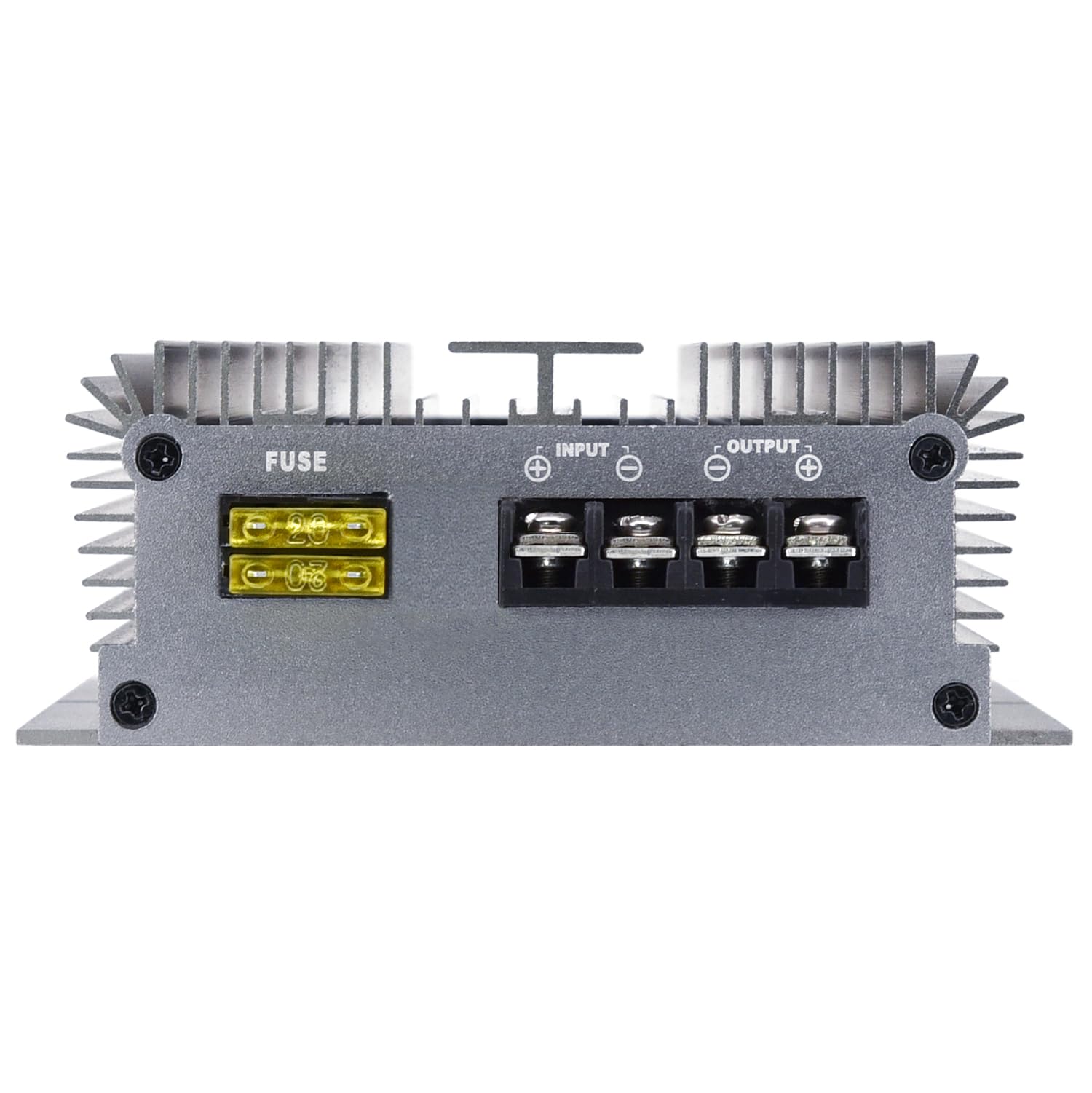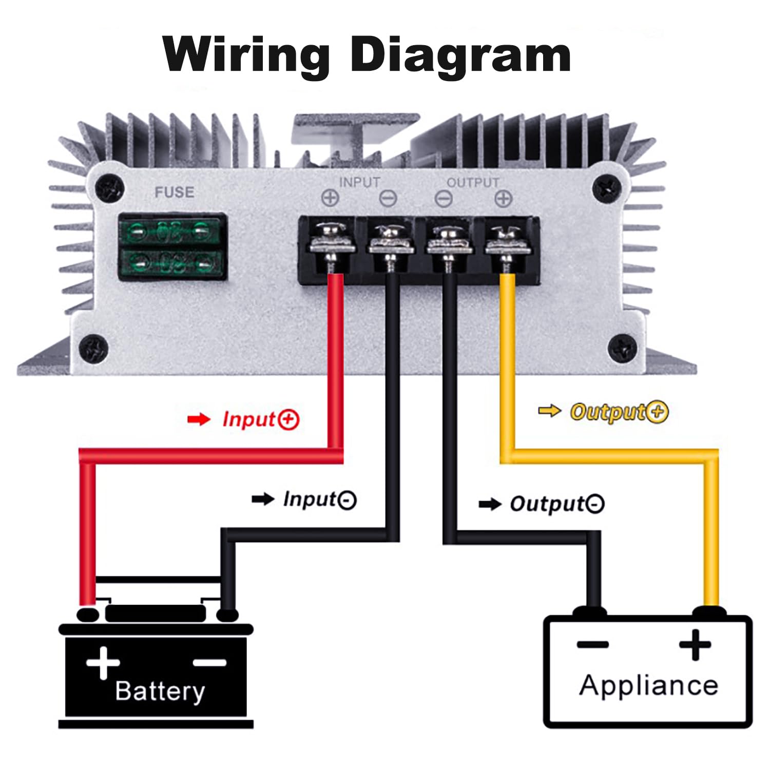 Wiring: OUTPUT+ to LOAD+, OUTPUT- to LOAD-; INPUT+ to BAT+, INPUT- to BAT- Note: * Never connect to solar panel, PWM/MPPT charge controller, inverter or wind turbine. * Never use for charge. Keep good air convection. * Never reverse the polarity. * Use the enough big cable to avoid the voltage drop. Specifications: Input Voltage Range: 40V-90V DC Output Voltage: DC24V 50A Output Rated Power: 1200W Efficiency: 97% (half load); 95% (full load) Ripple: 200mVp Line Regulation: ±0.2% Load Regulation: ±0.2% Voltage Accuracy: ±1.5% Enclosures: IP68 Case Operating Temperature: -40~85°C Weight: 1540g Features: 1. 100% full power and stable current output, non-isolated module. 2. Industry grade DC 40V-90 to DC 24V step down converter, efficiency up to 95%. 3. Die-cast aluminum shell, epoxy potting, cooling by free air convection; Waterproof level IP68 and anti-shock protection. 4. Protections: Over-current, Over-voltage, Over-temperature, Over-load and Short-circuit, auto-recovery when device is back to normal operating. 5. Certificates: CE/RoHS, 1 year warranty, lifetime up to 100,000 hours. Package included: 1 x DC 40V/90V to 24V 50A Converter Questions: How to choose the correct current for loads? For example, if the max current of your load device is 10A, then choose 10A/0.8=12.5A at least for resistive loads according to international standard. If the load device is motor or compressor, then you may choose 10A/0.5=20A according to real testing result since the motor and compressor starting current may be 2-3 times than nominal current.