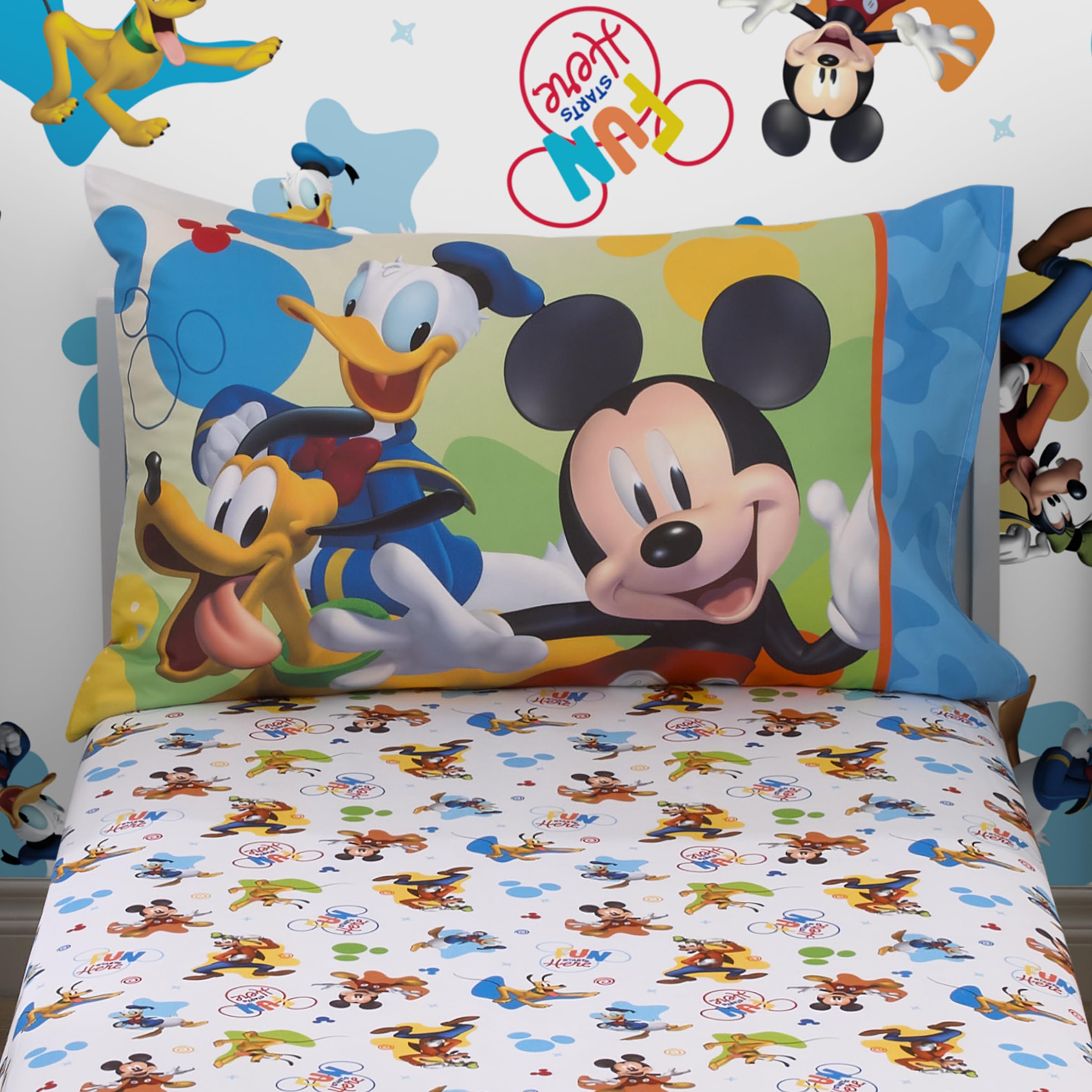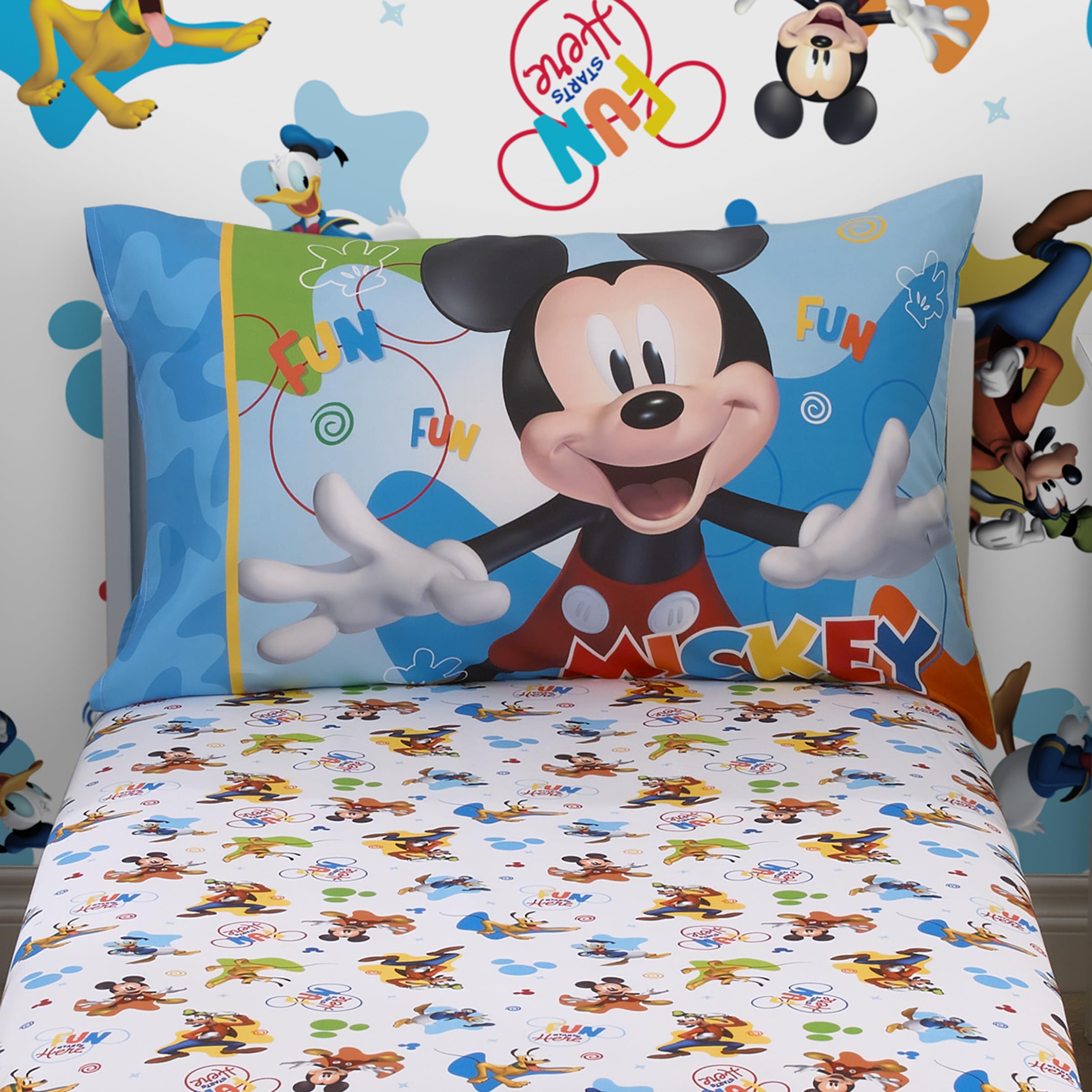 The Disney Mickey Mouse Fun Starts Here 2 Piece Toddler Sheet Set includes a fitted bottom sheet and reversible pillowcase. Features an allover playful pattern with Mickey Mouse and his best buddies, Donald Duck, Pluto, and Goofy, with Mickey ears and words that say, Fun Starts Here!. Designed in shades of blue, green, red, yellow, and white. Made of super soft fabrics for a snuggly sleeping surface. The 20" x 30" pillowcase is reversible and uses a standard size pillow. The fitted sheet measures 28" x 52" x 8" and fits a standard size crib/toddler mattress. The sheet includes full elastic edges for a safe and snug fit. Coordinates with Disney Mickey Mouse Fun Starts Here Toddler Collection!