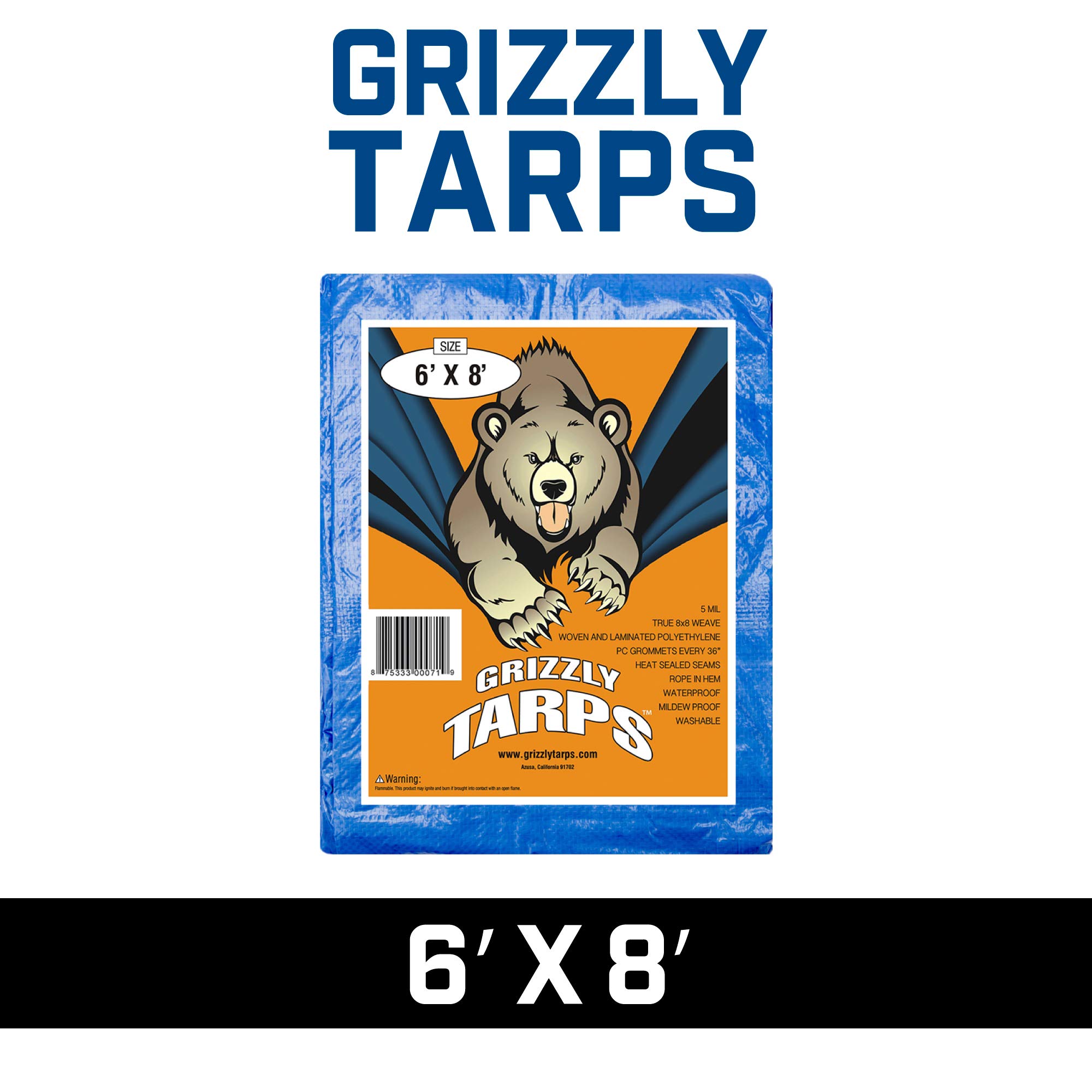 Product Description The superior grade tarps by Grizzly Tarps are made from a tight 8 sq. in. x 8 sq. in. polyethylene weave which provides durability. This method of manufacture gives you a long-lasting cover that is light weight and easy to handle. They are also further enforced by having border piping to insure stronger ends to avoid tears during stressful application. Secure built-in grommets are very useful for tie-downs. The Grizzly Tarps present a stronger and longer living tarp that will work hard to provide you with all your covering or protective requirements. Tarpaulins (Tarps) have multiple uses, including being a shelter from the elements (i.e. wind, rain or sunlight), aground sheet, a drop sheet for painting, protecting the infield of a baseball field and protecting objects such as enclosed road or rail goods carrying vehicles or woodpiles. Given their multi-purpose use, Tarps can be used for many applications. From the Manufacturer The superior grade tarps by Grizzly Tarps are made from a tight 8x10 sq inch polyethylene weave which provides durability. This method of manufacture gives you a long lasting cover that is lightweight and easy to handle. Grizzly Tarps further enforce their tarps with border piping to insure stronger ends to avoid tears during stressful application. Supplied with built-in grommets every 34" allow for secure tie-downs as well. Tarps can be used as protection for boats, cars or motor vehicles, providing shelter from the elements, ie., wind, rain or sunlight for campers, as an emergency roof patch material for homeowners, as a temporary pickup truck bed cover, and for a ground or drop sheet. No matter what application, Grizzly Tarps present a stronger more durable tarp that will provide the user with longevity for all covering or protective needs.