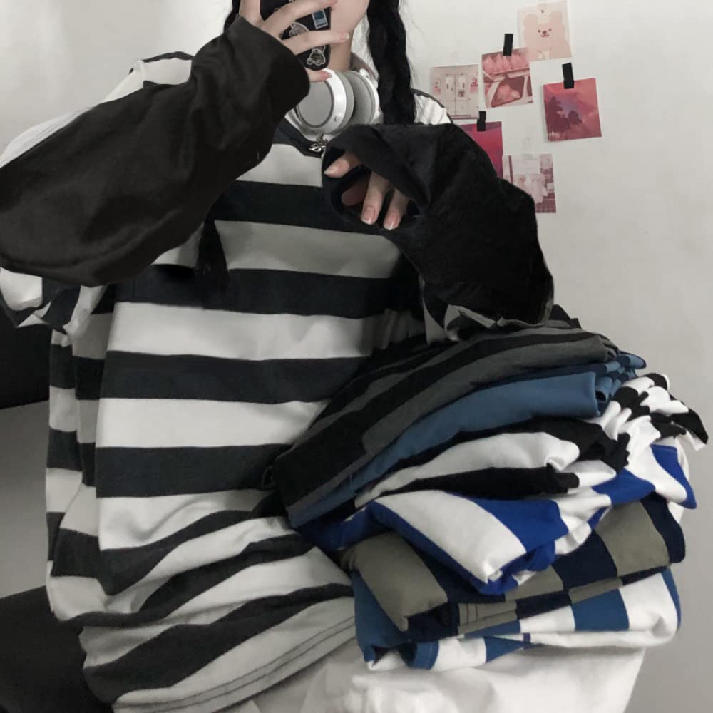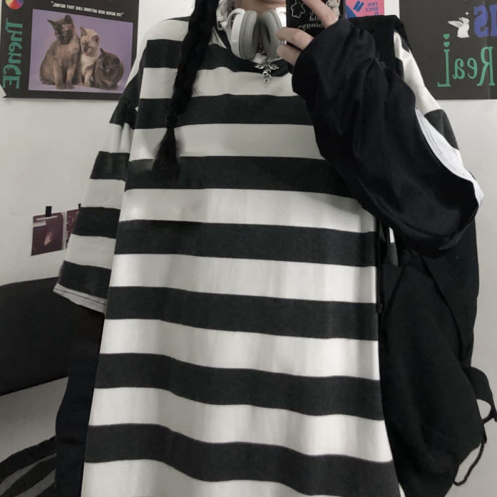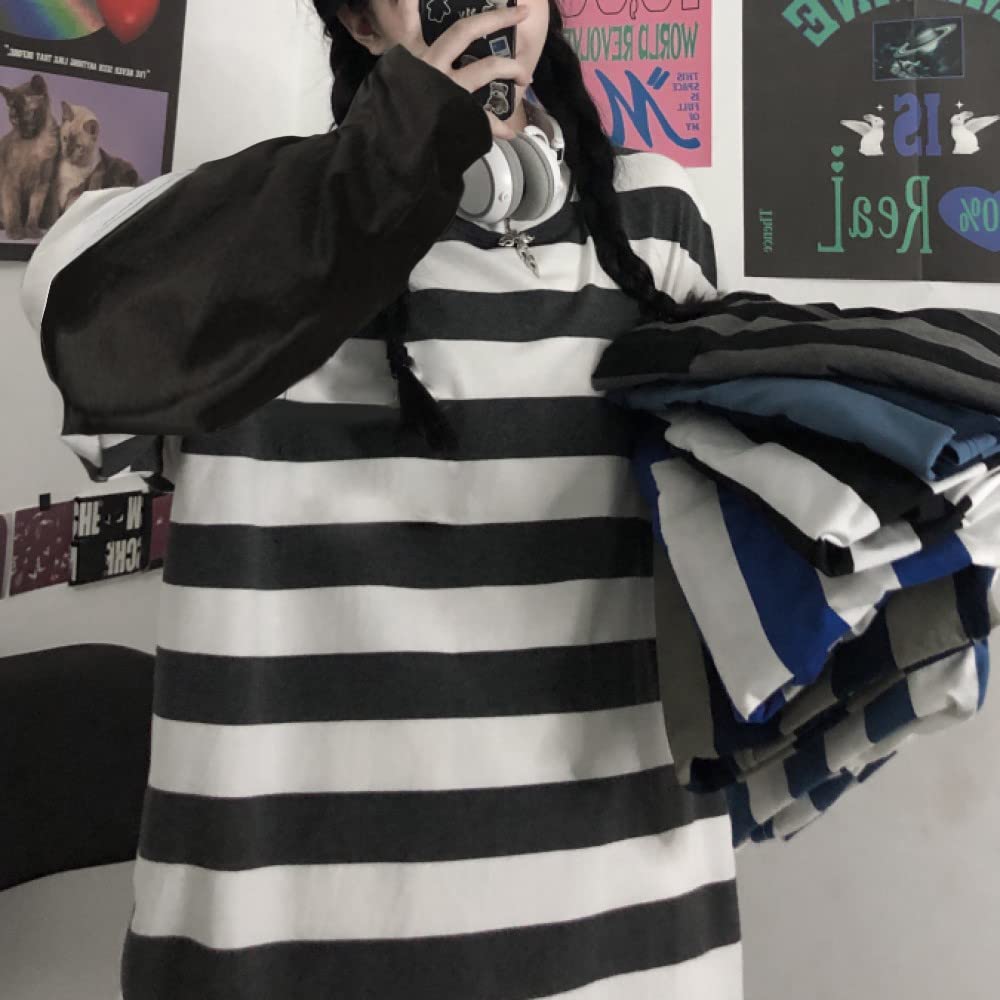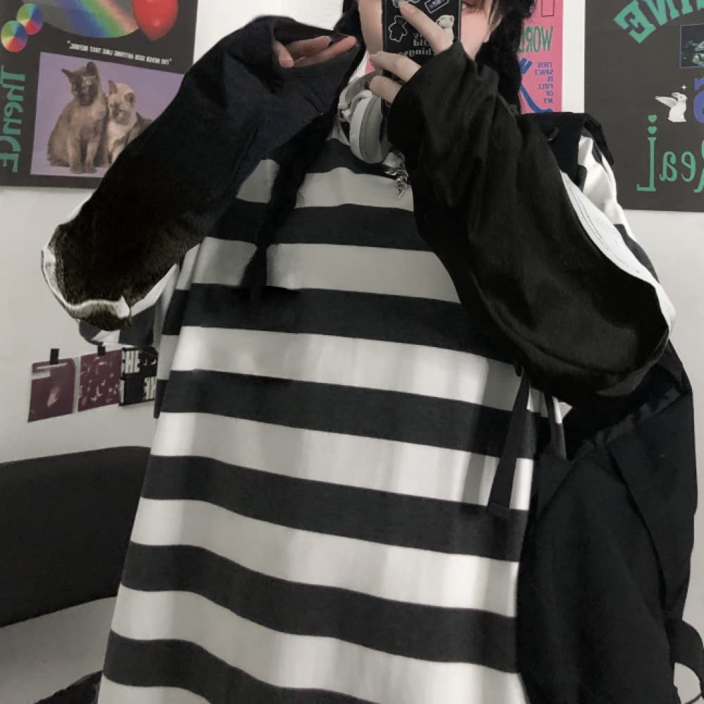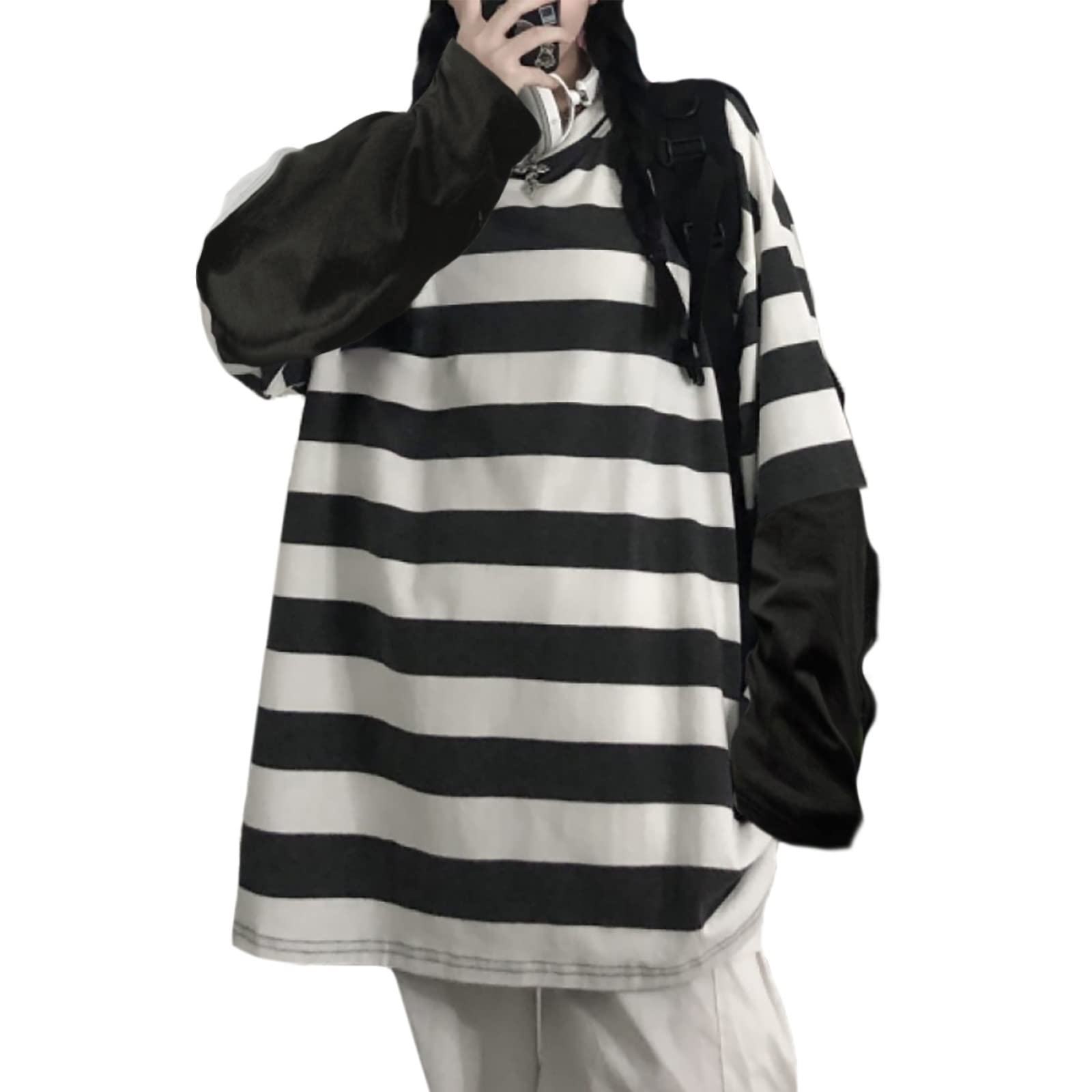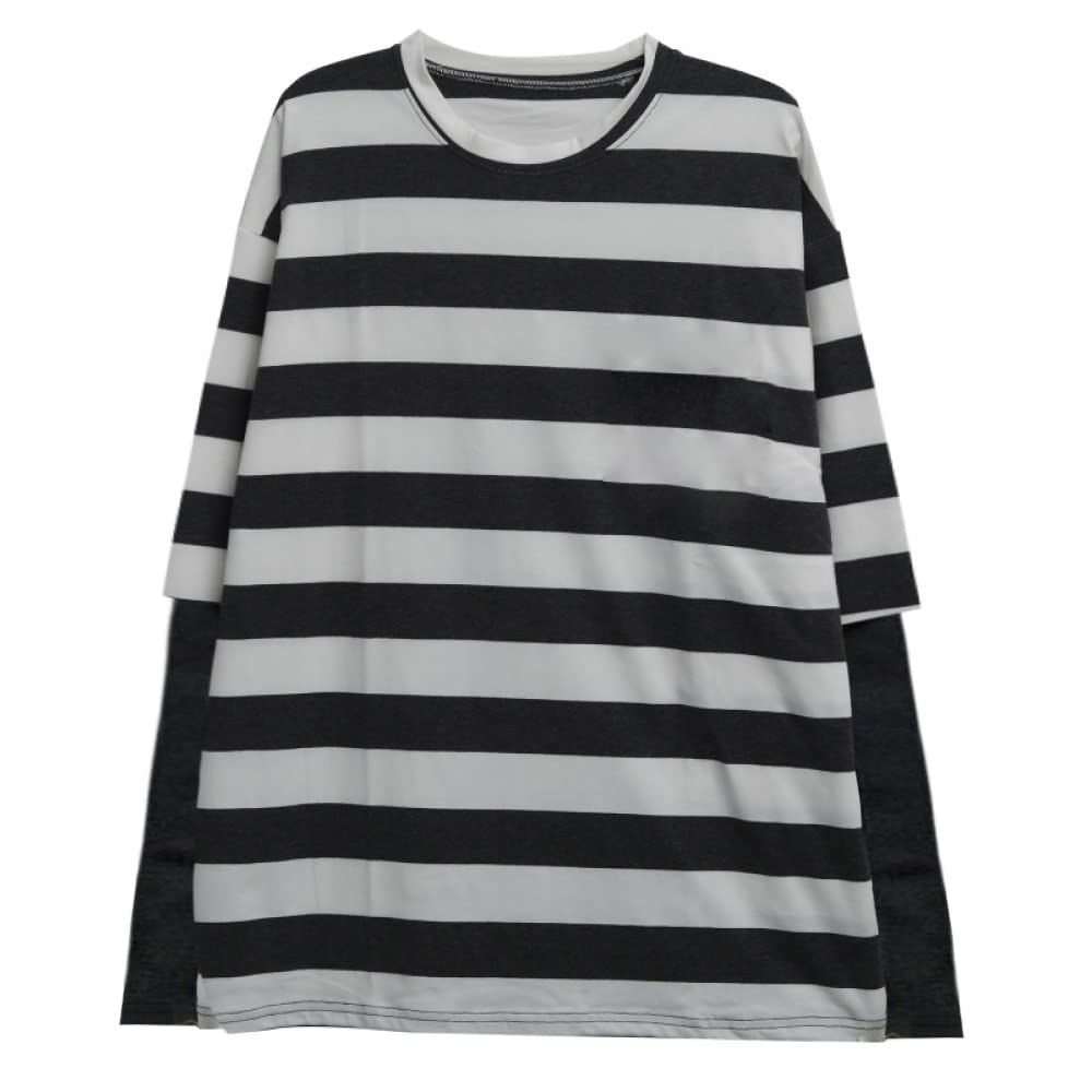 Features: This gothic pullover is designed with a round neck, stripes, long sleeves, fake two-piece design, casual loose, urban style, hip-hop style, fashionable style, unisex top, suitable for men and women.