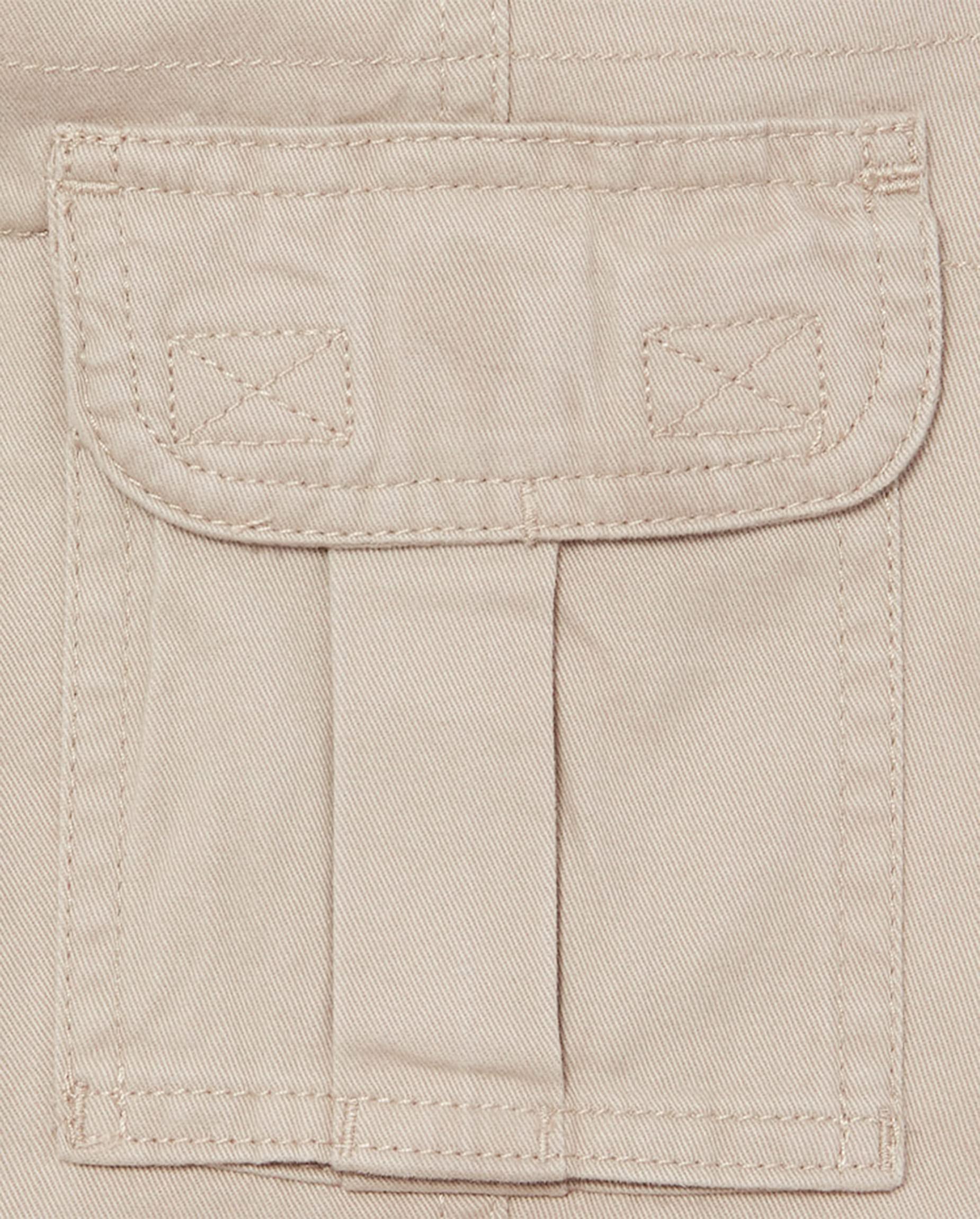 Styled with an elastic pull-on waist and inner adjustable waist tabs; plus side slant, cargo flap and back welt pockets