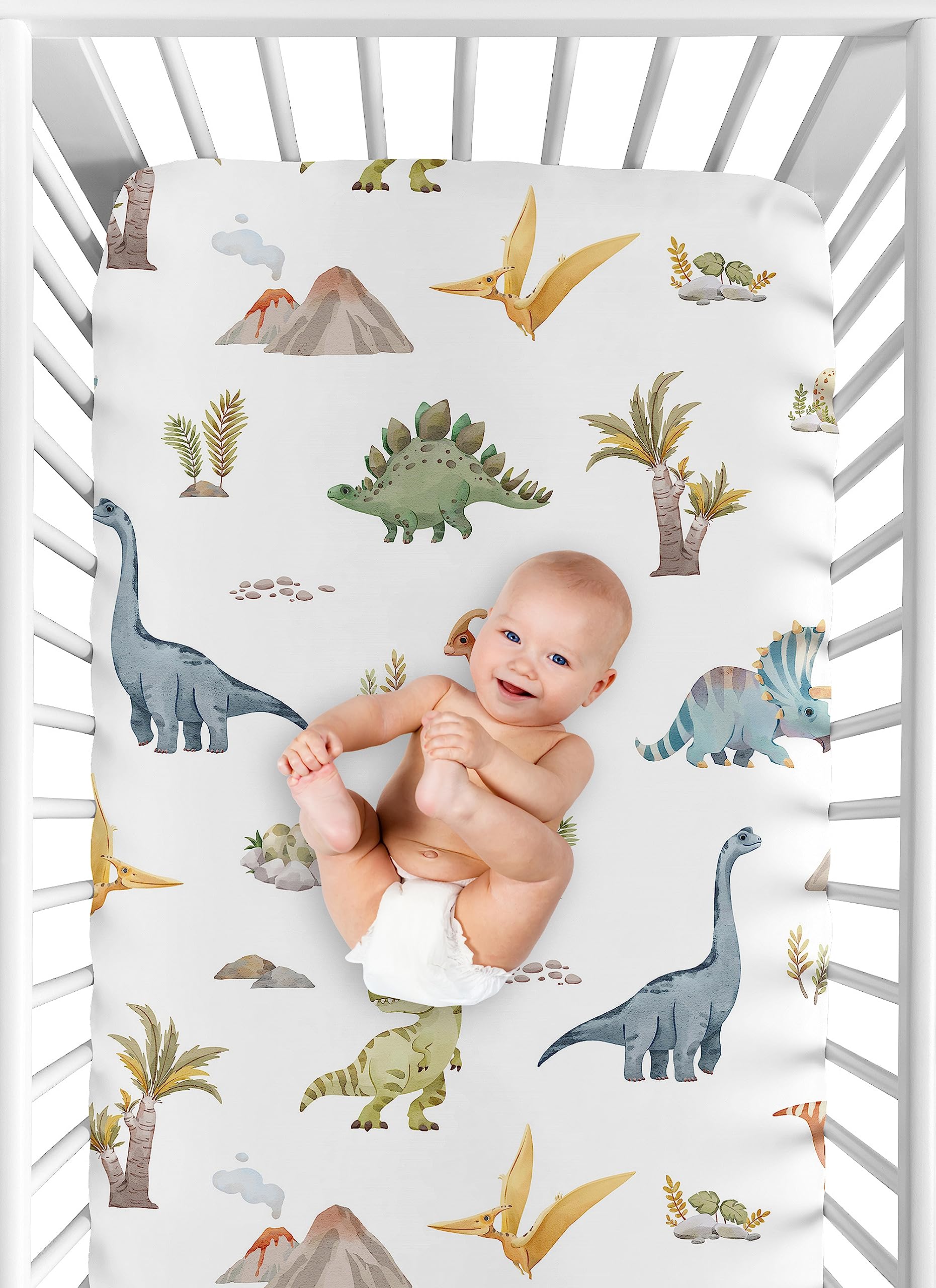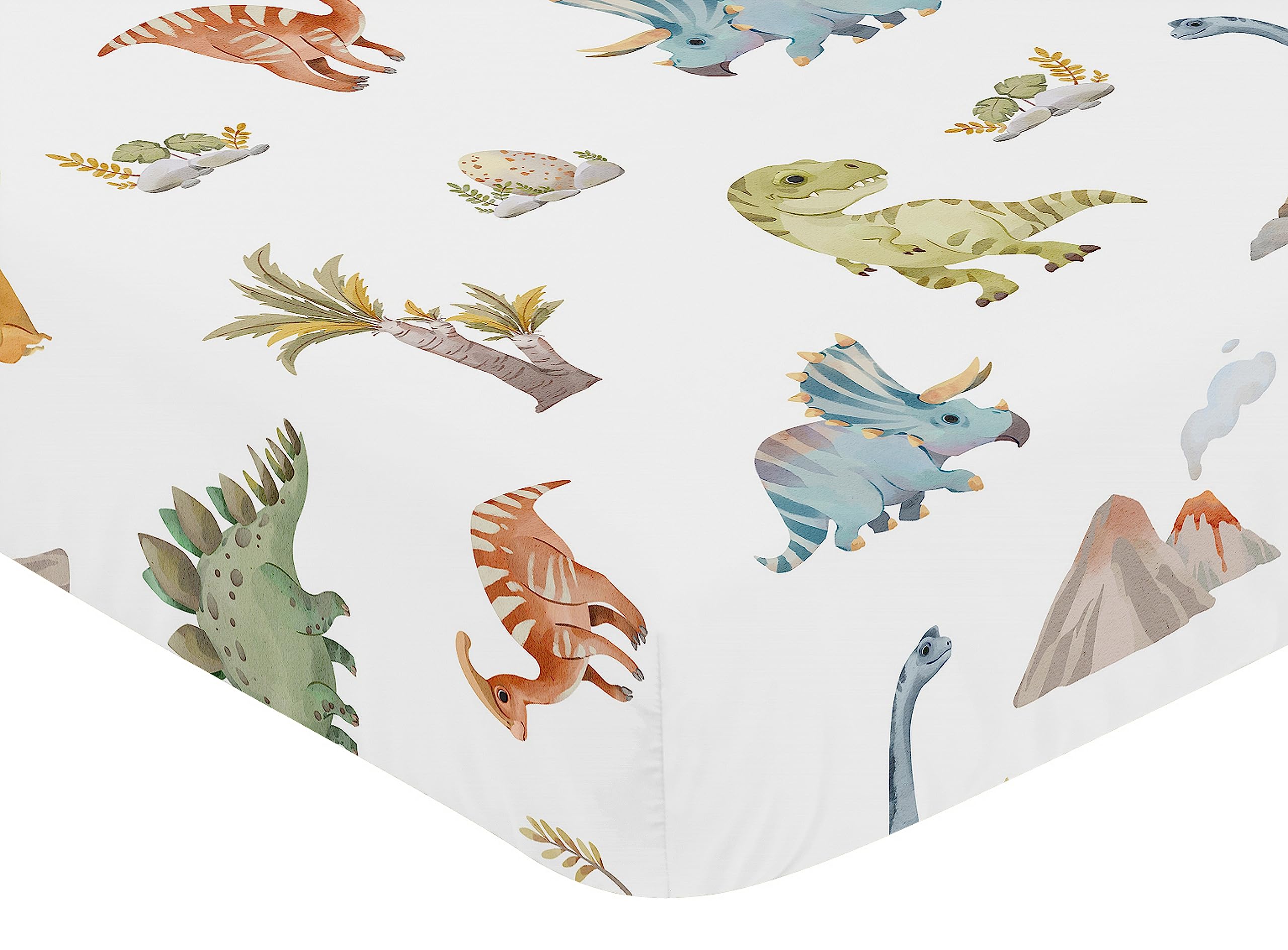 SNUG FIT: Includes (1) Fitted Crib Sheet 52in. x 28in. x 8in. Our newborn standard crib sheets fit snugly, with premium elastic sewn around the entire bottom edge for a secure fit on most standard sized cribs and toddler beds, to reduce shifting & bunching. This brushed microfiber crib sheet features an exclusive design of a watercolor green, turquoise, slate blue, orange & yellow modern jurassic, nature, animal dino print & is gentle on delicate skin to foster a soothing sleep environment.