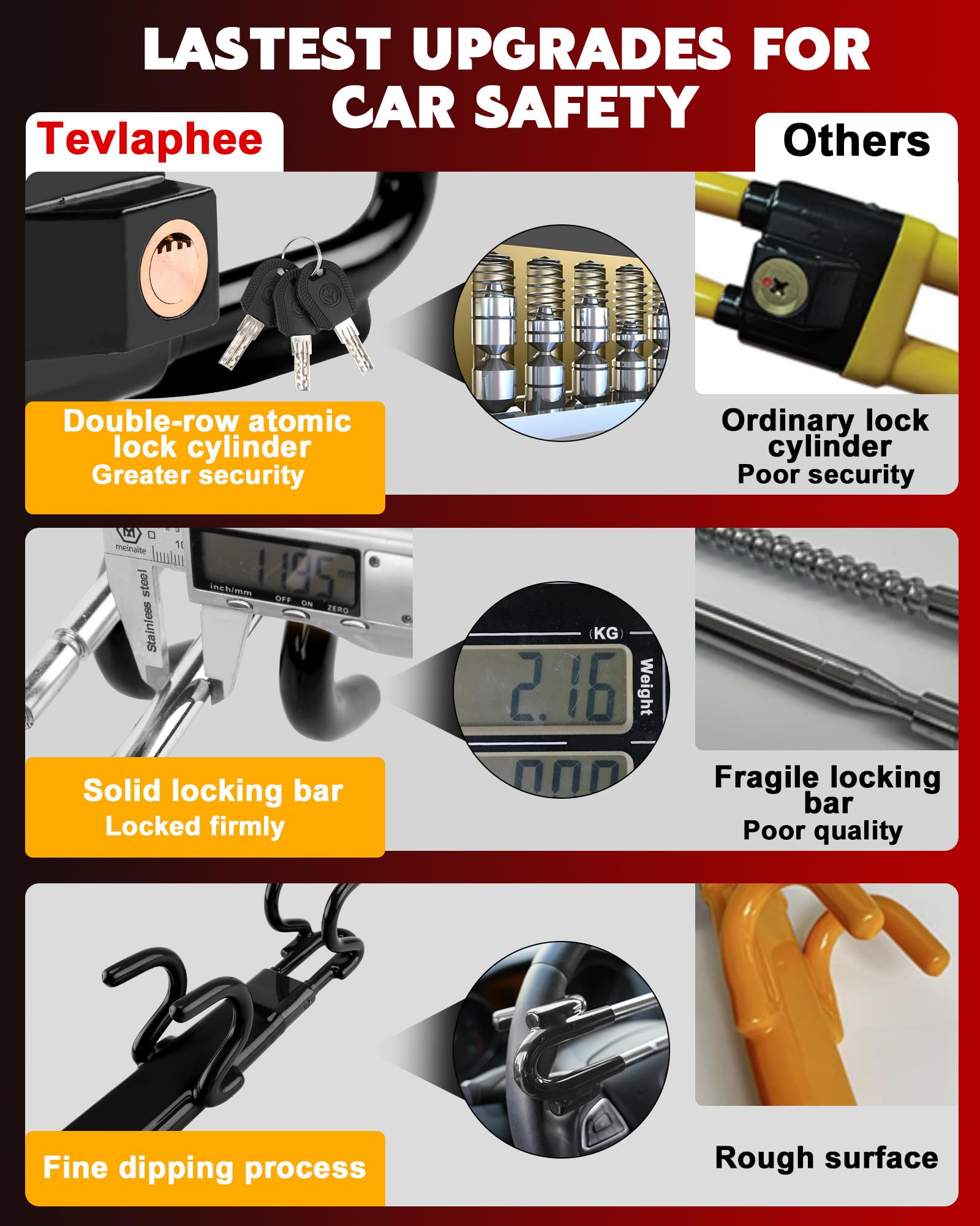 HIGHLY VISUAL DETERRENT AND SAFE:The bright color of the car lock is a fine choice for maximum visibility both day and night,which tells the thief "Not this car"!The anti car theft device greatly reduces the possibility of being targeted by thieves and protects your car security effectively.Tevlaphee steering wheel lock gives you more peace of mind!