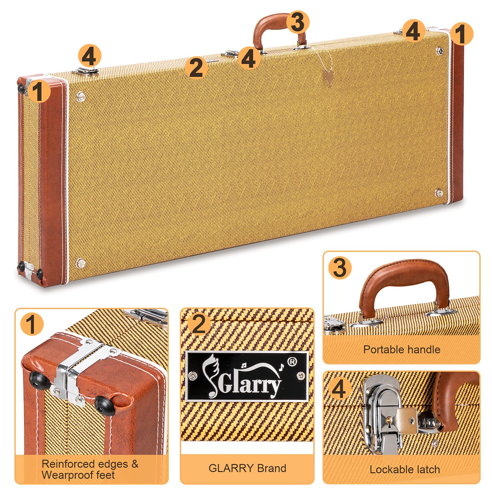 Description Features: 1. Lockable wood hard case with plush lined interior that includes extra neck and bridge padding 2. Sturdy chrome latches and bumpers on bottom and sides of case for added protection and stability 3. Comfortable molded handle 4. Large interior storage compartment for accessories 5. It is made of high quality wood, leather, plush and hardware accessories material, durable and sturdy in use 6. Square appearance design Specifications: 1. Dimensions: (41.34 x 14.57 x 3.94)" / (105 x 37 x 10)cm (L x W x H) 2. Color: Yellow 3. Weight: 211.64oz / 6000g 4. Material: Wood & Leather & Plush & Hardware Accessories 5. Leather Pattern: Microgroove 6. Surface Type: Flat 7. Case Total Length: Inner Diameter: 39.76" / 101cm, Outer Diameter: 41.34" / 105cm 8. Case Total Width: Inner Diameter: 12.99" / 33cm, Outer Diameter: 14.17" / 36cm 9. Neck Length: Inner Diameter: 21.06" / 53.5cm, Outer Diameter: 21.65" / 55cm 10. Lower Case Length: Inner Diameter: 18.7" / 47.5cm, Outer Diameter: 19.69" / 50cm 11. Upper Cover Depth: Inner Diameter: 1.57" / 4cm 12. Lower Cover Depth: Inner Diameter: 2.17" / 5.5cm The hard leather case is suitable for standard GST GTL 170 SG and Burning fire Style electric guitar. If your electric guitar is non-standard, please check whether the size is suitable for your electric guitar when buying