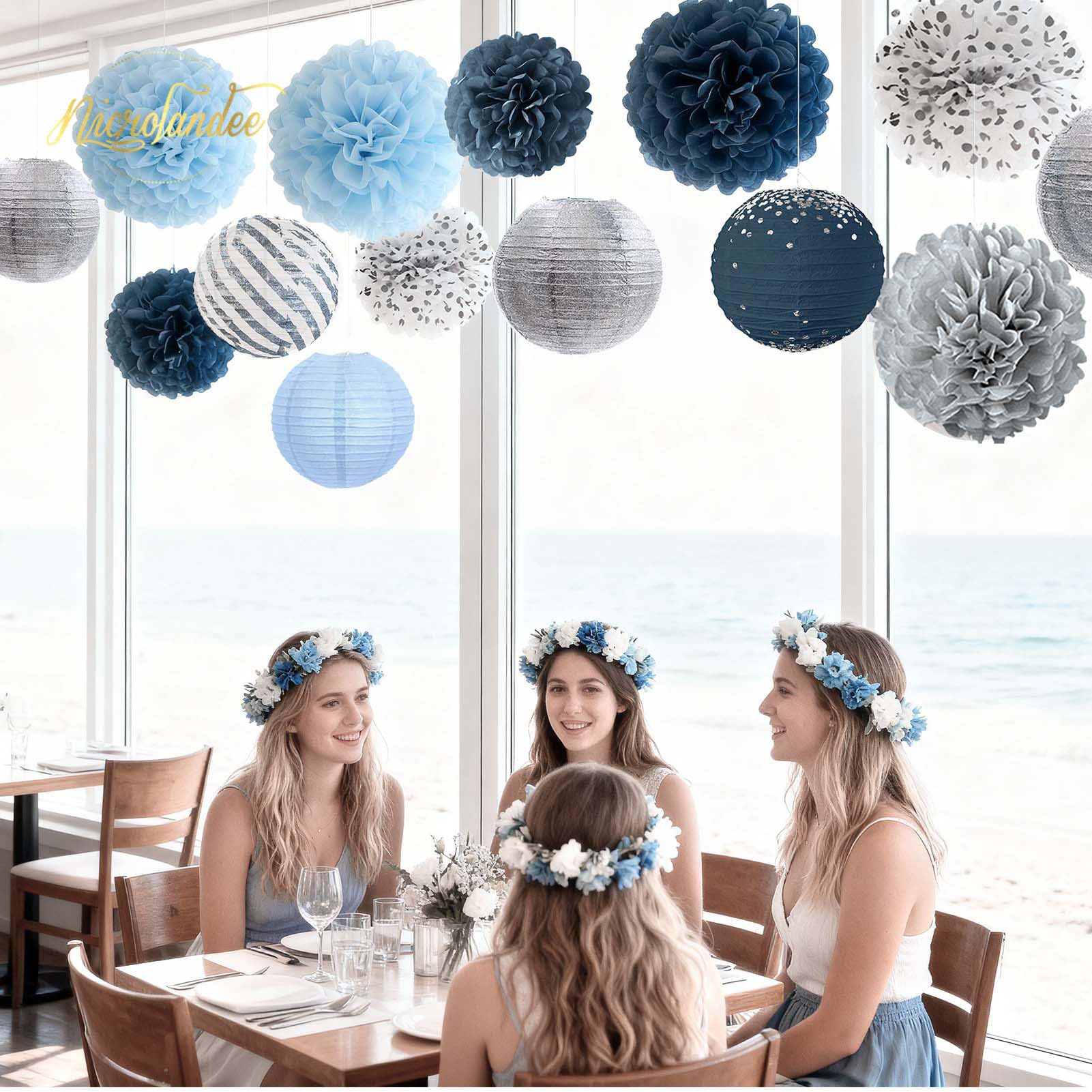 Dusty Blue Party Decorations: This dusty blue party decor will add a romantic touch to party. The color combination of dark blue, dusty blue and gray makes the party more unique and impressive