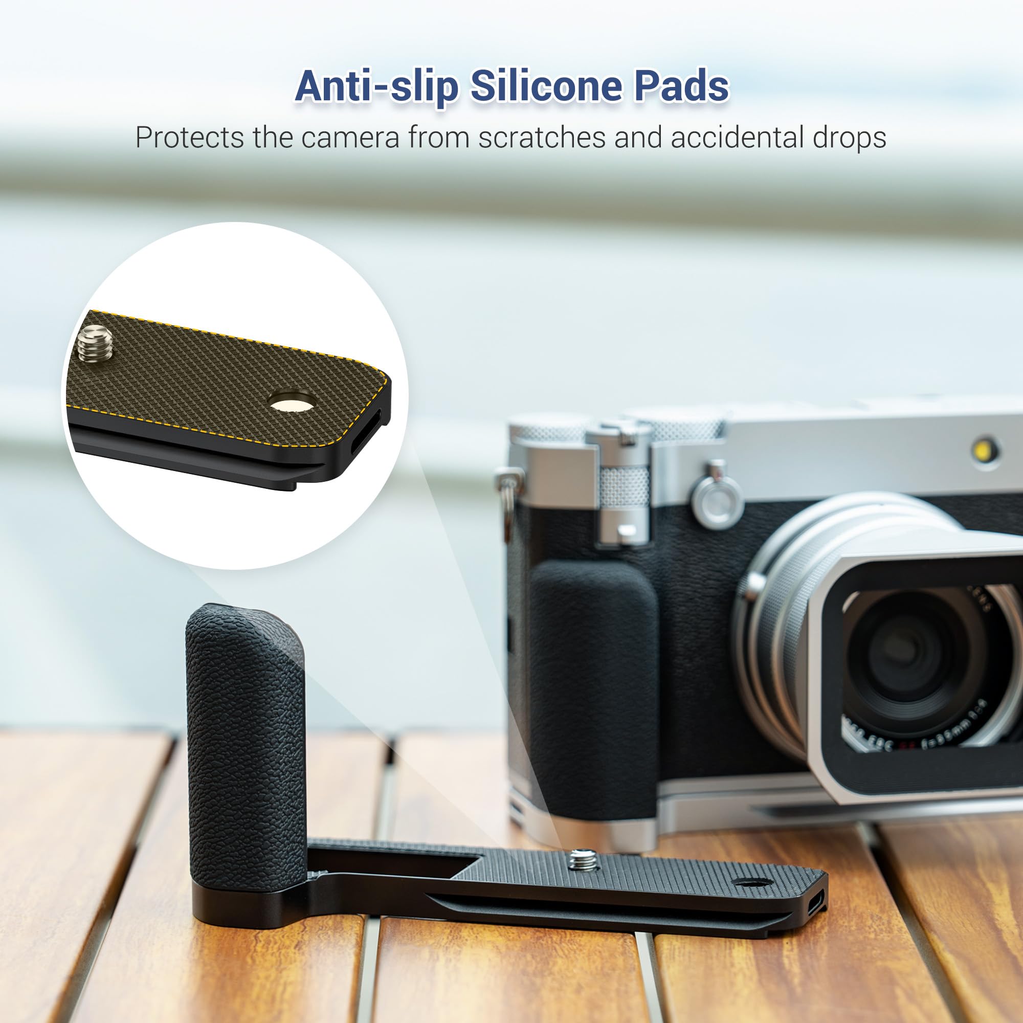 Durable & Comfortable: Made of aluminium alloy, it is sturdy and durable. The soft non-slip silicone on the surface of the grip is comfortable. There is also a silicone pad at the bottom of the handle, which can increase friction and reduce the risk of camera dropping, providing a stable and secure GFX 100RF handgrip.