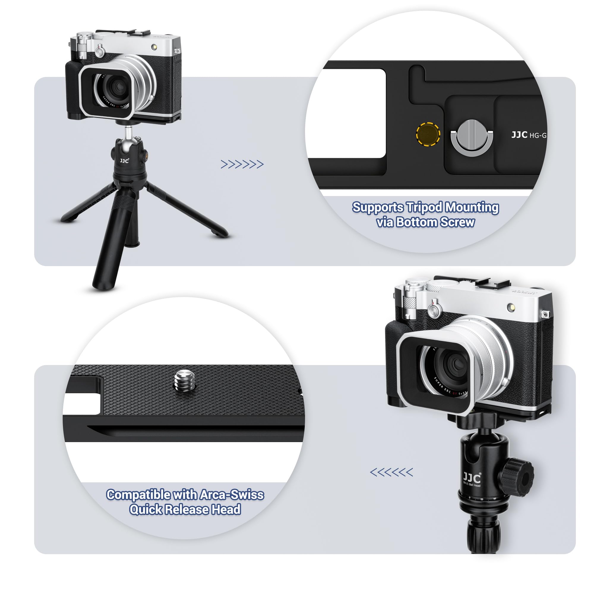 Quick Device Switching: This holder is designed with an Arca-Type quick release plate, allowing you slide this grip with the camera onto an Arca-Type ball head directly. The bottom of the l bracket also has a 1/4"-20 screw hole for mounting the camera to other tripods or devices.(NOT include any tripods)