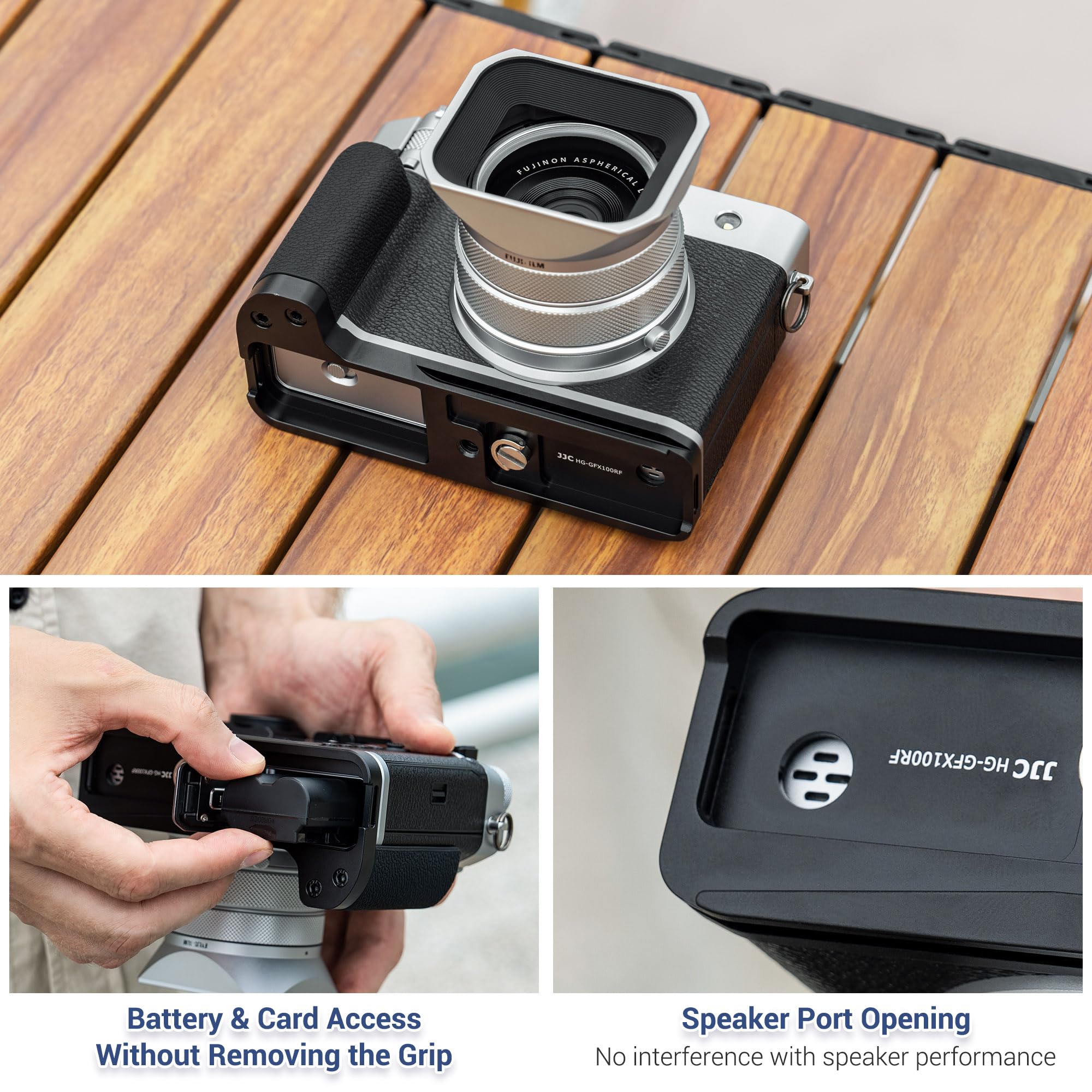 Customized Fit: The GFX 100RF hand grip fits the camera precisely and does not interfere with access to the camera’s ports. The design at the bottom of the bracket allows you to install batteries or memory cards easily without removing the handle and it is designed with a speaker cutout to ensure that audio output is not obstructed.