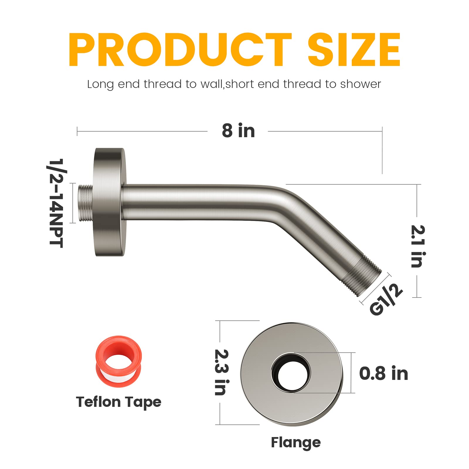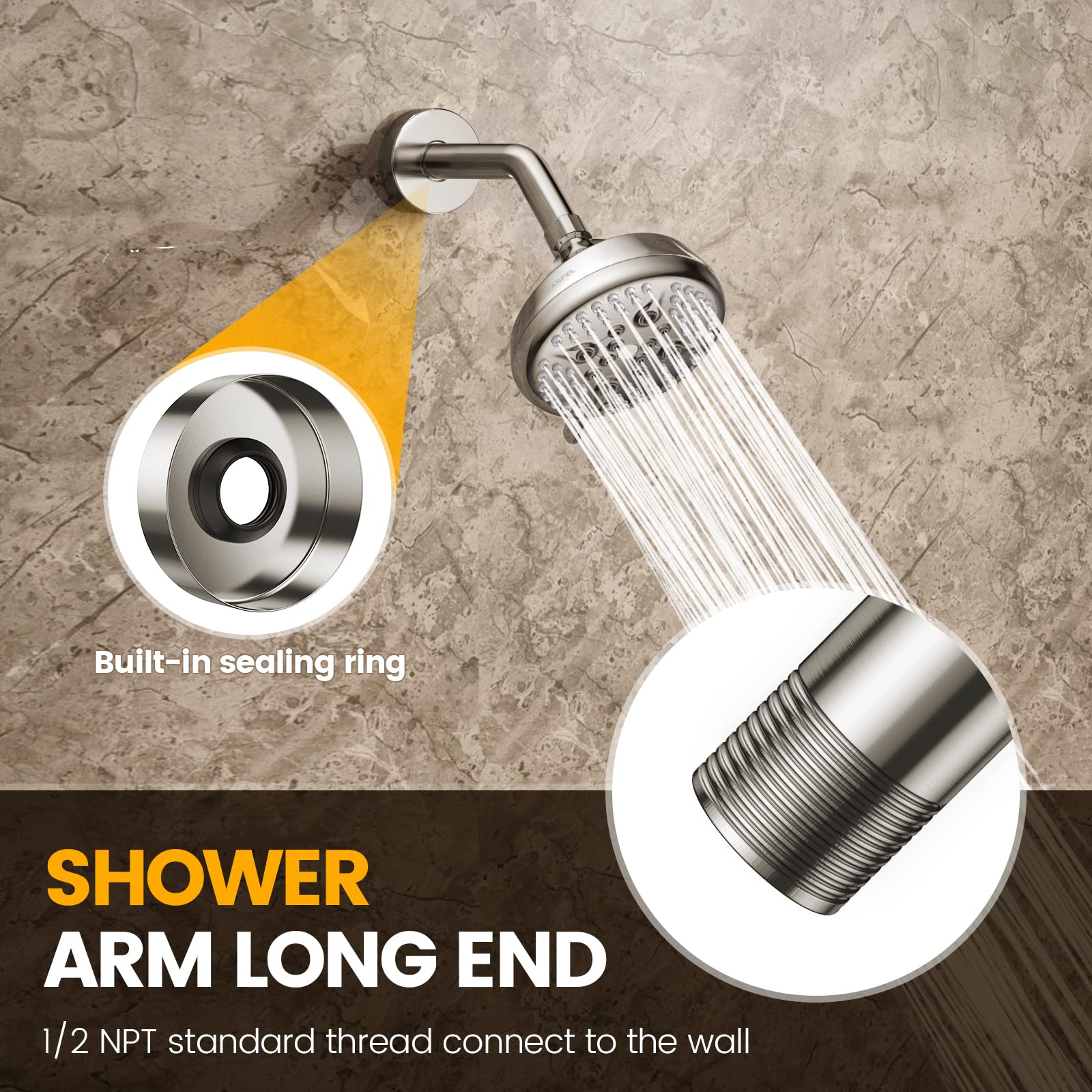 👨🔧【Shower Arm Material】Shower arm and thin flange are all made of SUS 304 stainless steel brushed nickel material. Strong and lasting, no rust.