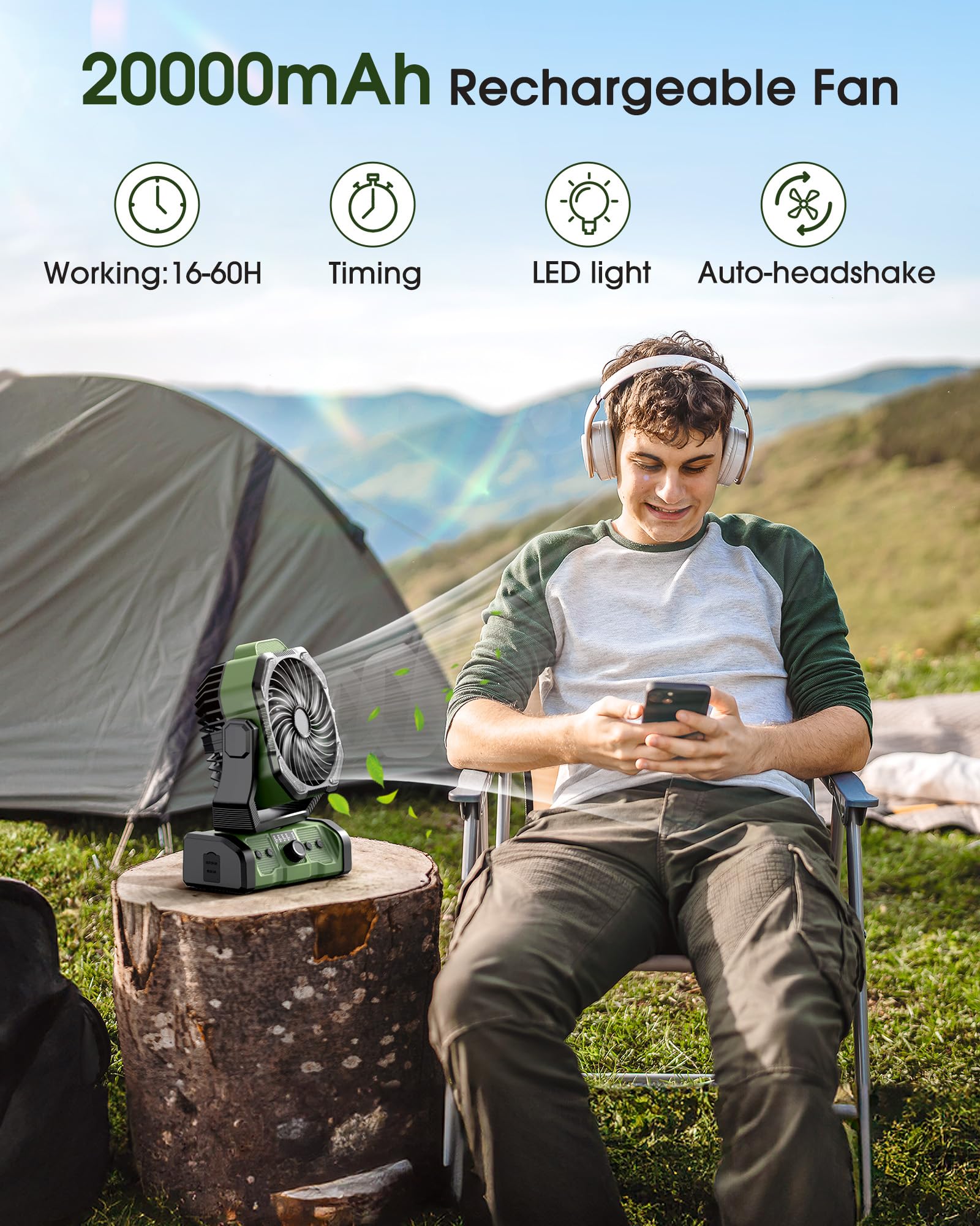 20000mAh Portable Battery Powered Fan: This cooling fan is equipped with a massive 20000mAh rechargeable battery, allowing it to maintain up to 60 hours of working time on low speed. It can also function as a power bank. The side of the fan features a USB-A output and a USB-C input, enabling you to charge your other devices via the USB-A port. This makes it an excellent choice for camping, travel, home, power outages, hurricanes, and more