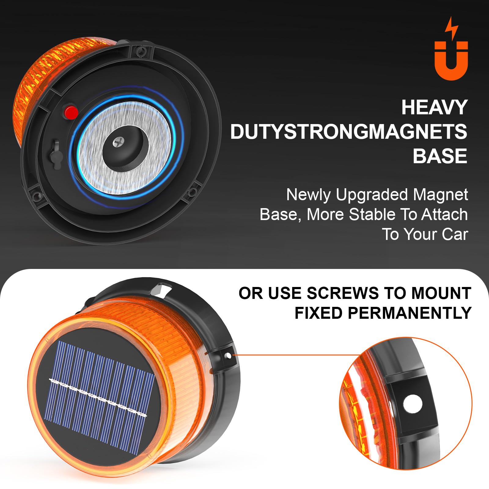 Outdoor Solar Strobe Light: The bright amber lights offer two easy installation options - use the strong magnet to attach it to any metal surface on your vehicle, or secure it with screws for a more permanent setup