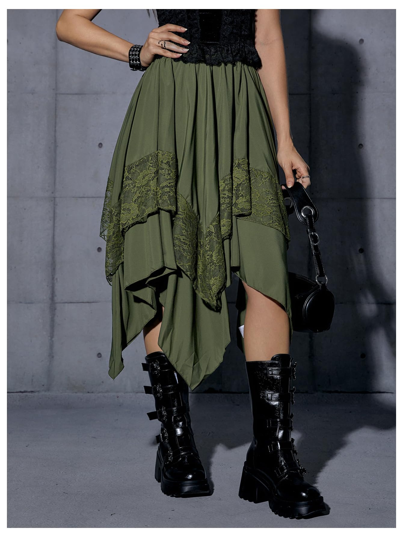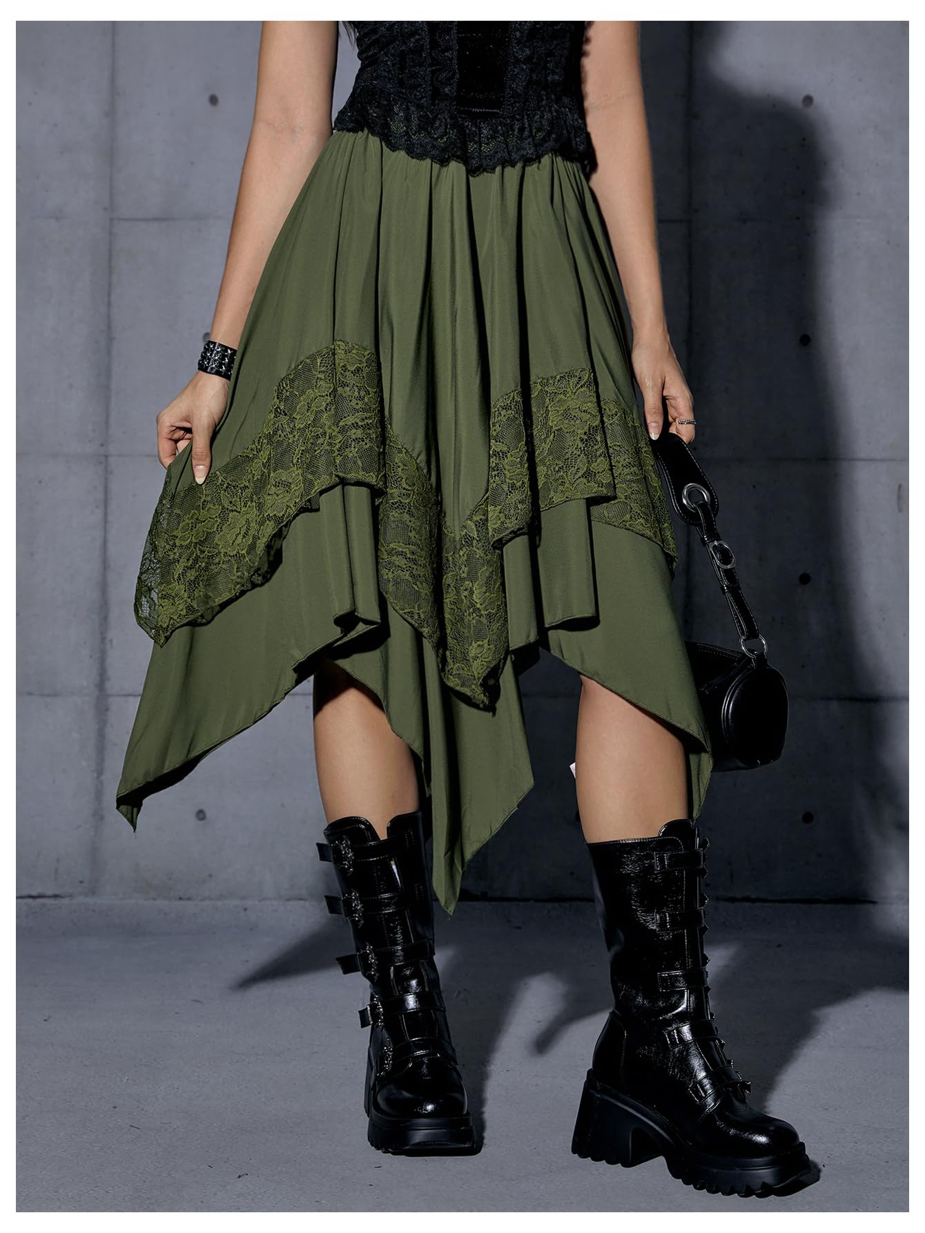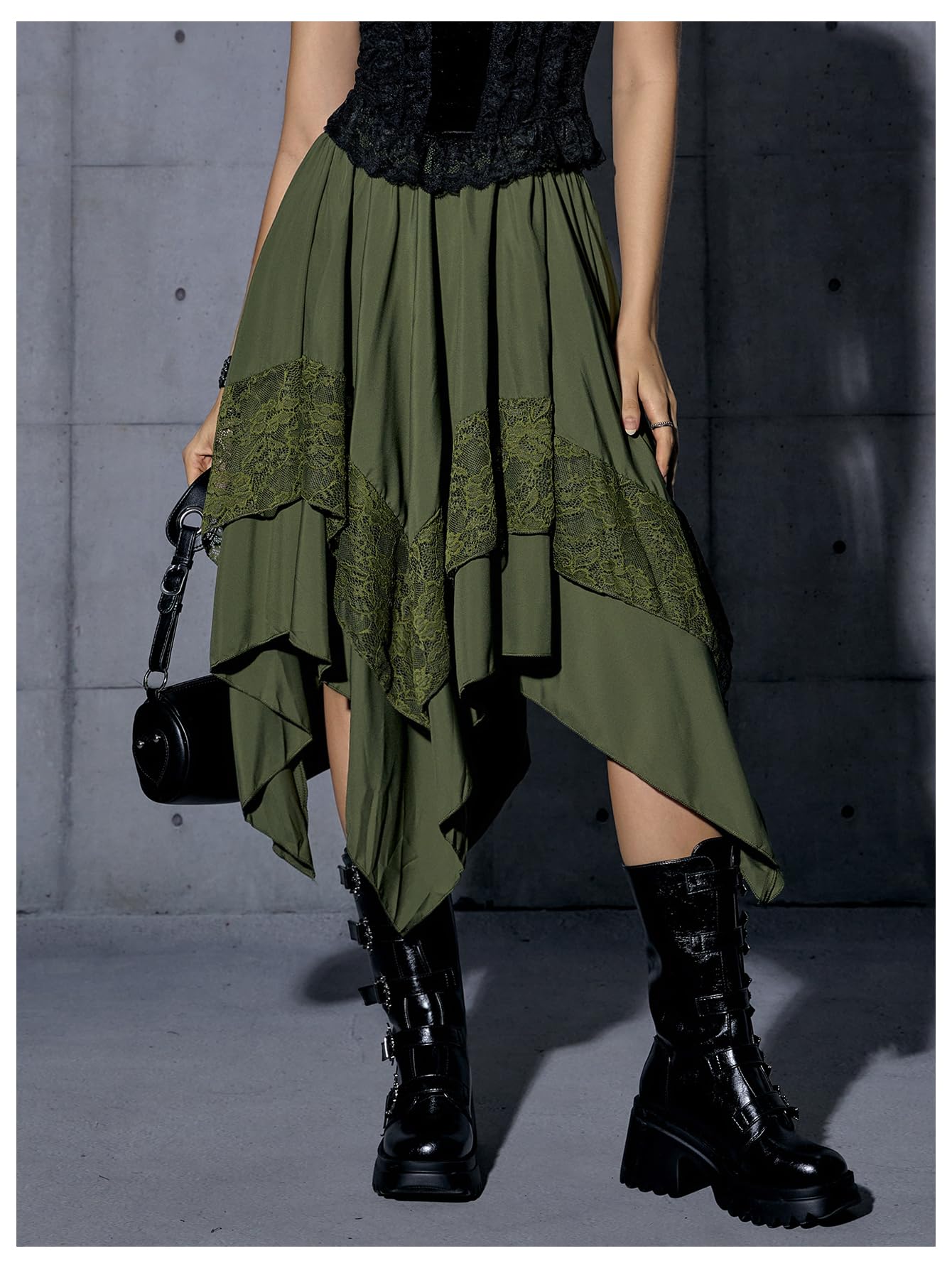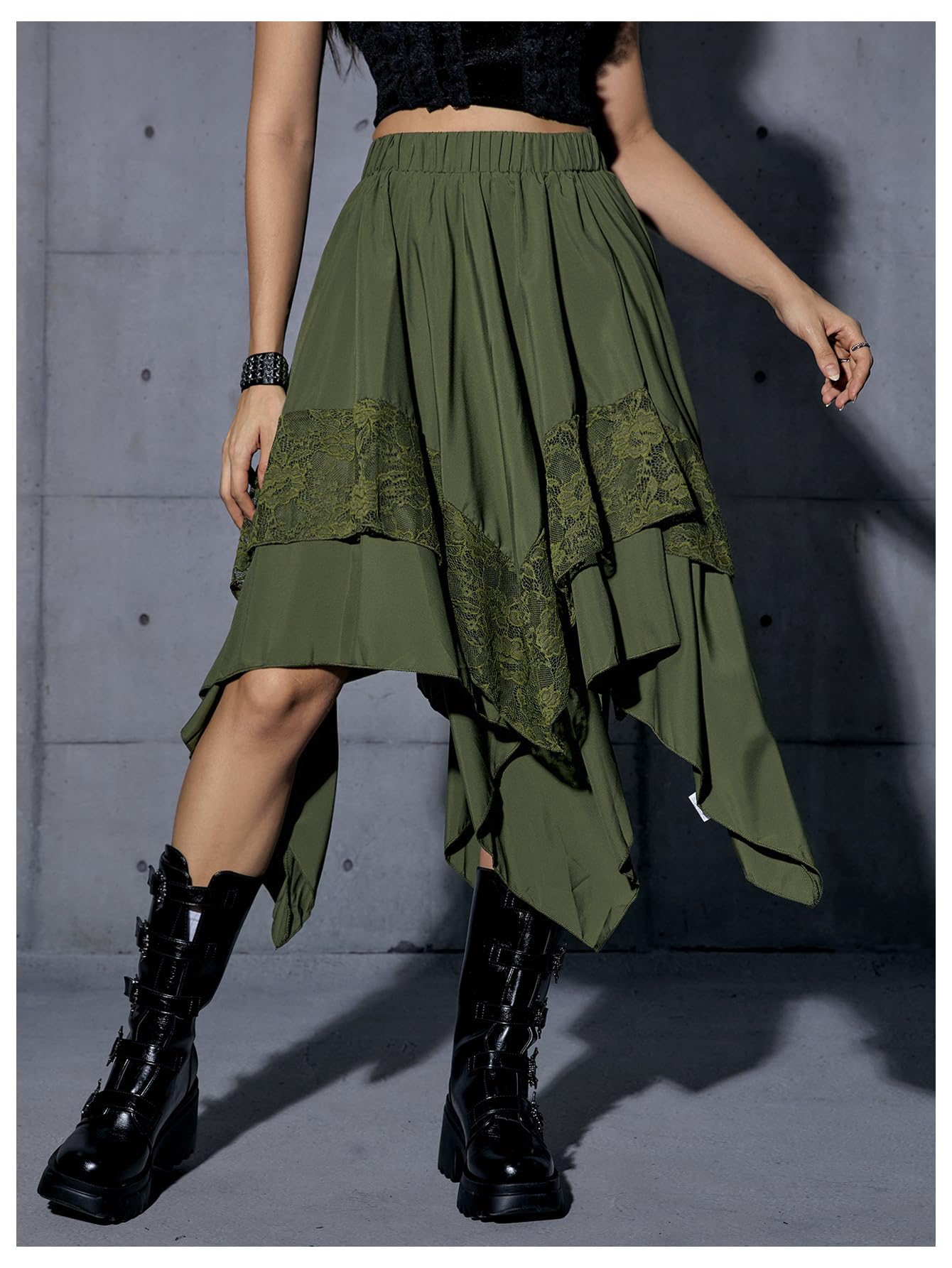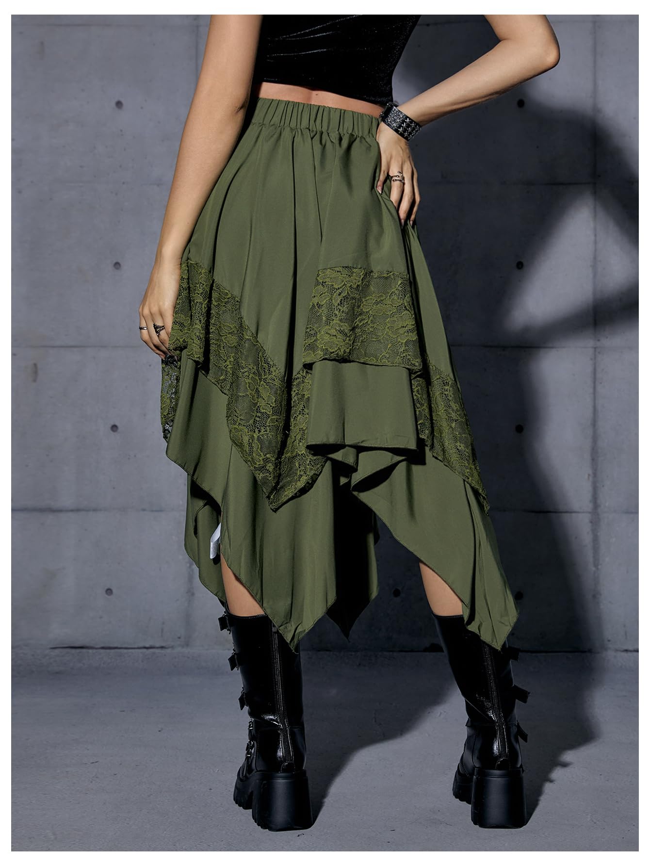 Elastic Waist, Lace Trim, Asymmetrical High Low Hem, A Line, Flowy, Gothic Steampunk Skirt, Casual Midi Skirt