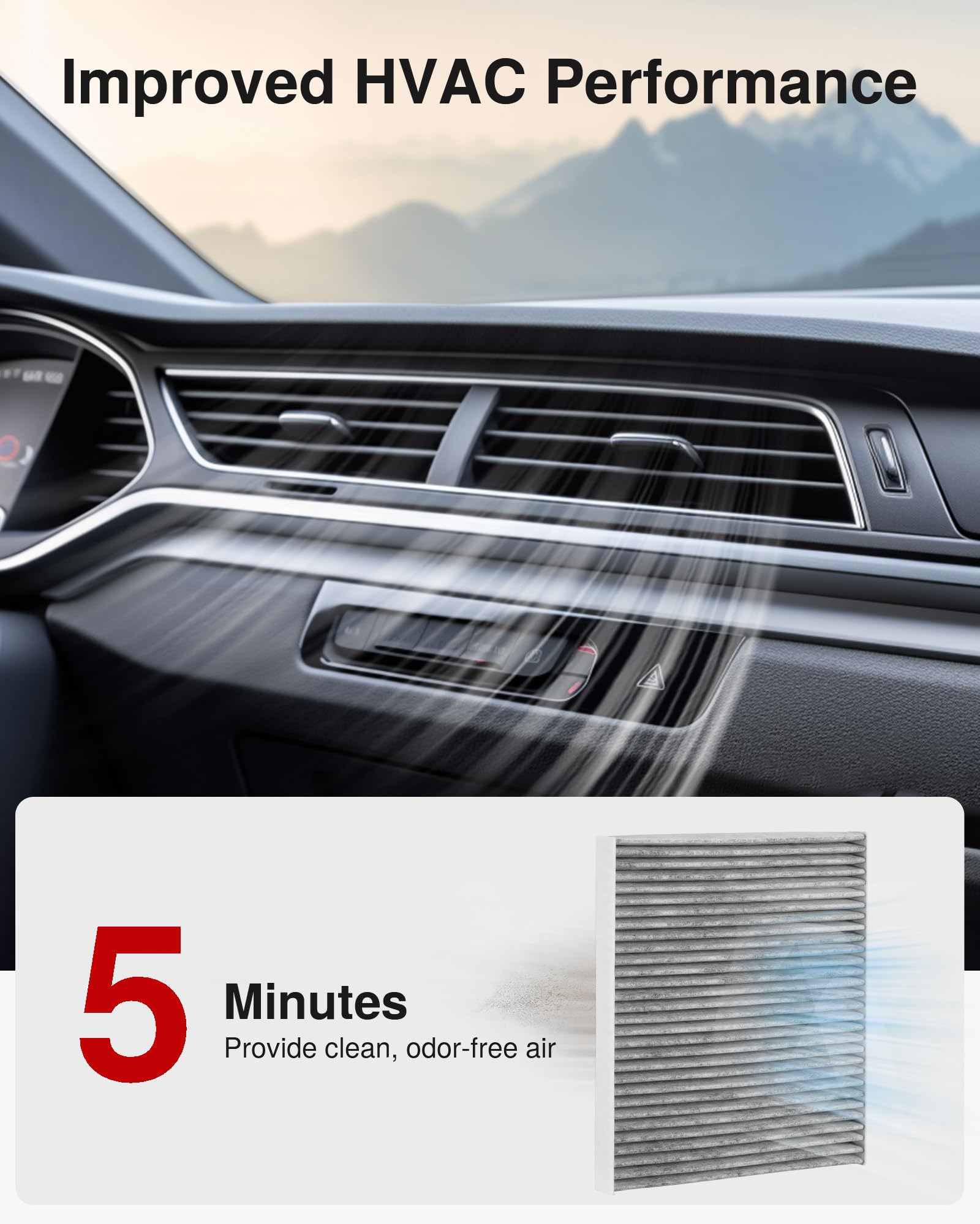 Enhances HVAC performance: It is recommended to replace your cabin air filter every year or every 12,000 miles. For optimal performance, those driving in heavily polluted areas or on dirt roads should change it every 5,000 miles. These filters help maintain the efficiency and longevity of the vehicle's heating, ventilation, and air conditioning (HVAC) system, maintaining optimal airflow and reducing strain on the system.