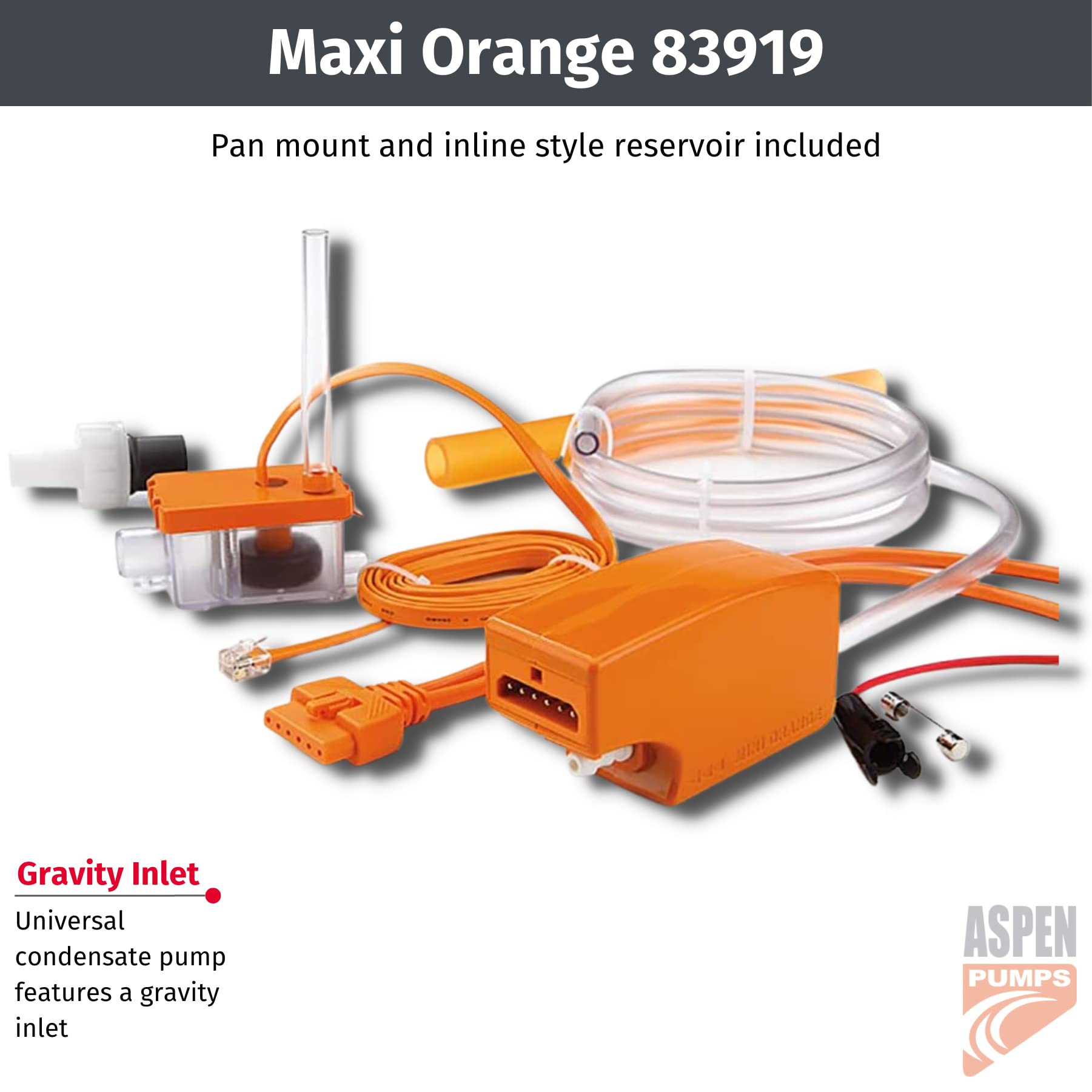 Product Description Maxi orange pumps are designed for mini-split air conditioner systems. separate pump and reservoir design. Pump installs remotely above ceiling or in casing of mini-split evaporator where space permits. Automatic condensate pump offers an easy and versatile install. Maxi orange has modular terminals for quick connections. Maxi orange pump offers easy maintenance; cleanable and replaceable pump filter;. Easy access design. 100-250V; condensation removal pump; self priming and slim profile. Resistant to shock, vibration, moisture, chemical, and promotes sound dampening. Fully potted electronics and included anti-siphon device. FOR THE TRADESMAN: RectorSeal is recognized as a leading provider of quality solutions for the professional trades serving heating, ventilation, and air conditioning (HVAC/R), plumbing, electrical, and construction markets. From the Manufacturer Our Aspen line is quiet, reliable and versatile. Available in 2 configurations our Maxi pumps can put unwanted condensate in its place. The Maxi Orange comes with 2 different reservoir options and can be remote mounted for easy access. Can be used with units up to 5 tons.