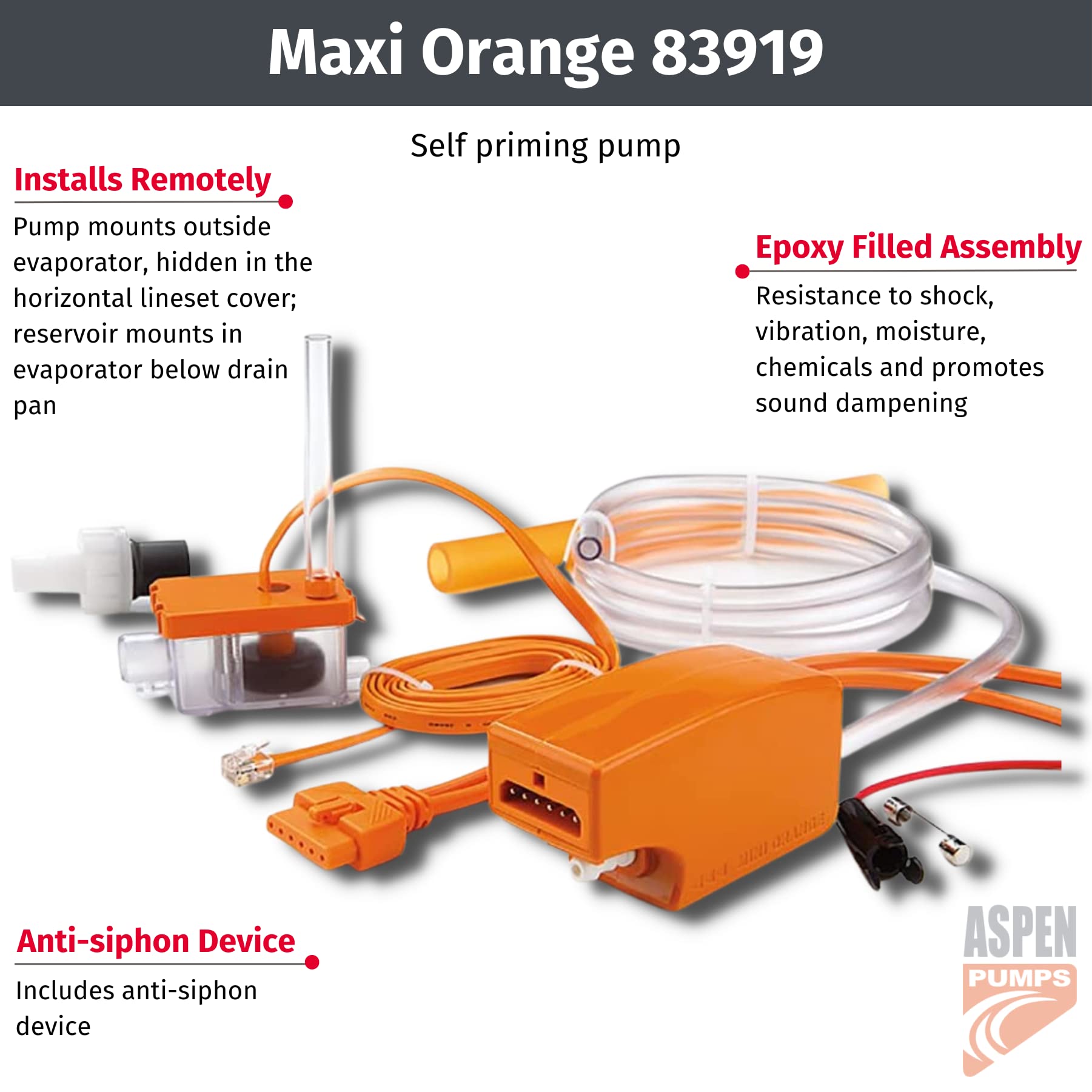 EASY INSTALLATION: Automatic condensate pump offers an easy and versatile install; maxi orange has modular terminals for quick connections; quiet and fully potted (complete assembly is epoxy filled for resistance to shock, vibration, moisture, chemical and promotes sound dampening
