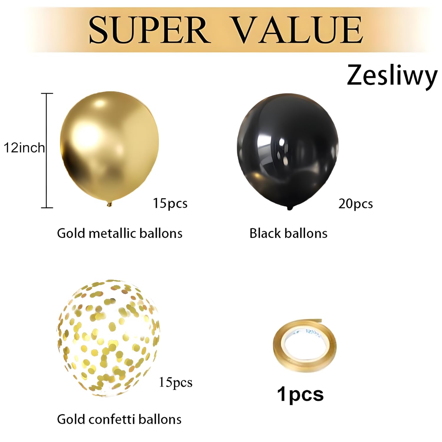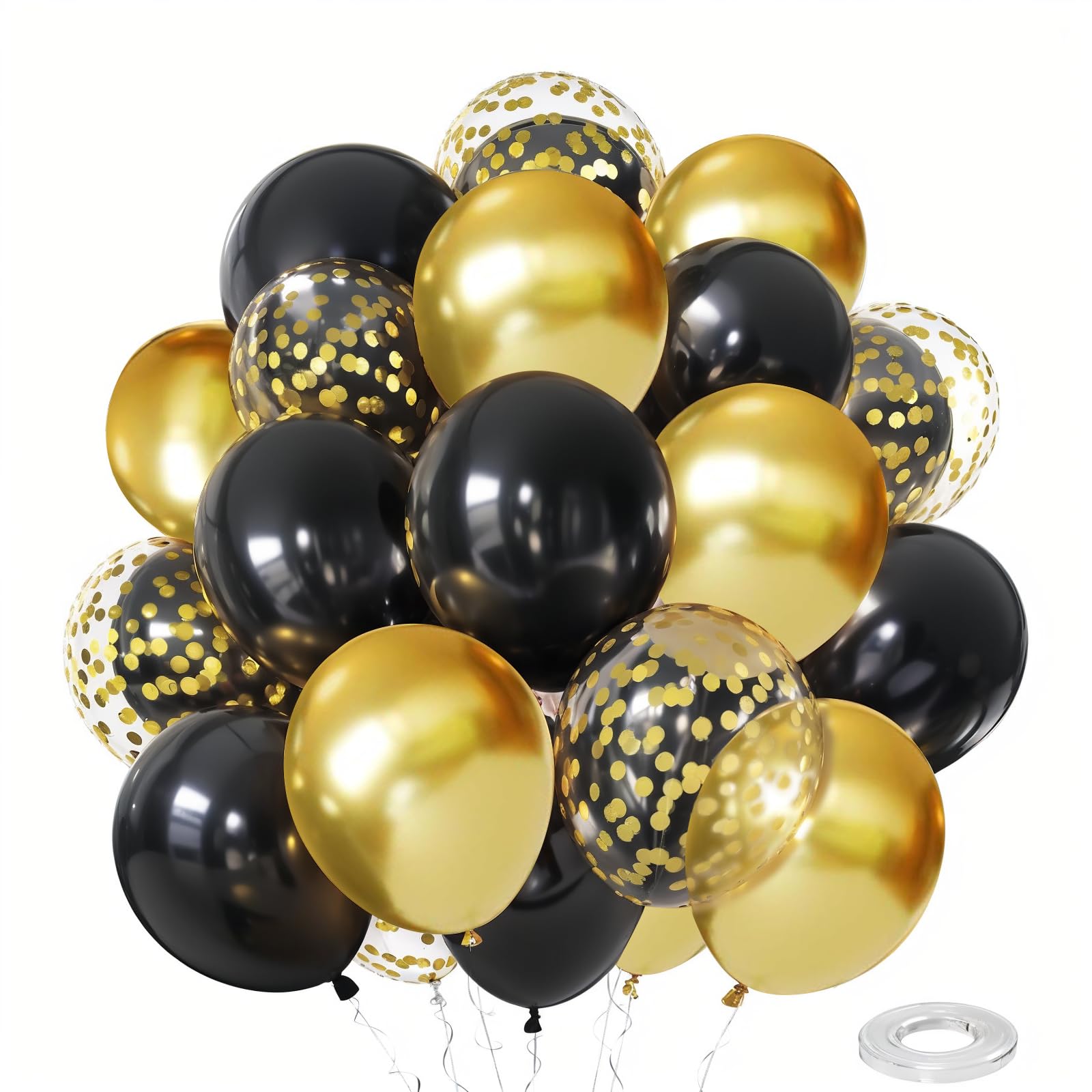 Gold Black Balloons Set: The gold and black confetti balloons come with : black latex balloons 20pcs, gold metallic balloons 15pcs, gold confetti balloons 15pcs, and one gold ribbon (33 feet total). Offering you a good choice for making nice indoor or outdoor decoration, to create more joyful time for families and friends.