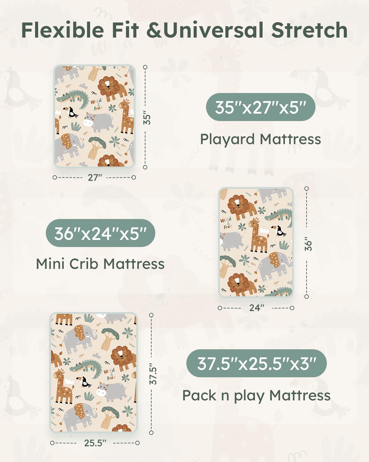 Measured 38''X 26'', our pack and play sheets securely fit pack n play crib mattress, mini crib and playard mattresses. 5-inch deep pocket offers safe and reliable 360° coverage, providing ultimate protection for your exquisite mattress.