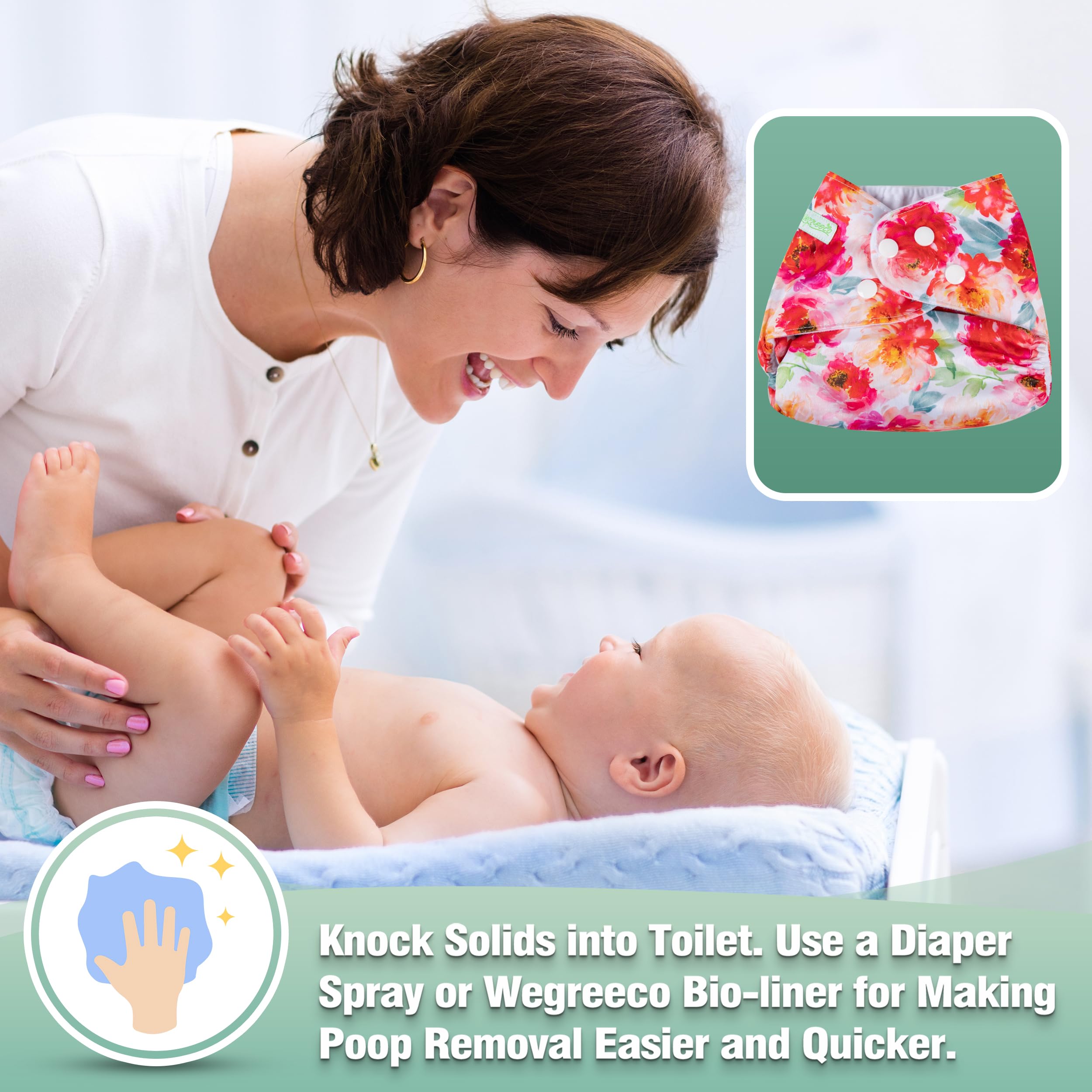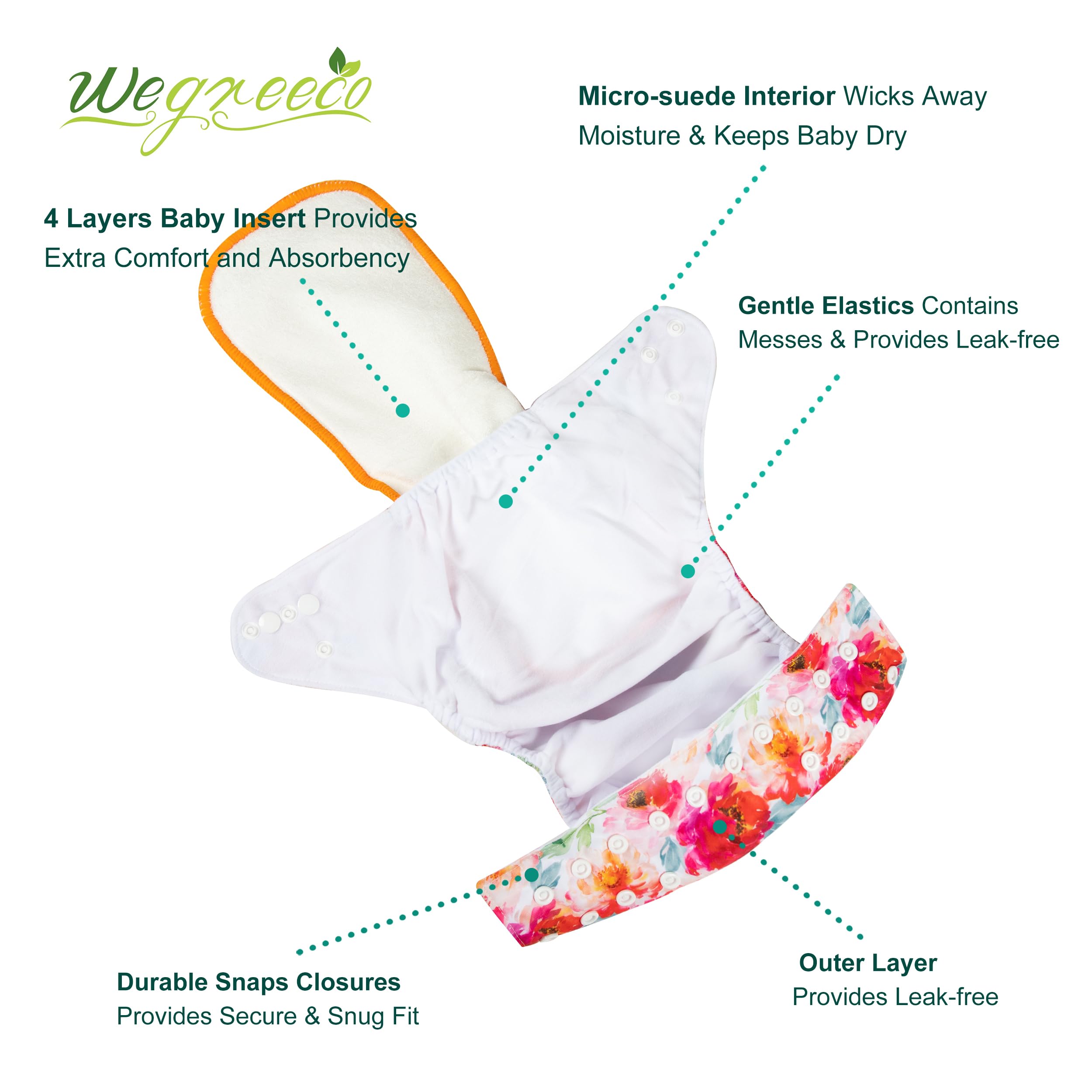 One Size Adjustable Diaper: Three rows of adjustable snaps to allow for a small, medium, large size in one diaper; Usually fit zero-two years' baby; If you are looking for a pocket diaper to last through your baby’s infancy, toddlerhood and even future babies; Wegreeco baby diapers grow with your baby