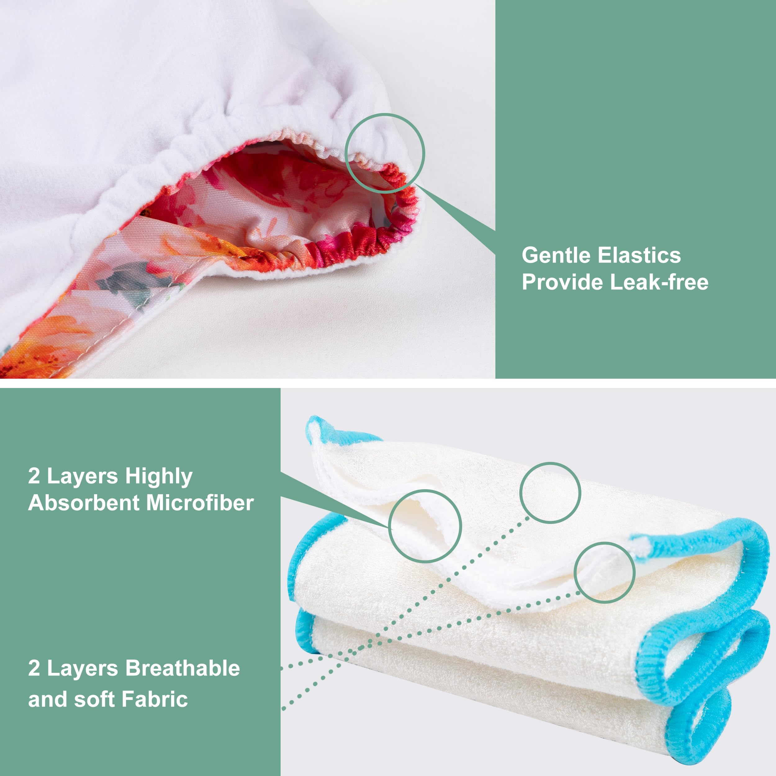 Absorbent and Soft Insert: Inserts are made of 4 layers fibre, the strong absorbent material with breathability and softness is gentle on your baby’s bottom, keep your baby comfortable and happy; The inner suede cloth touches baby, and wicks moisture away from baby's bottom to the insert