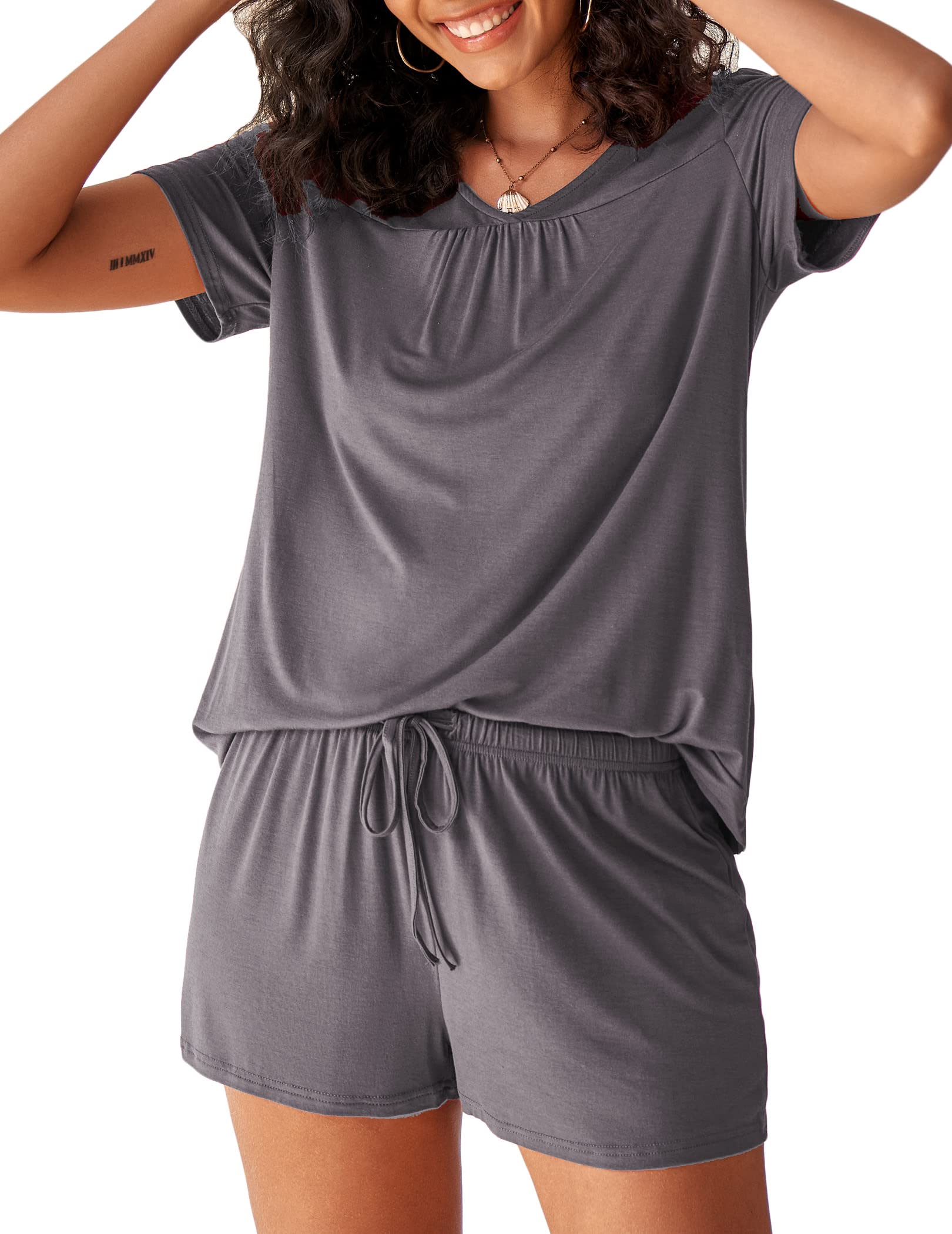 This soft pajama top features V neck, short sleeve, pleated front neckline,and the comfy modal pajama shorts is designed with elastic waist, drawstring and thigh-length